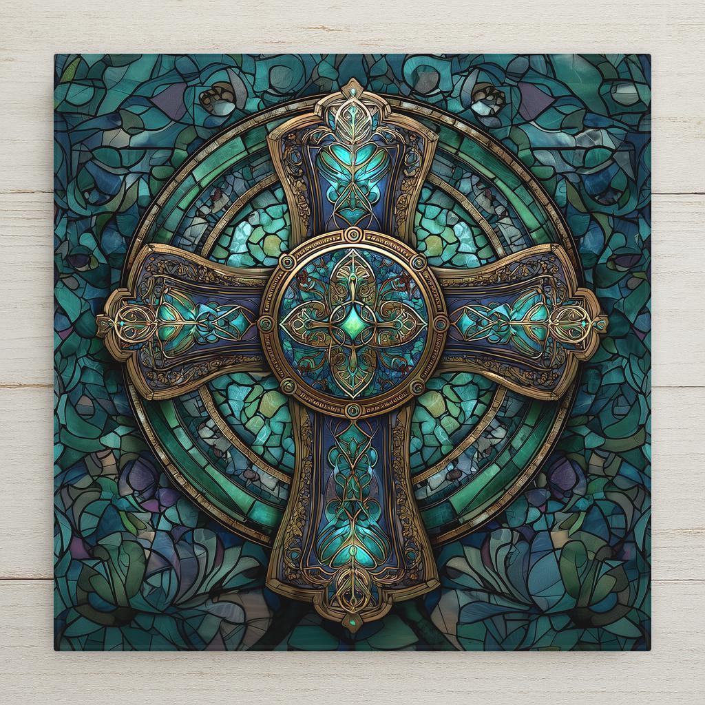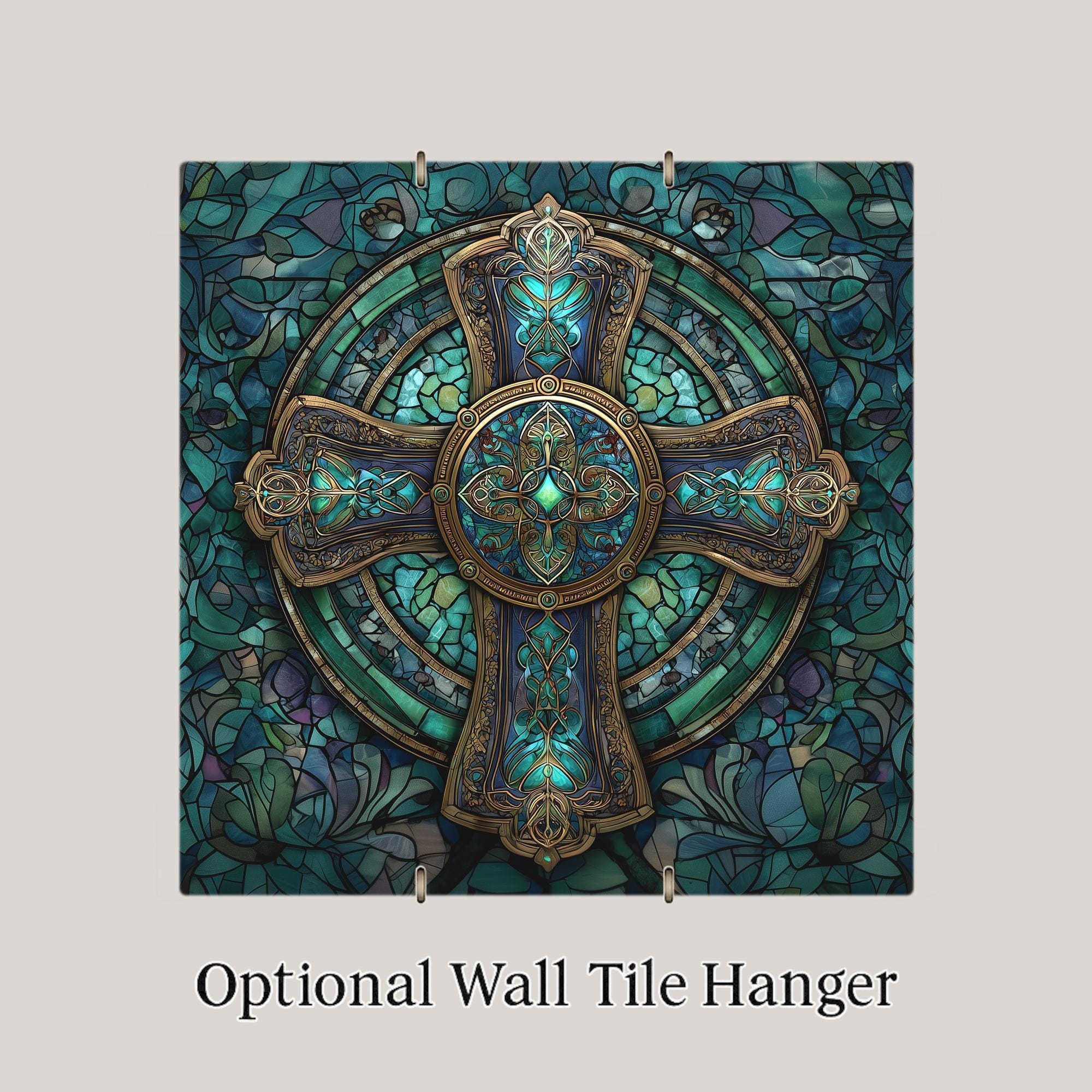 Inspired by traditional cathedral stained glass and Celtic symbolism, this ceramic tile captures the strength and unity represented by the Celtic cross. The circular halo symbolizes eternity, while the layered teal mosaic background adds richness and calm.