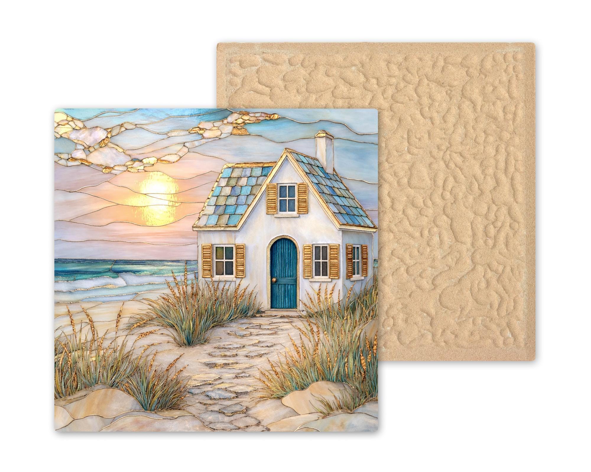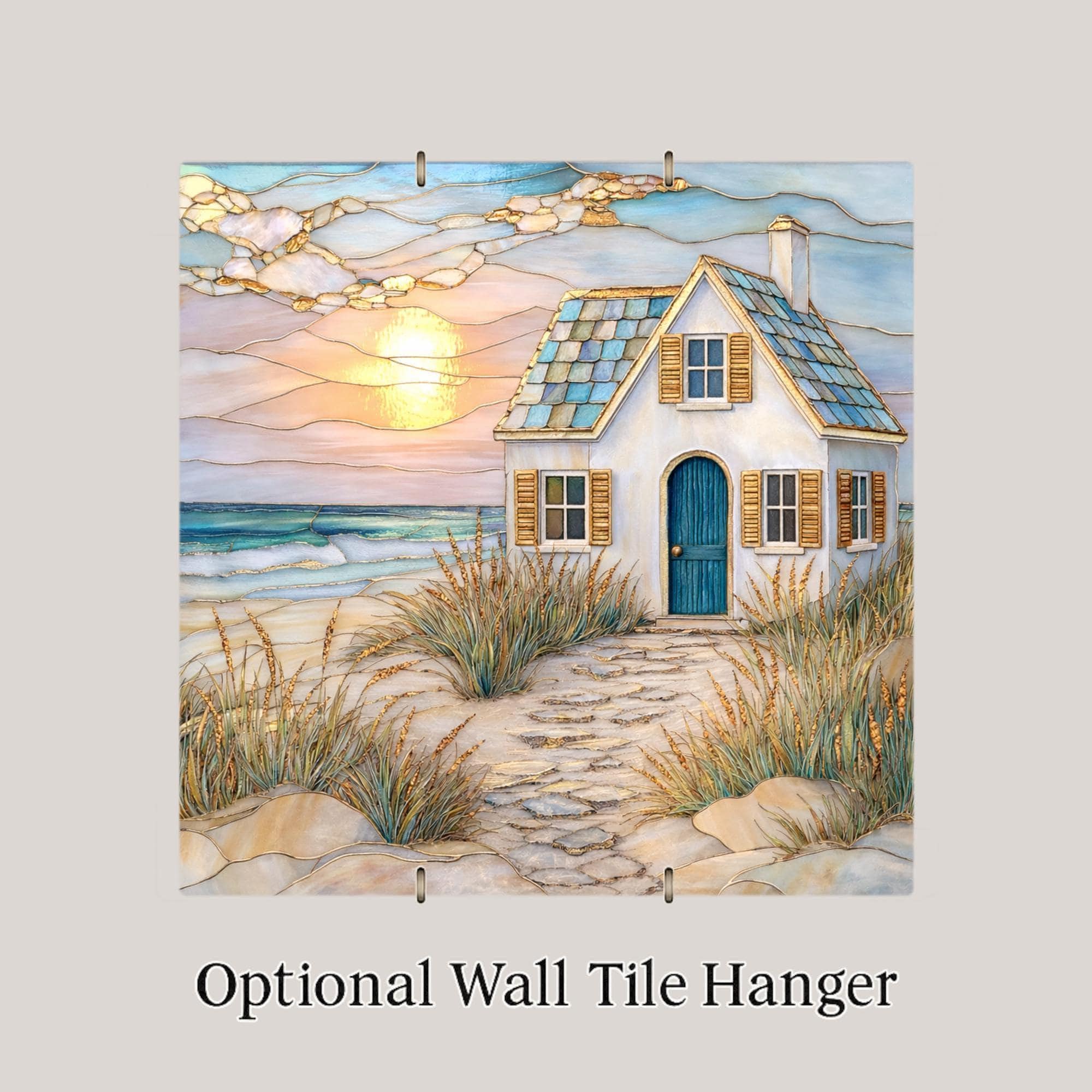 Inspired by quiet evenings along the shoreline, this coastal cottage ceramic tile captures the glow of sunset over the sea. Golden light reflects across gentle waves while a small beach house rests among dune grasses. The stained glass mosaic styling adds warmth and artistic charm while keeping the piece clean and timeless.
