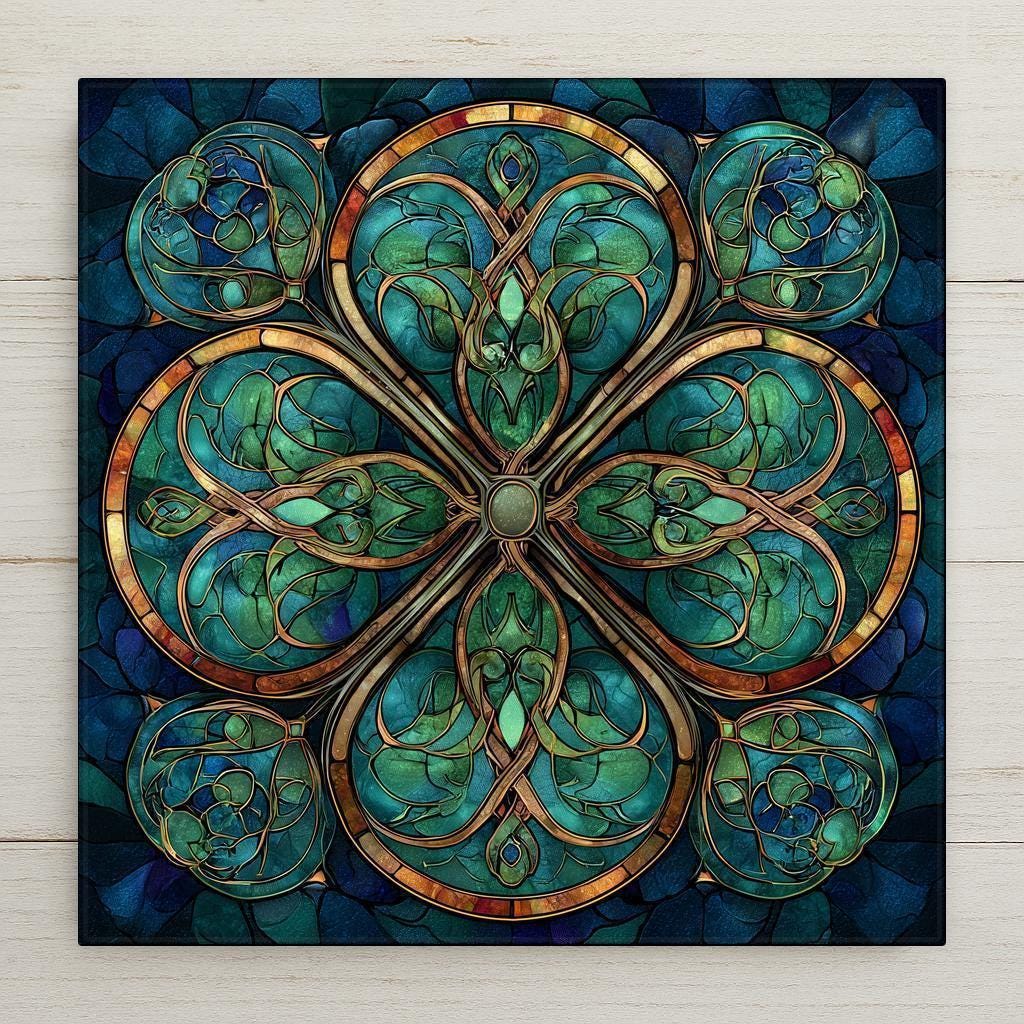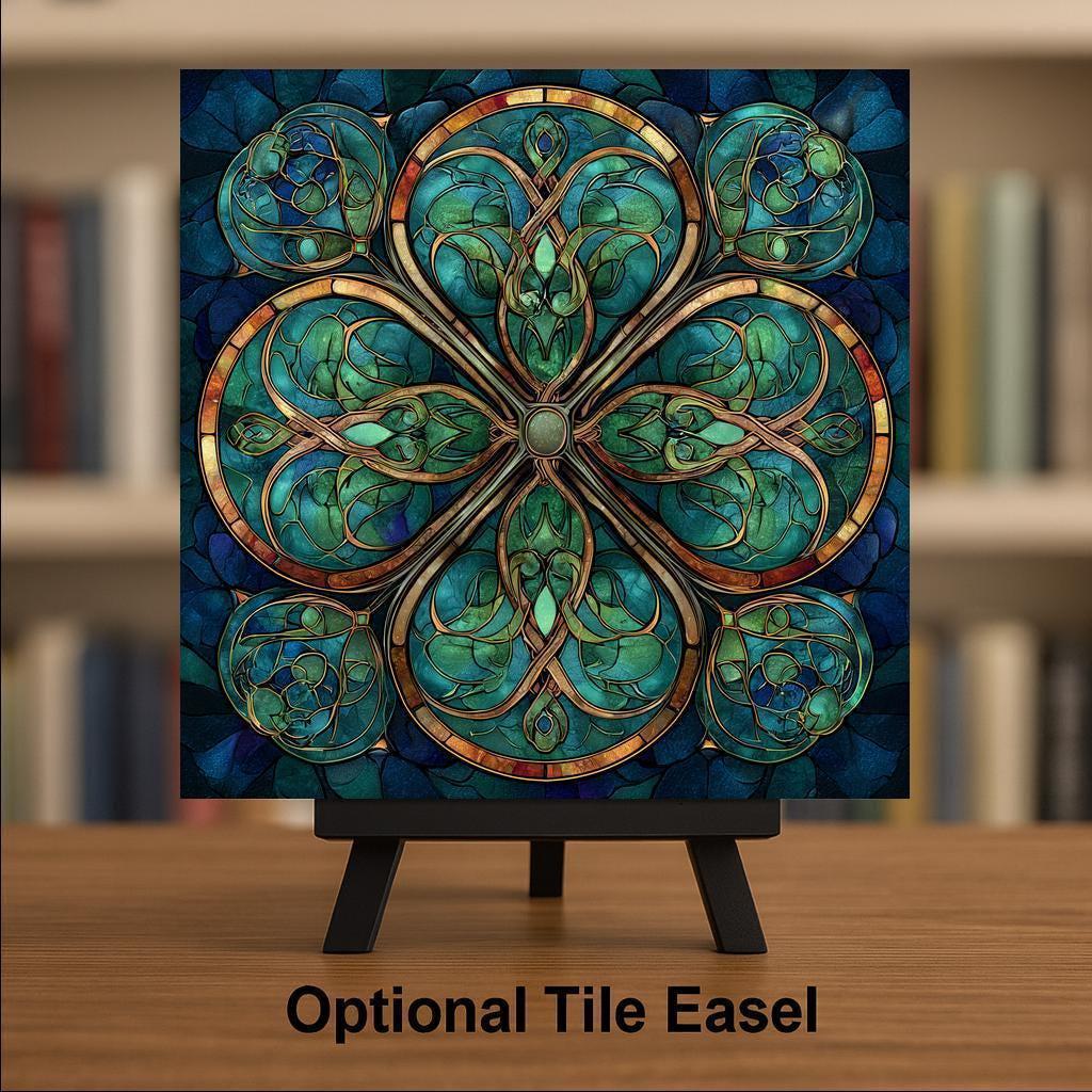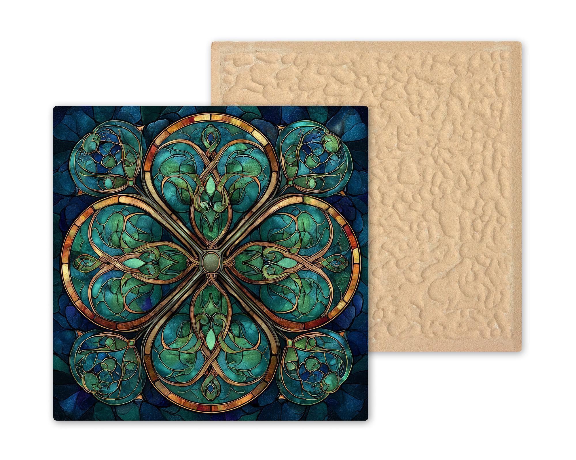 Inspired by traditional Celtic symbolism and stained glass cathedral windows, this ceramic tile captures the harmony of interconnected knotwork and nature forms. The layered greens create a grounded, earthy energy, while the gold detailing adds warmth and heirloom appeal.