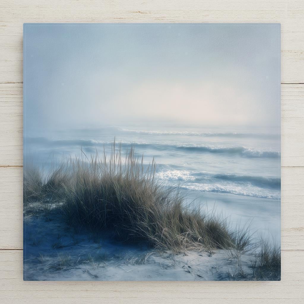 Inspired by quiet early mornings along the shoreline, this ceramic tile captures the softness of sea mist and gentle rolling surf. The muted blues and sandy neutrals create a light, breathable atmosphere that feels restorative and calm.