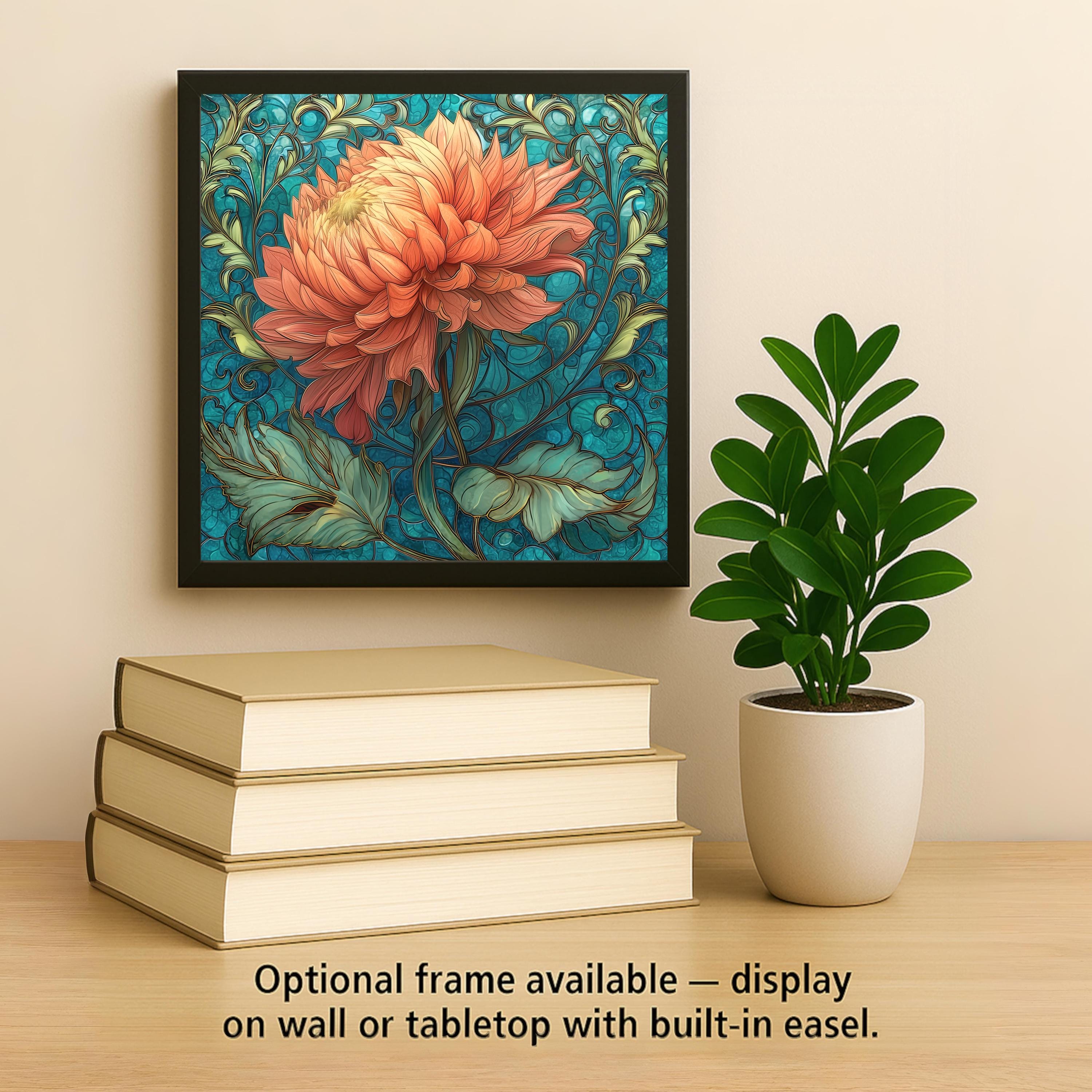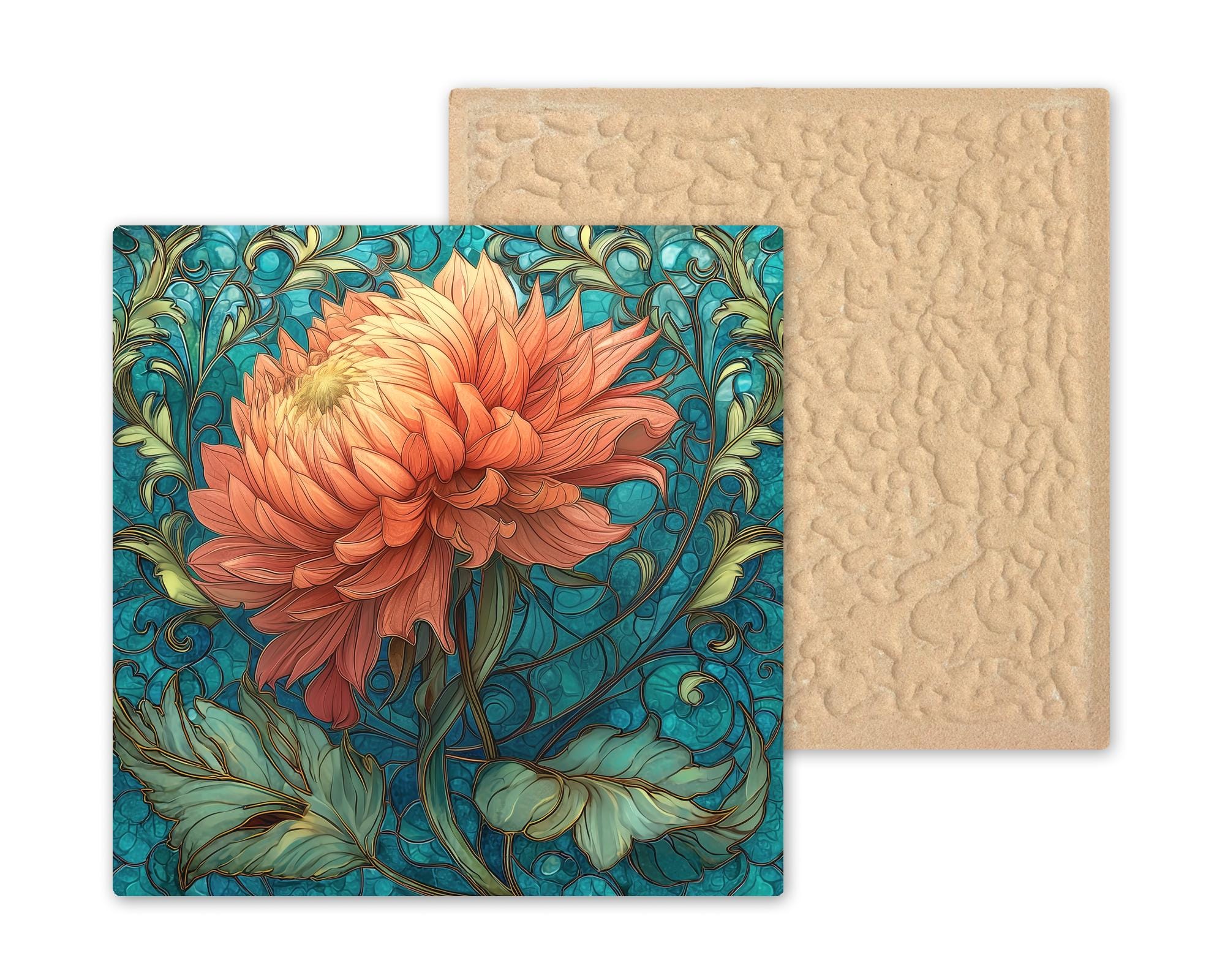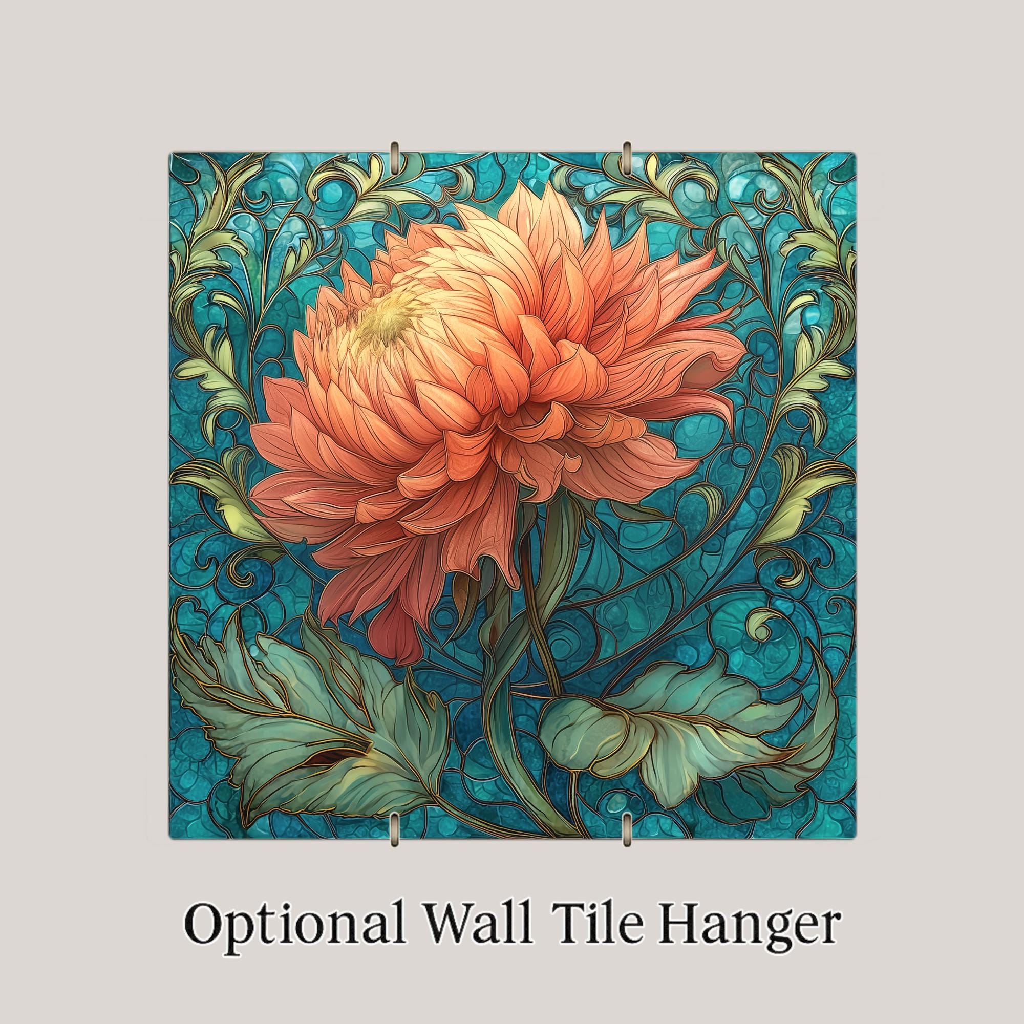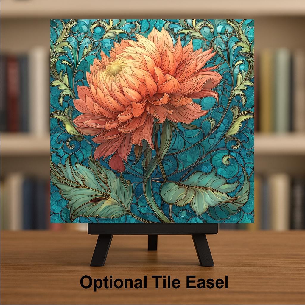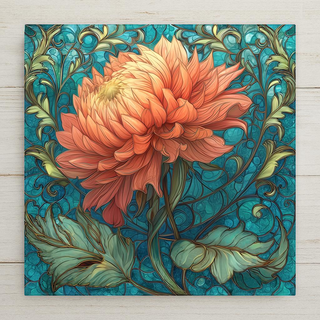 Inspired by classic Art Nouveau botanical illustration, this ceramic tile celebrates the dramatic form of the dahlia with soft blush and coral-pink layers. The flowing teal vines create graceful movement while the bloom becomes the focal point.