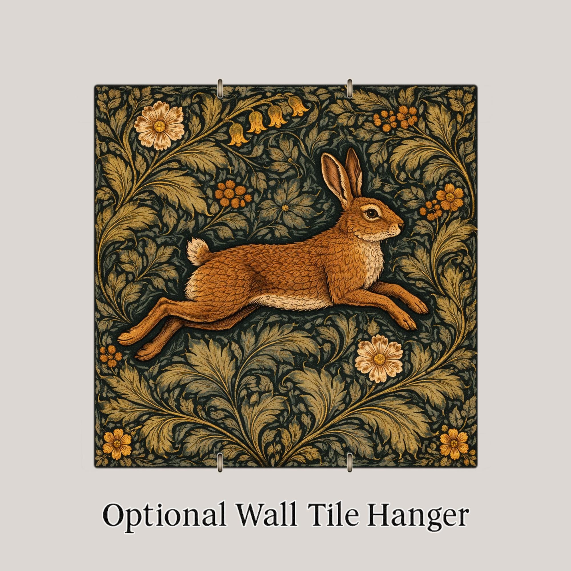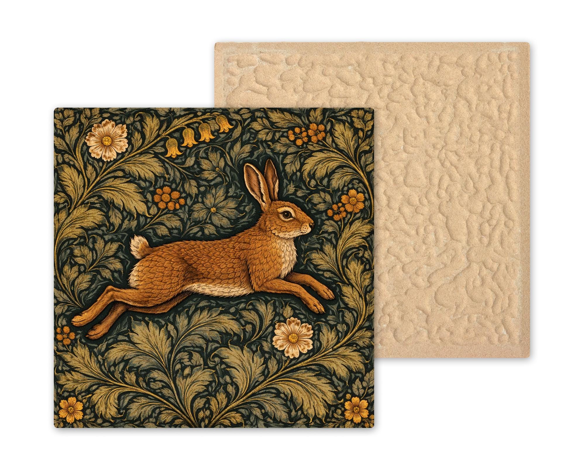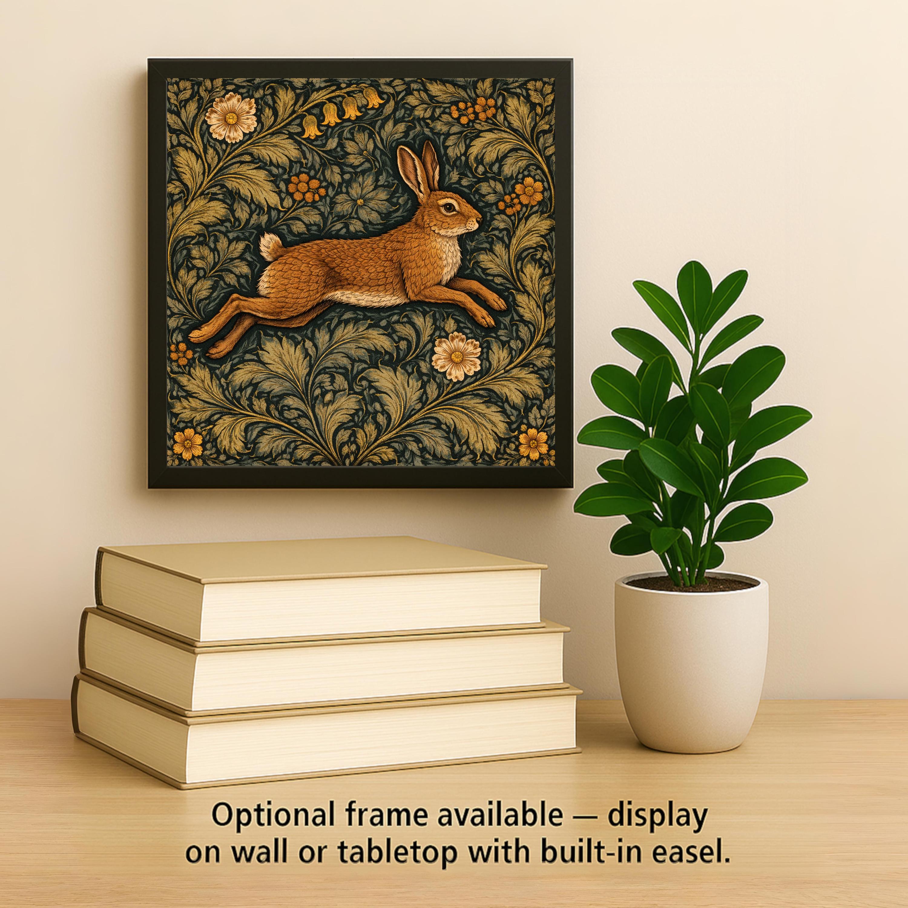 This design emphasizes flowing foliage and balanced rhythm, hallmarks of classic Arts and Crafts textile patterns. The leaping hare introduces movement while maintaining symmetry within the decorative layout.