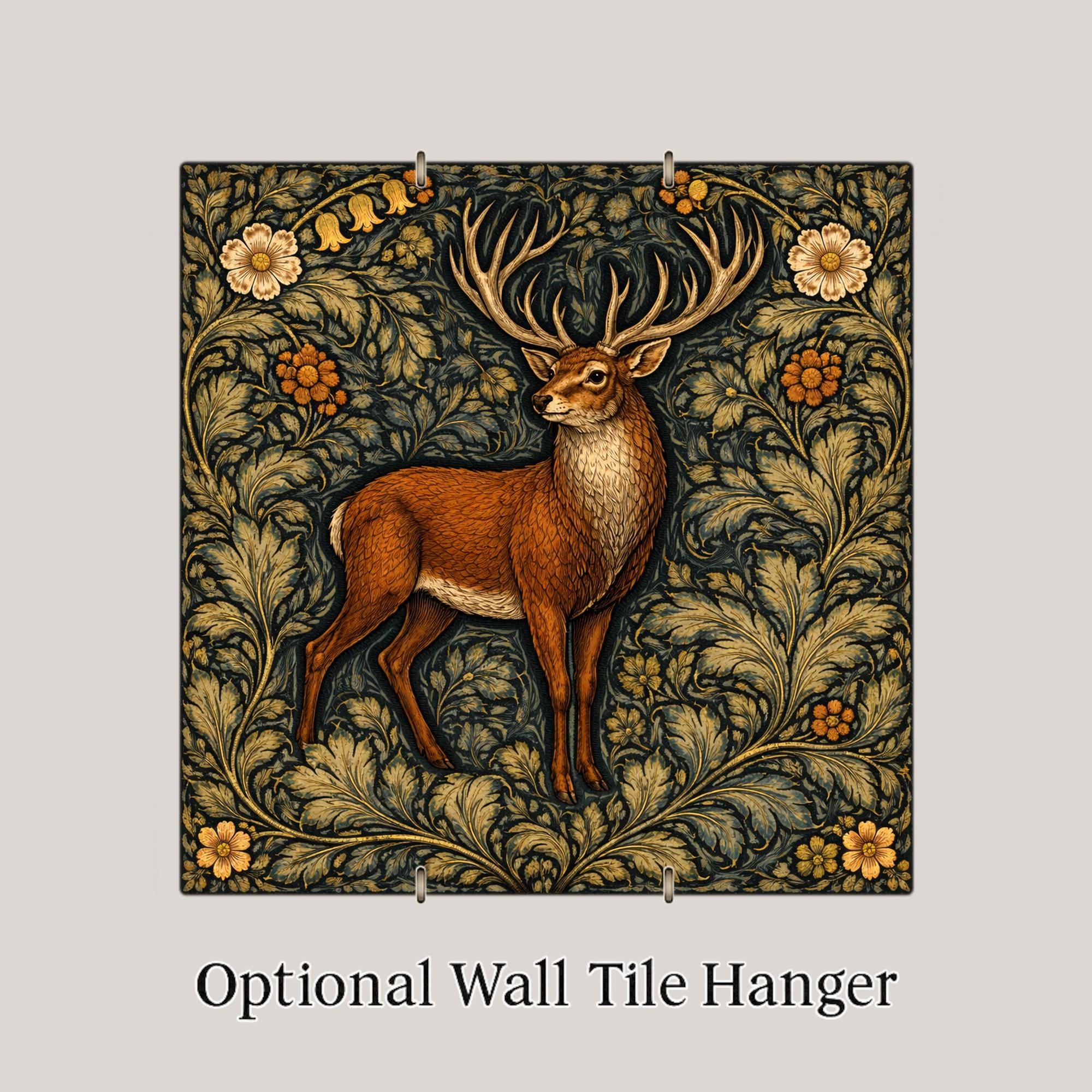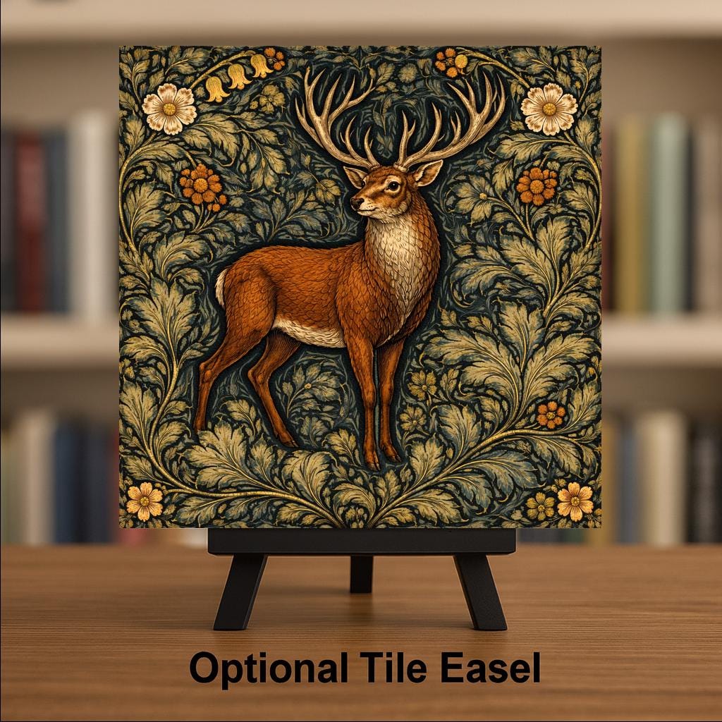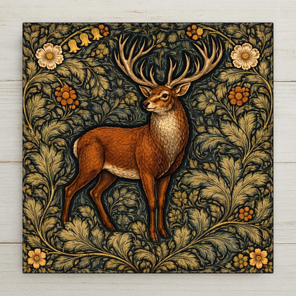 This design emphasizes symmetry, heritage color palettes, and decorative rhythm. The stag serves as the anchor piece within the woodland collection, offering a bold yet refined focal point.