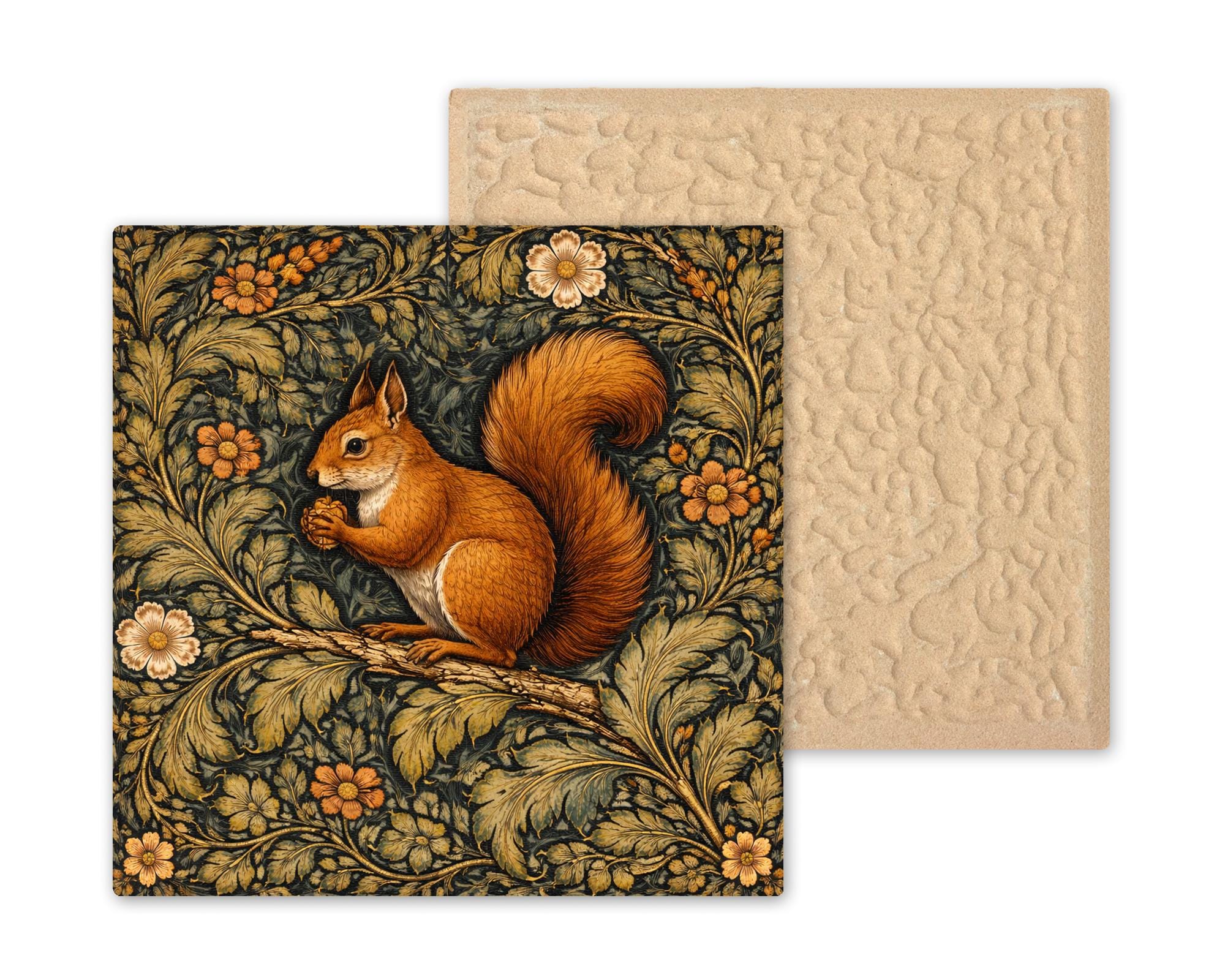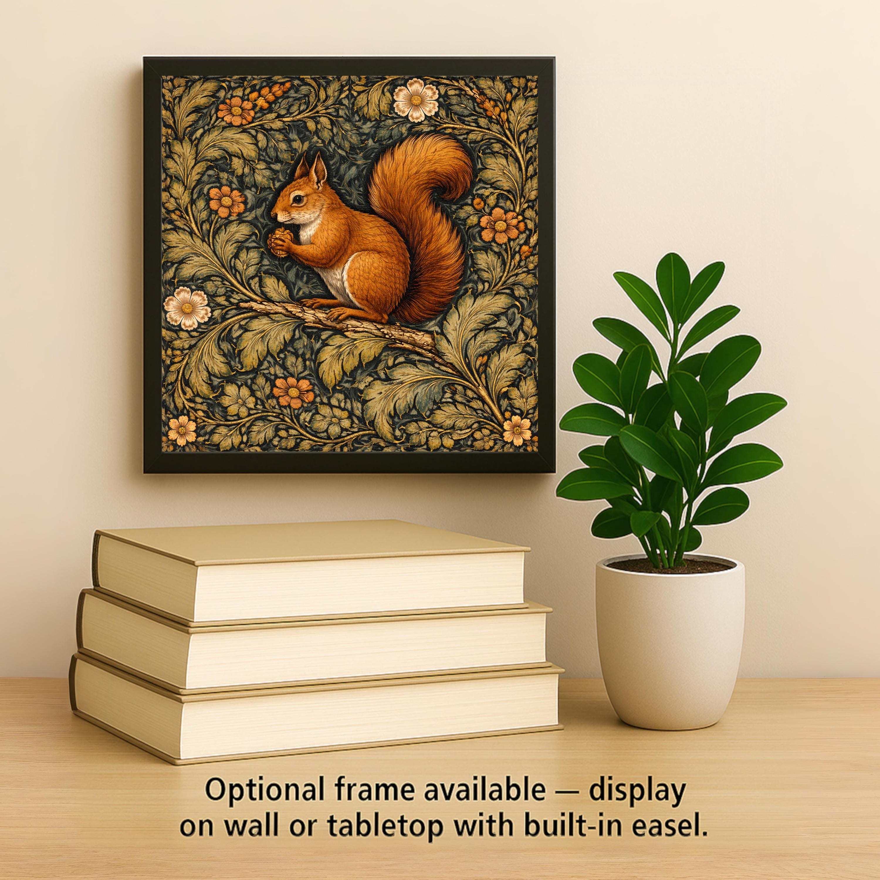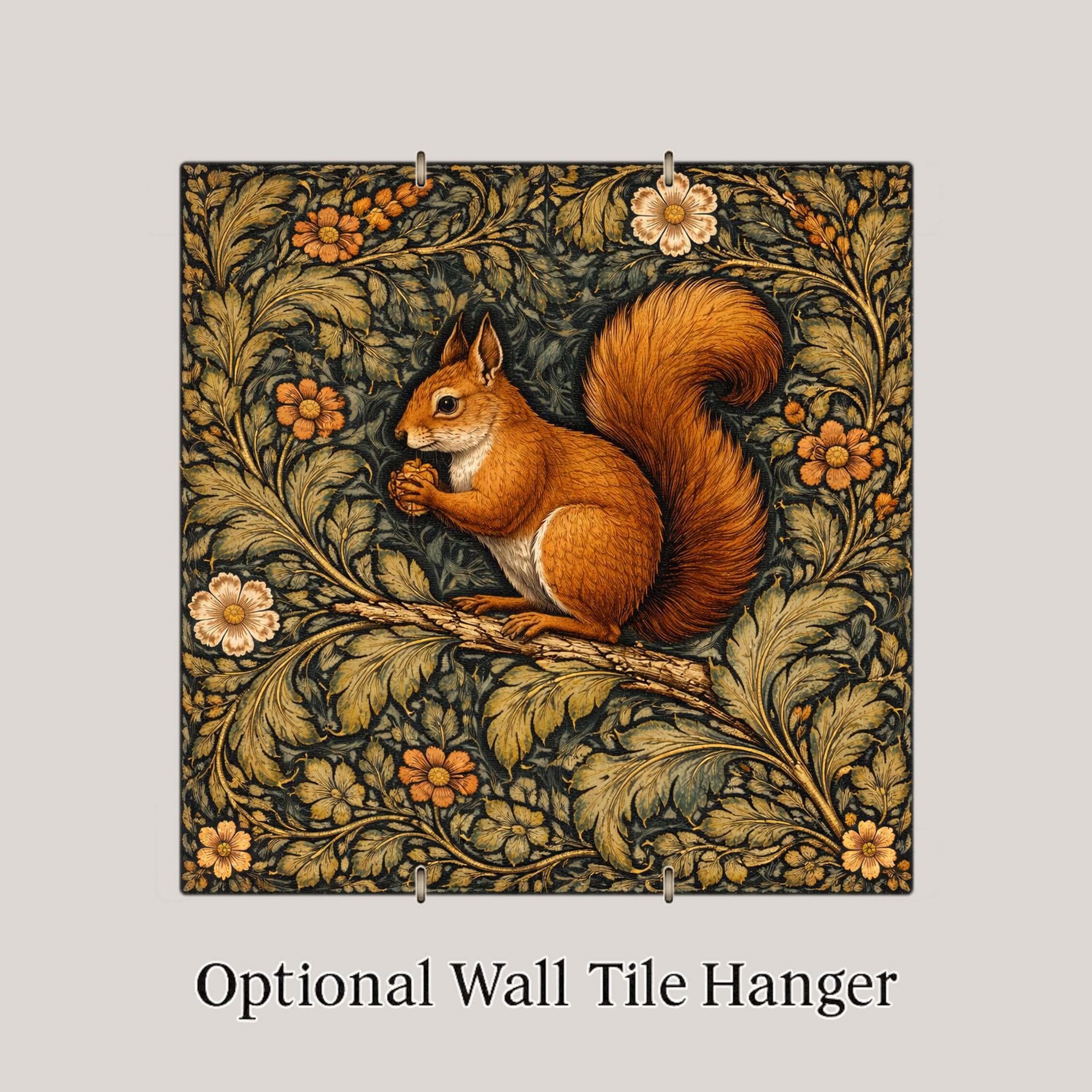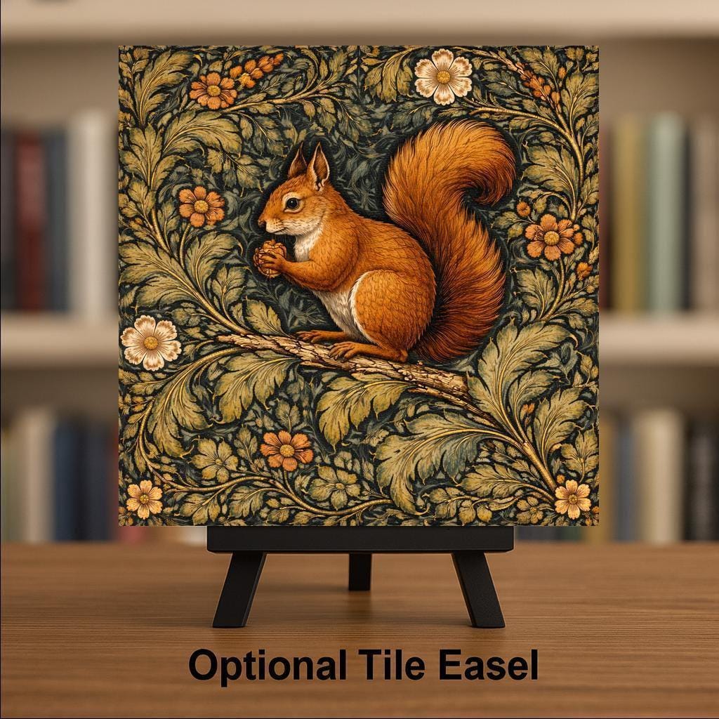 With layered foliage and rich tonal contrast, this design reflects classic Arts and Crafts textile influence while remaining approachable and warm. The squirrel adds character and seasonal versatility.