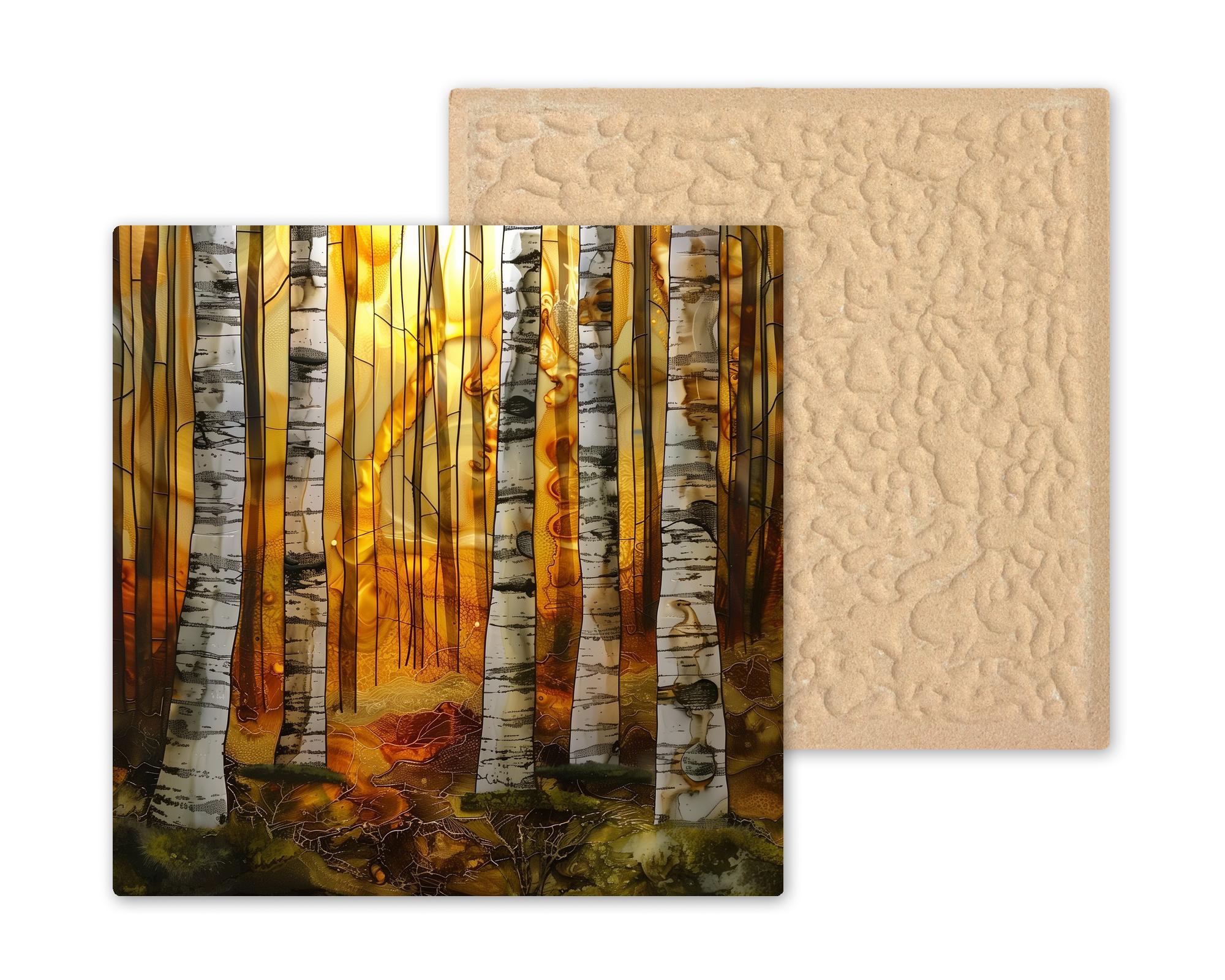 It stands confidently as a single decorative tile while also pairing seamlessly with the Mist and Sunset pieces from the same birch woodland collection.