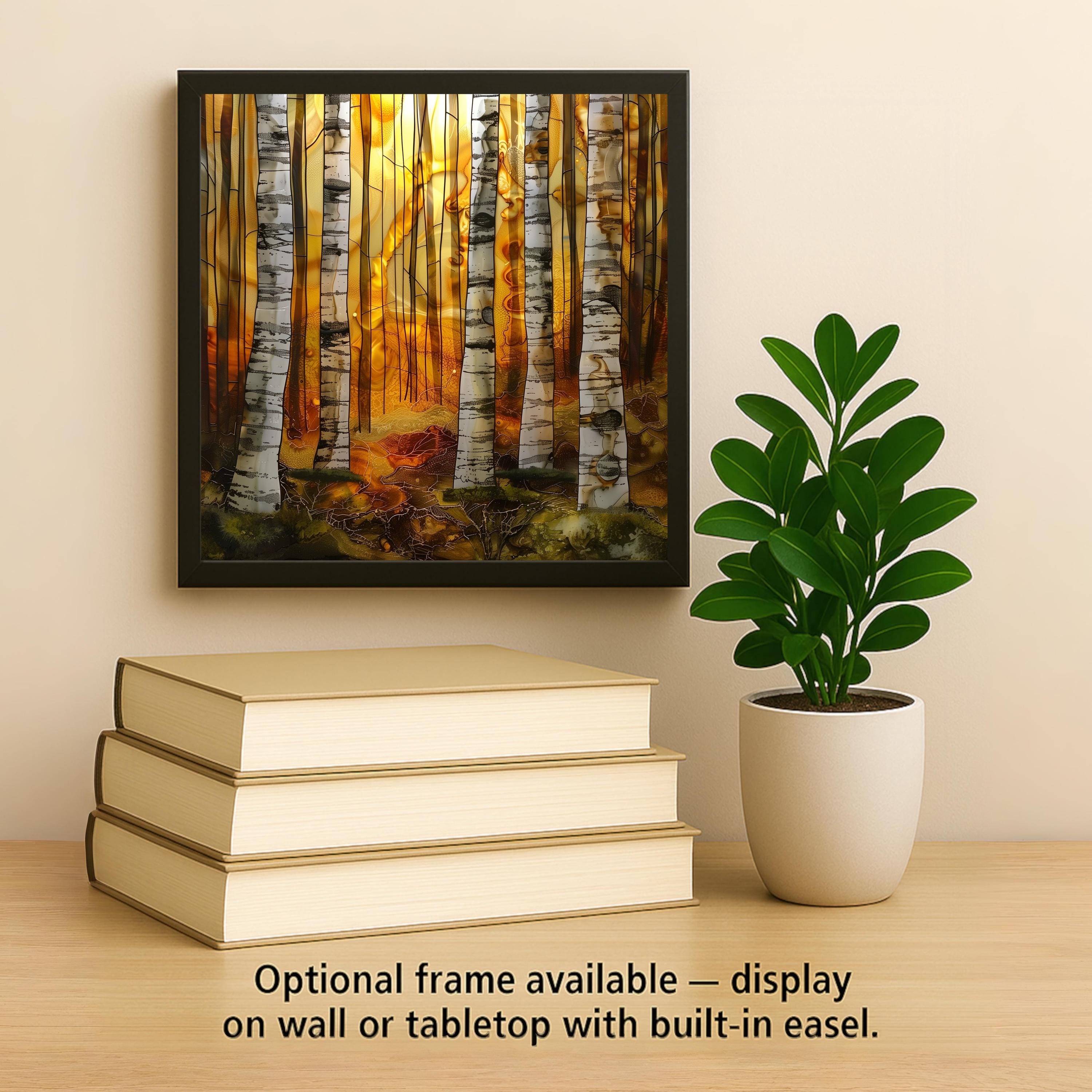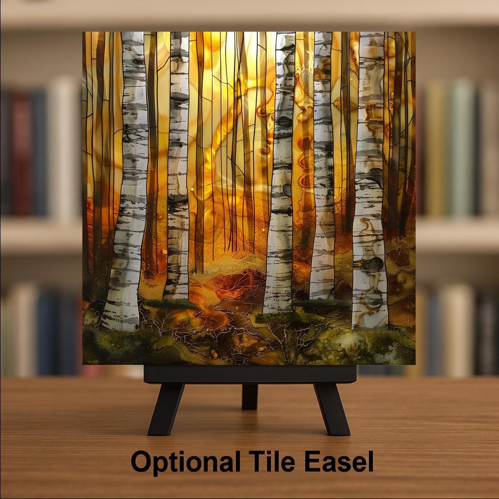 Inspired by quiet forest mornings, this birch design emphasizes atmosphere and light. The tall white trunks and glowing sunrise create a sense of depth and calm that feels timeless and grounded in nature.
