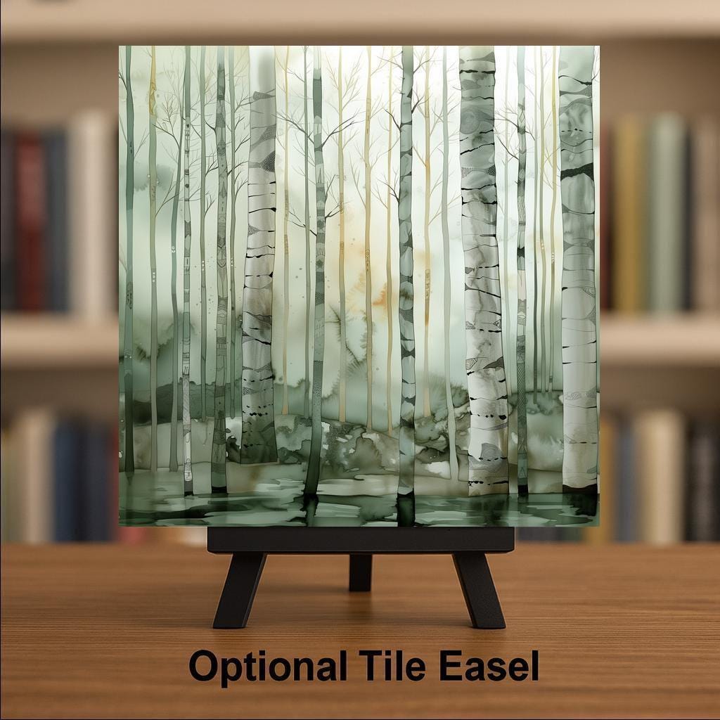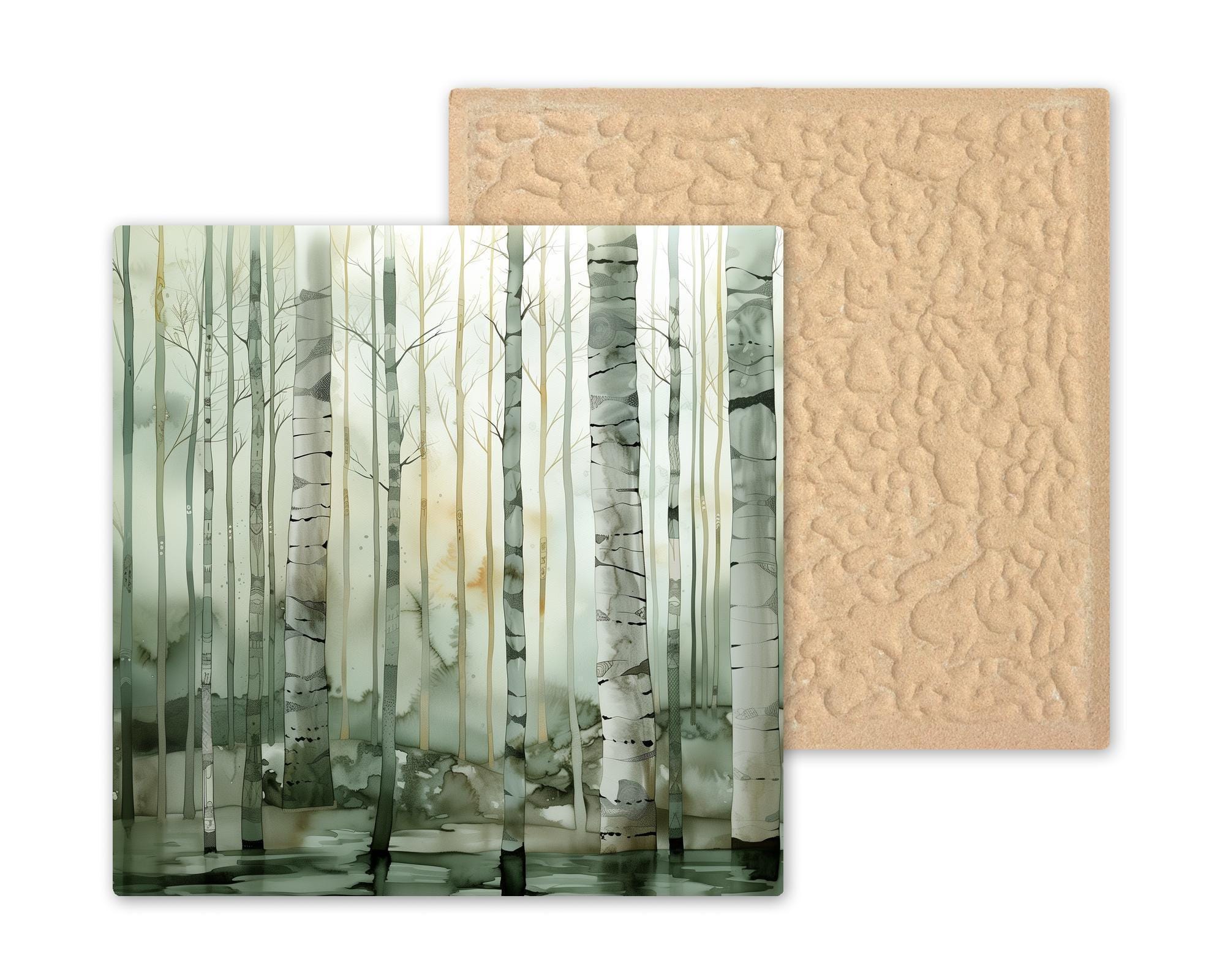 It was created to feel peaceful and modern while still connecting strongly with nature. The tile works beautifully alone or paired with the Sunrise and Sunset pieces in the birch forest series.
