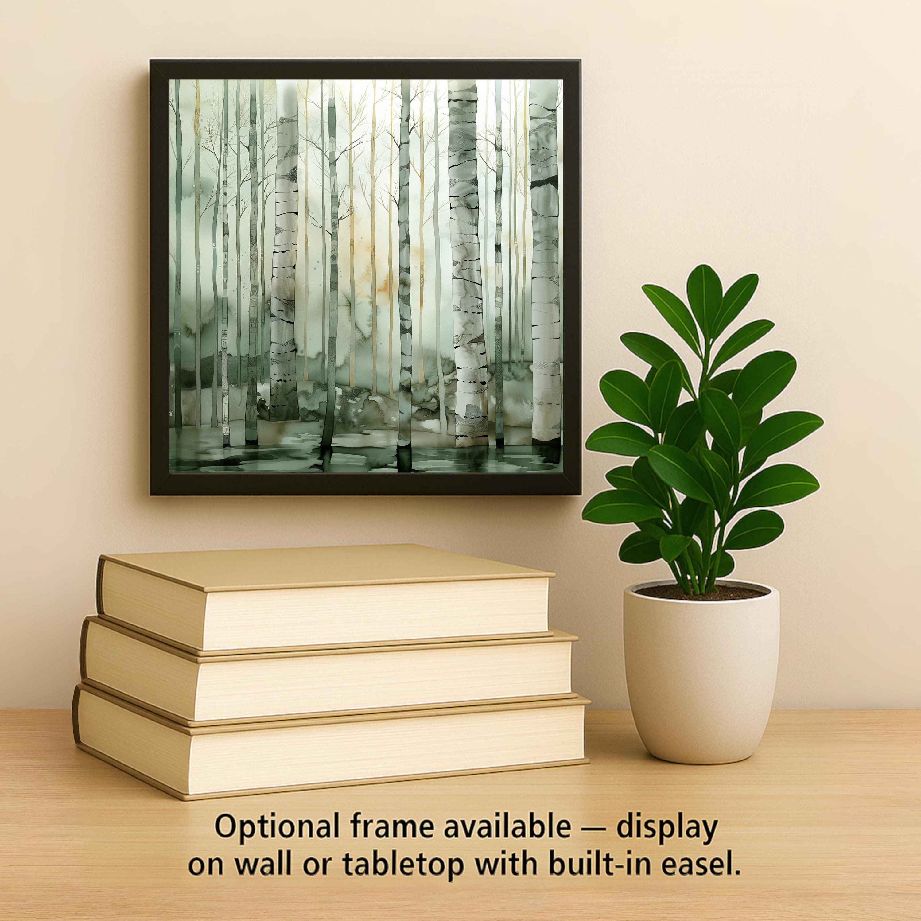 This design focuses on atmosphere rather than bold contrast. The mist softens the forest landscape while the birch trunks introduce elegant vertical structure.