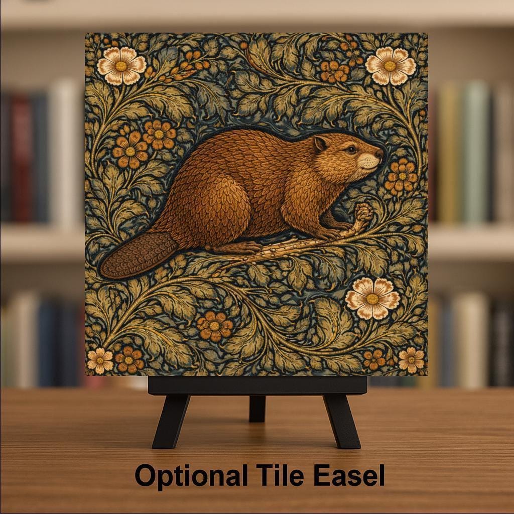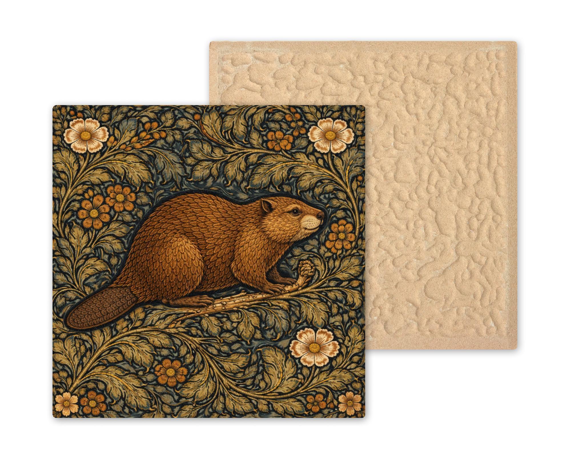 The repeating foliage pattern frames the beaver naturally while creating a balanced decorative composition that works beautifully as both wildlife art and ornamental design.