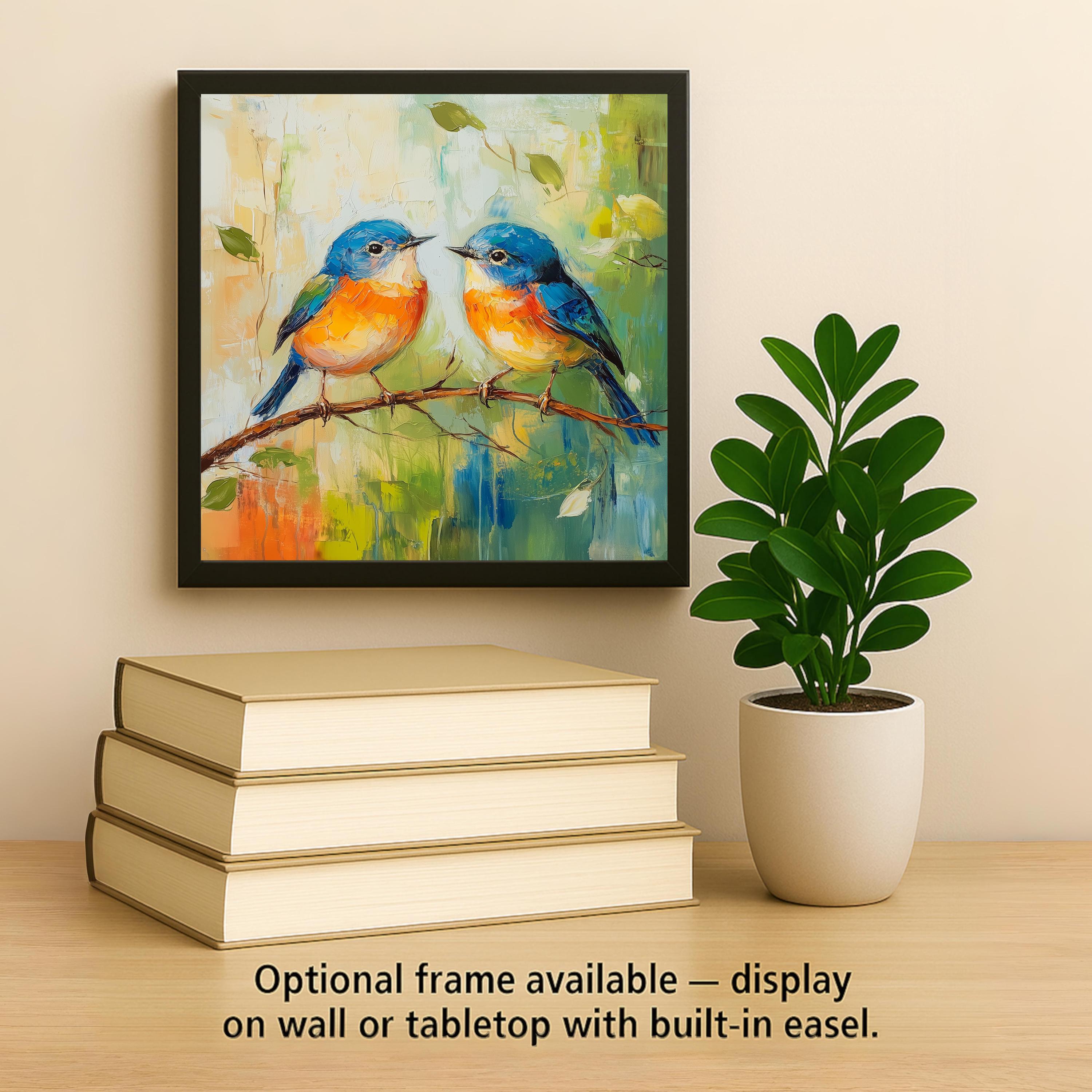 The paired birds create a balanced composition that feels cheerful and peaceful while maintaining the expressive brushwork of a modern impressionist painting style.