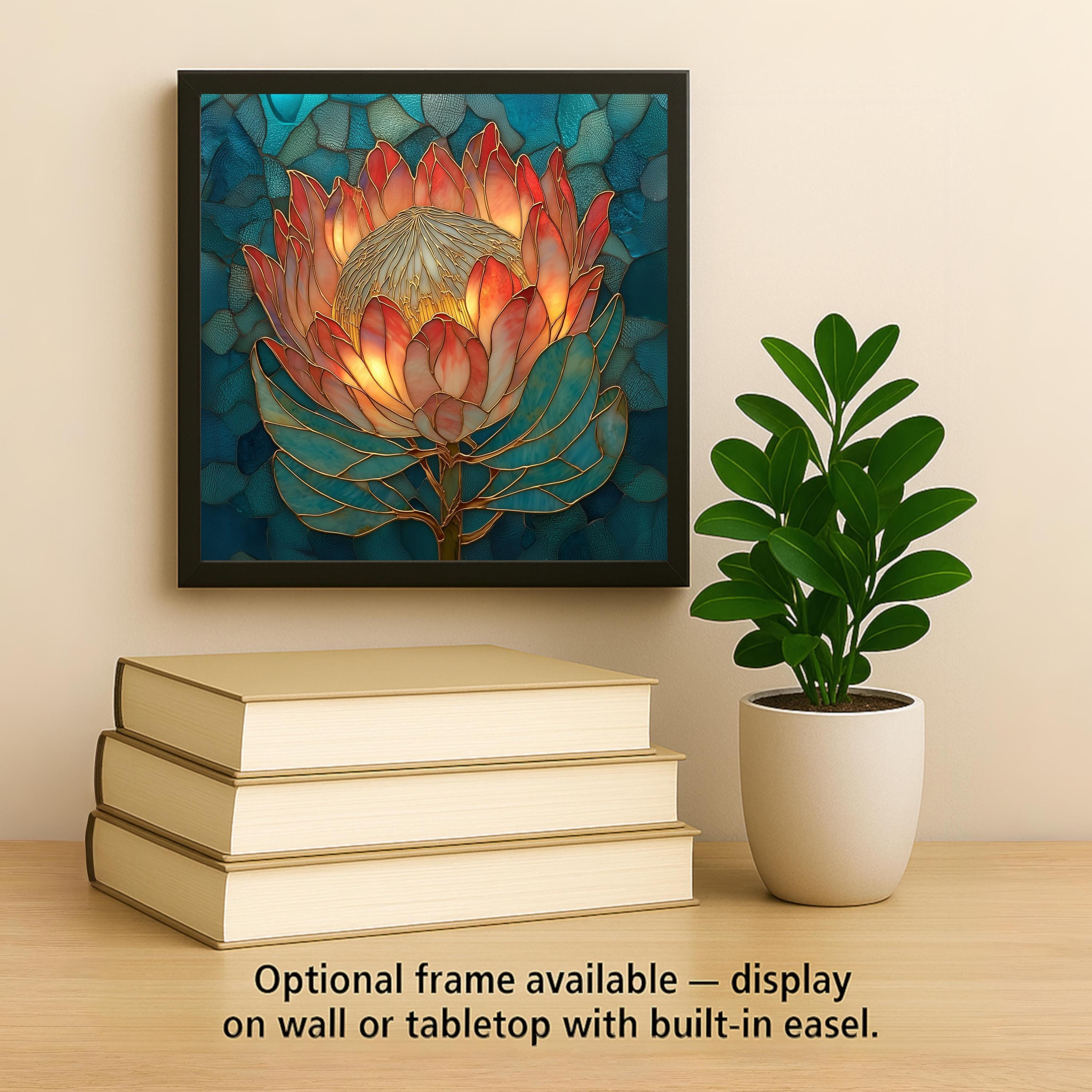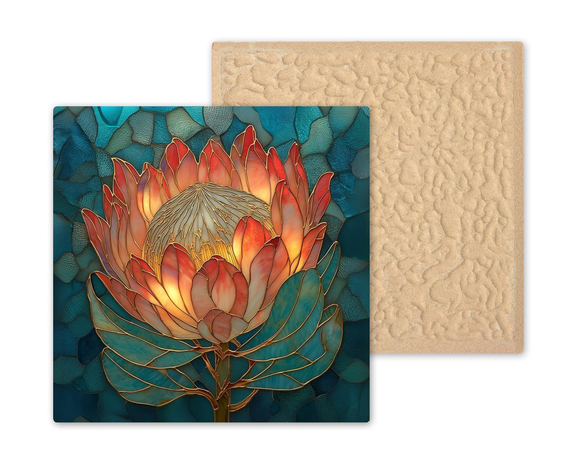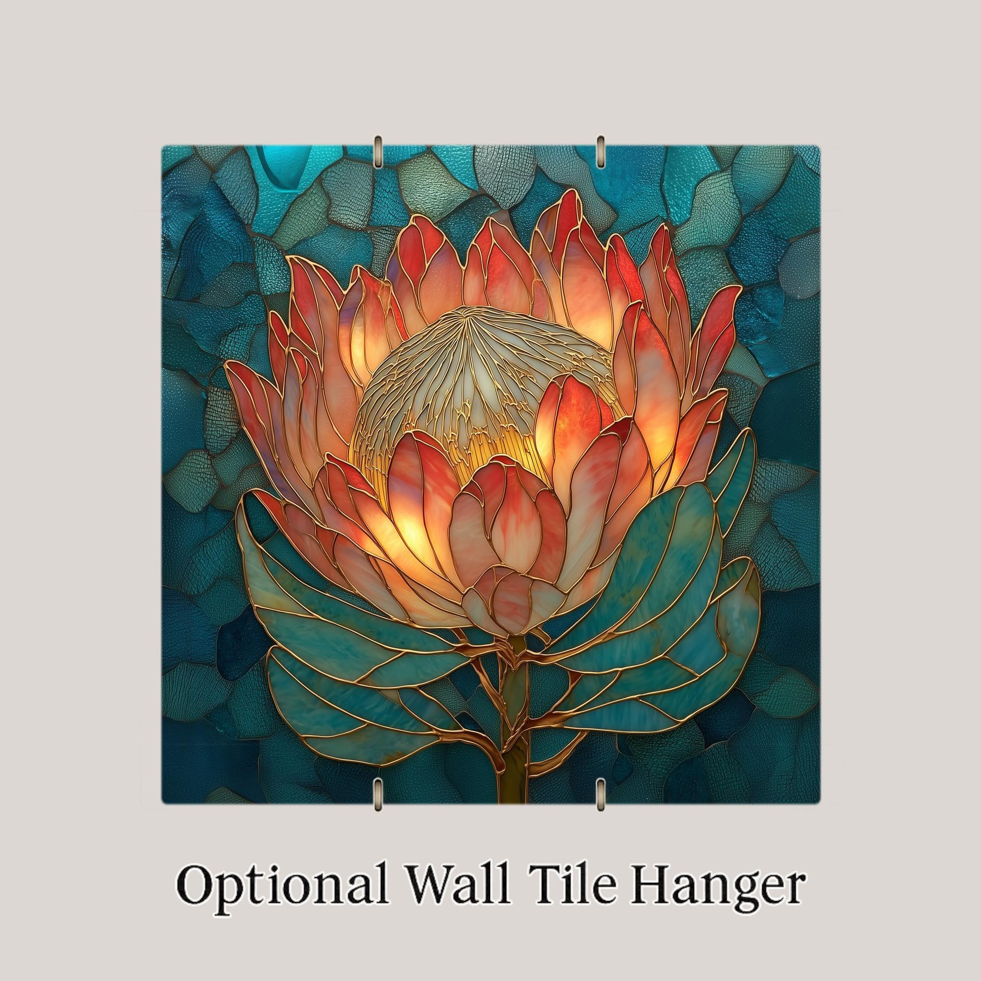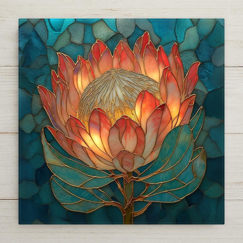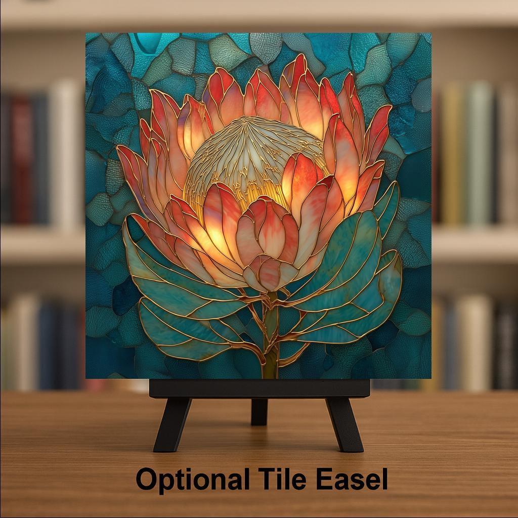 Protea flowers are among the most dramatic blooms in the natural world. Their sculptural petals and radiant centers create shapes that almost feel architectural. This tile captures that unique beauty with a stained-glass-inspired style that blends rich color with elegant linework.