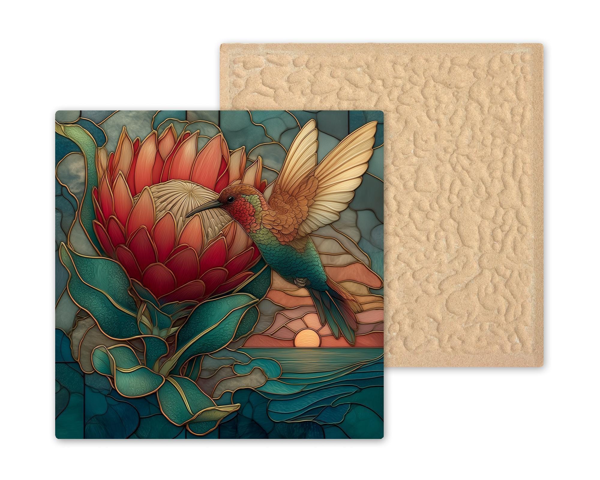 The scene combines elements of botanical illustration and stained glass design. Coral protea petals radiate outward while delicate gold outlines trace the bird’s feathers and the surrounding leaves. Teal ocean tones create a calming background that allows the hummingbird’s jewel-like colors to stand out.