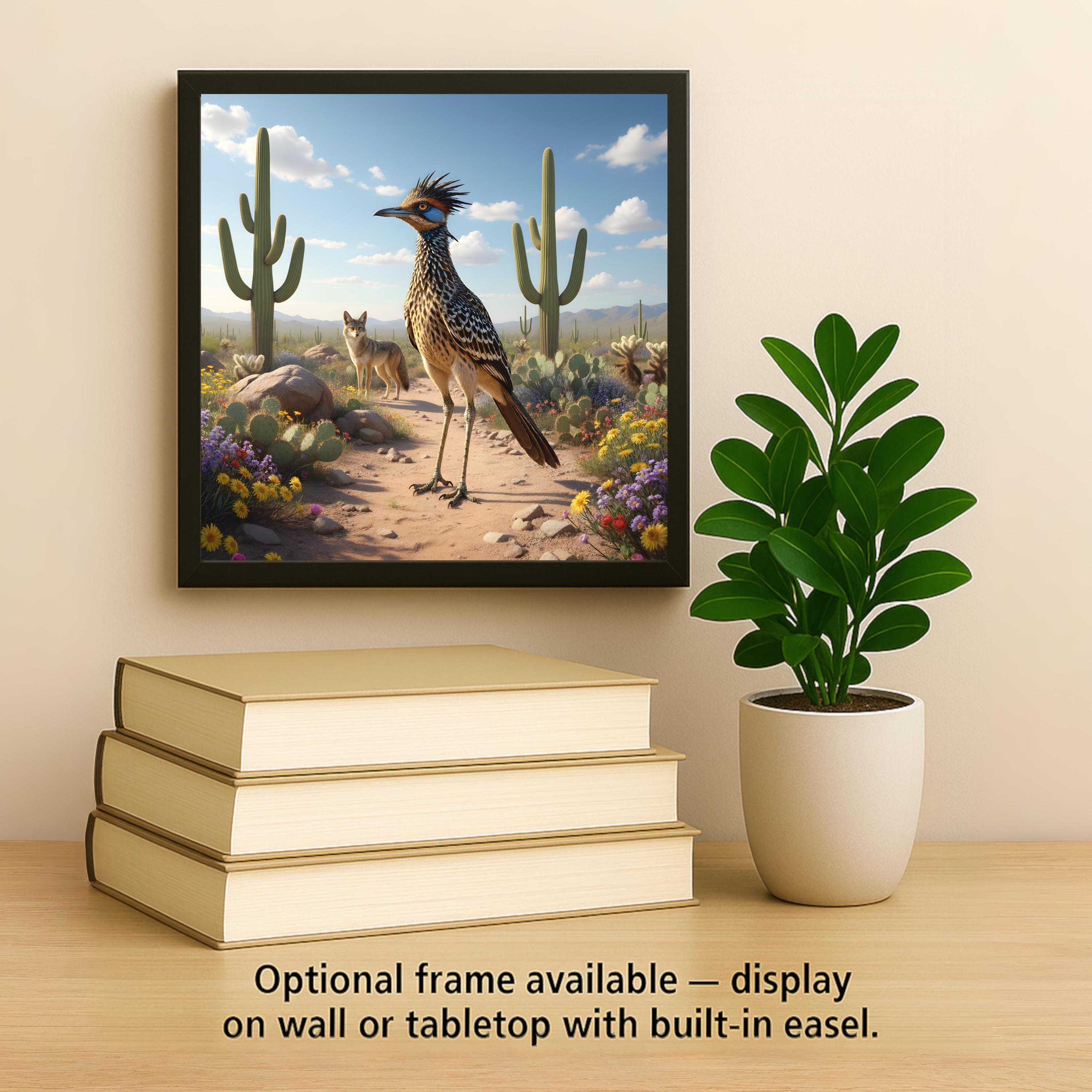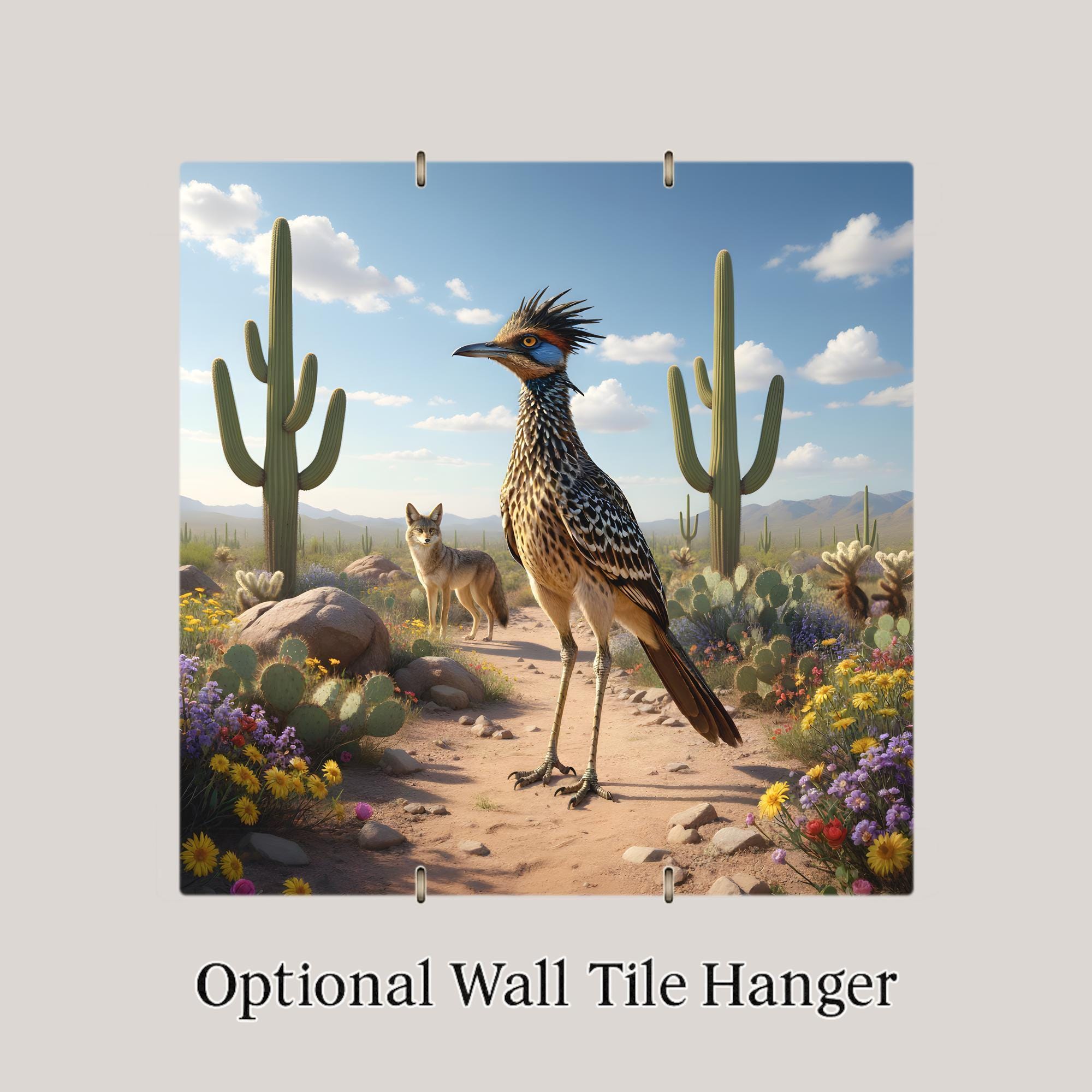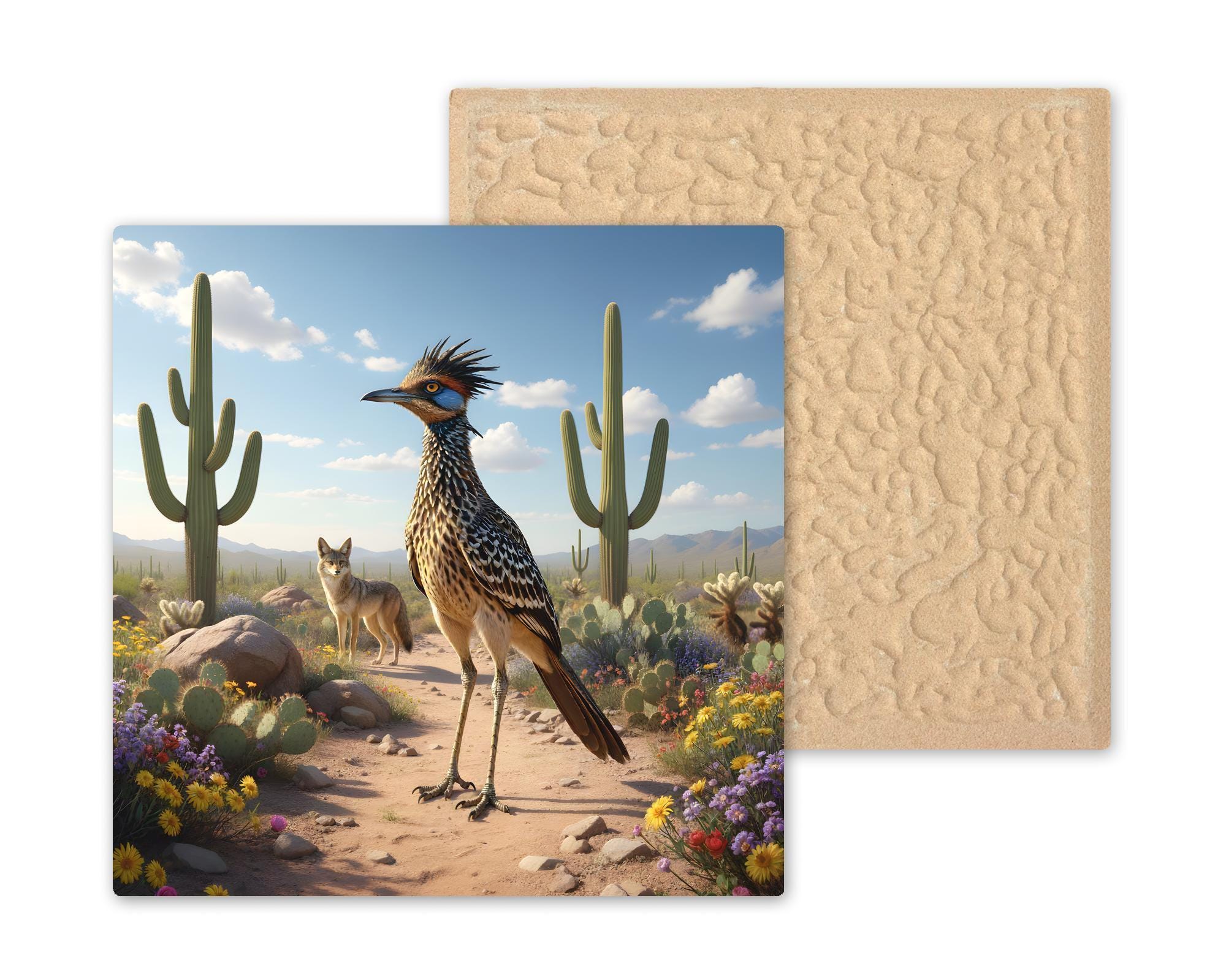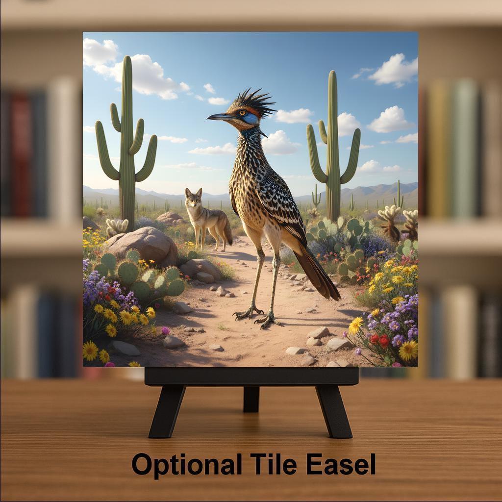 The desert is full of quiet stories, and this tile captures one of its most famous wildlife pairings: the roadrunner and the coyote.