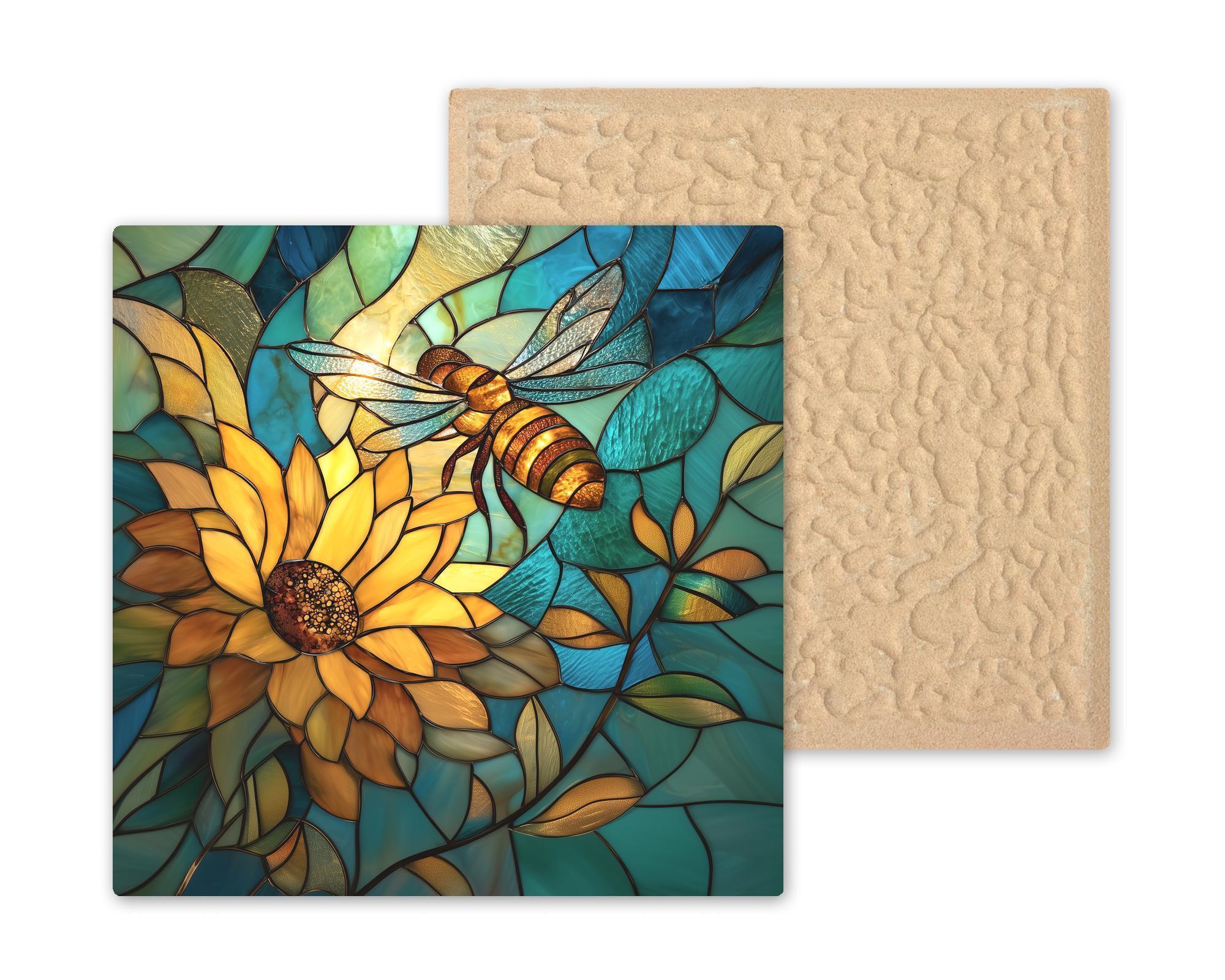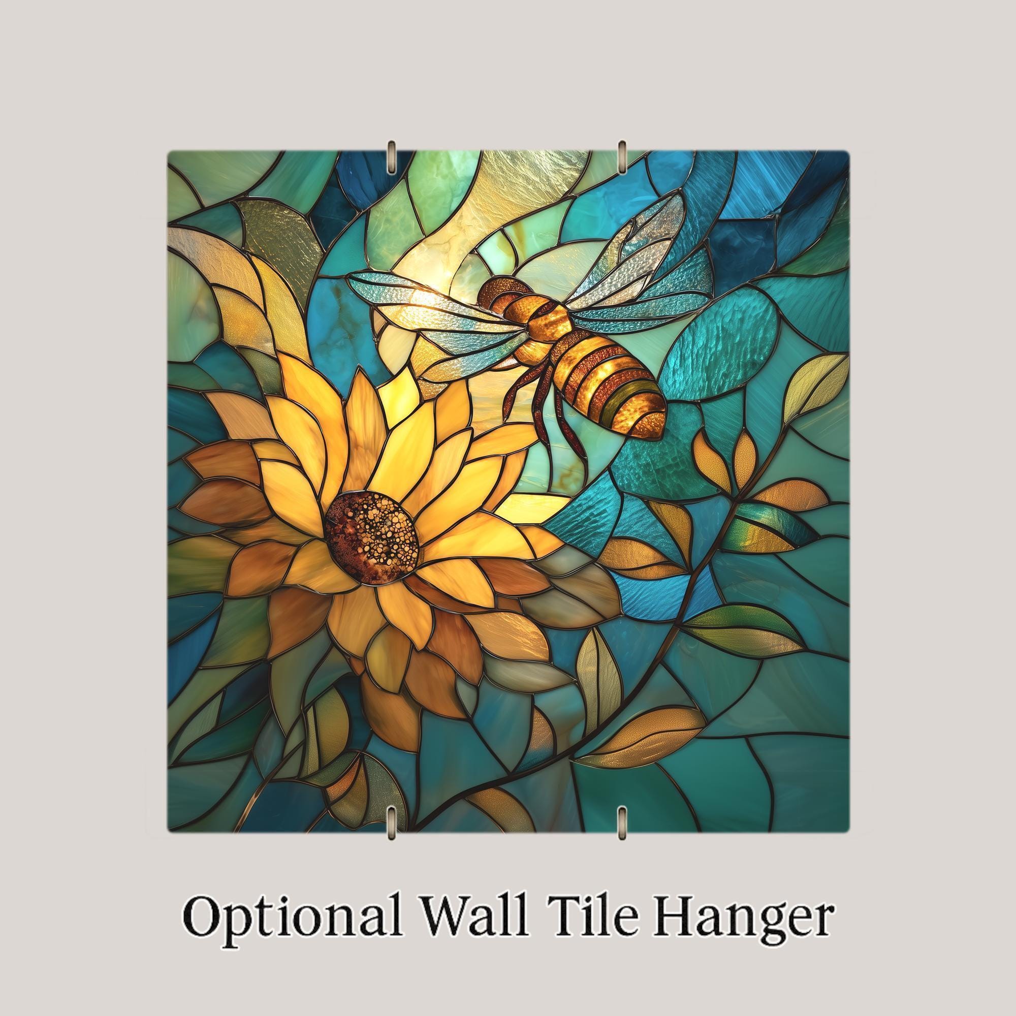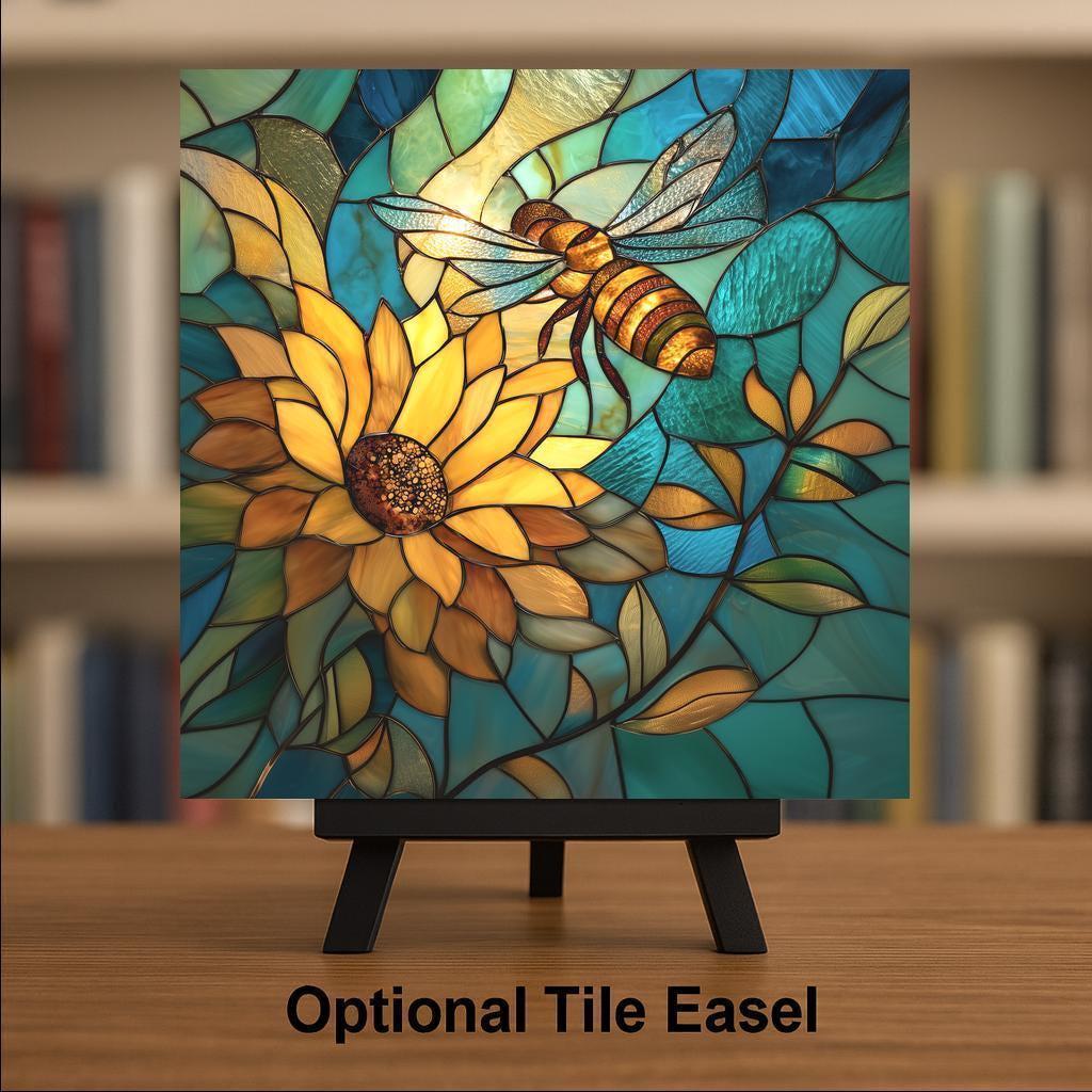 Pollinators are the quiet heroes of the natural world, and this tile highlights one of the most recognizable—the honey bee. Hovering over a glowing sunflower, the bee becomes the focal point of a vibrant botanical composition inspired by art nouveau stained glass windows.