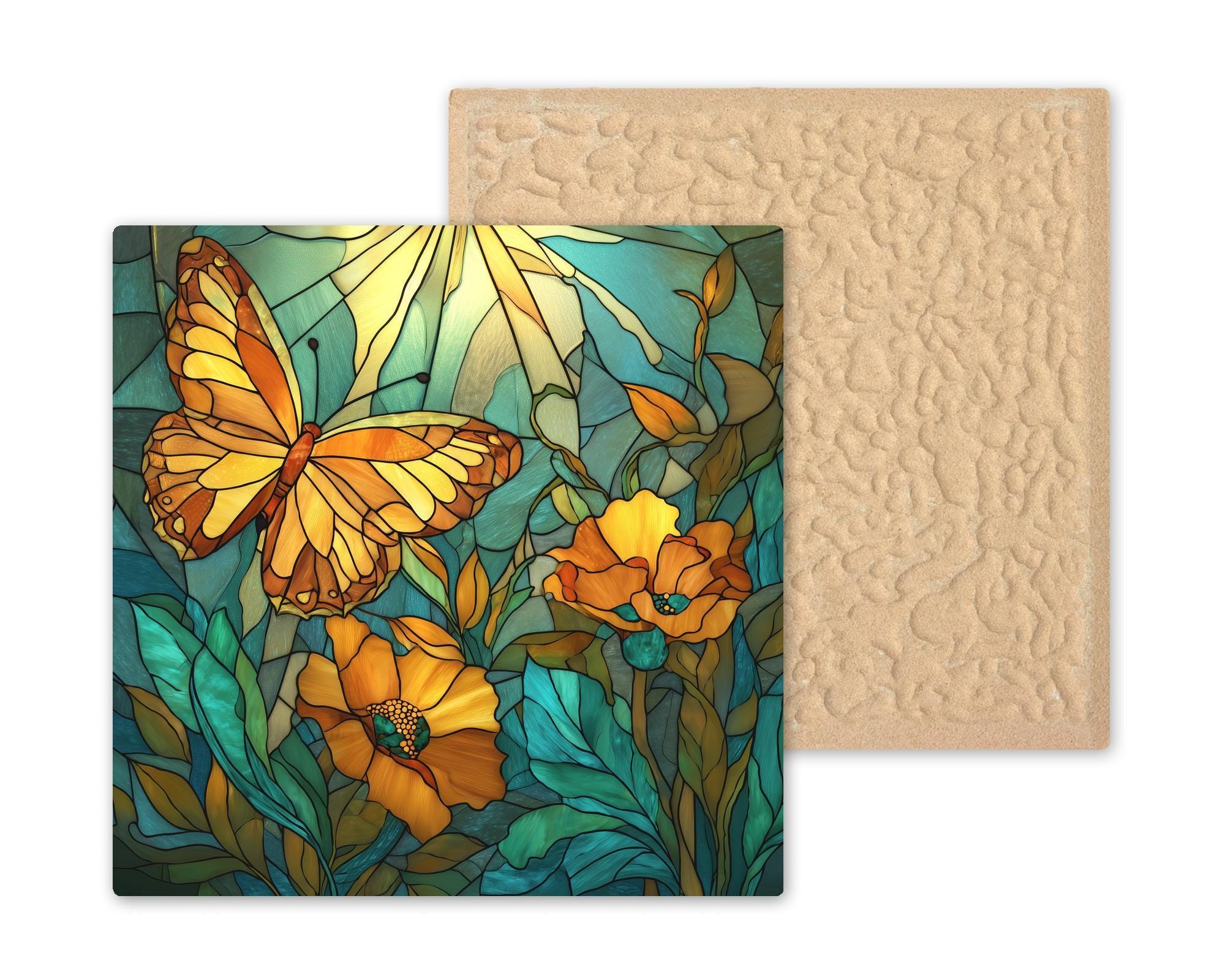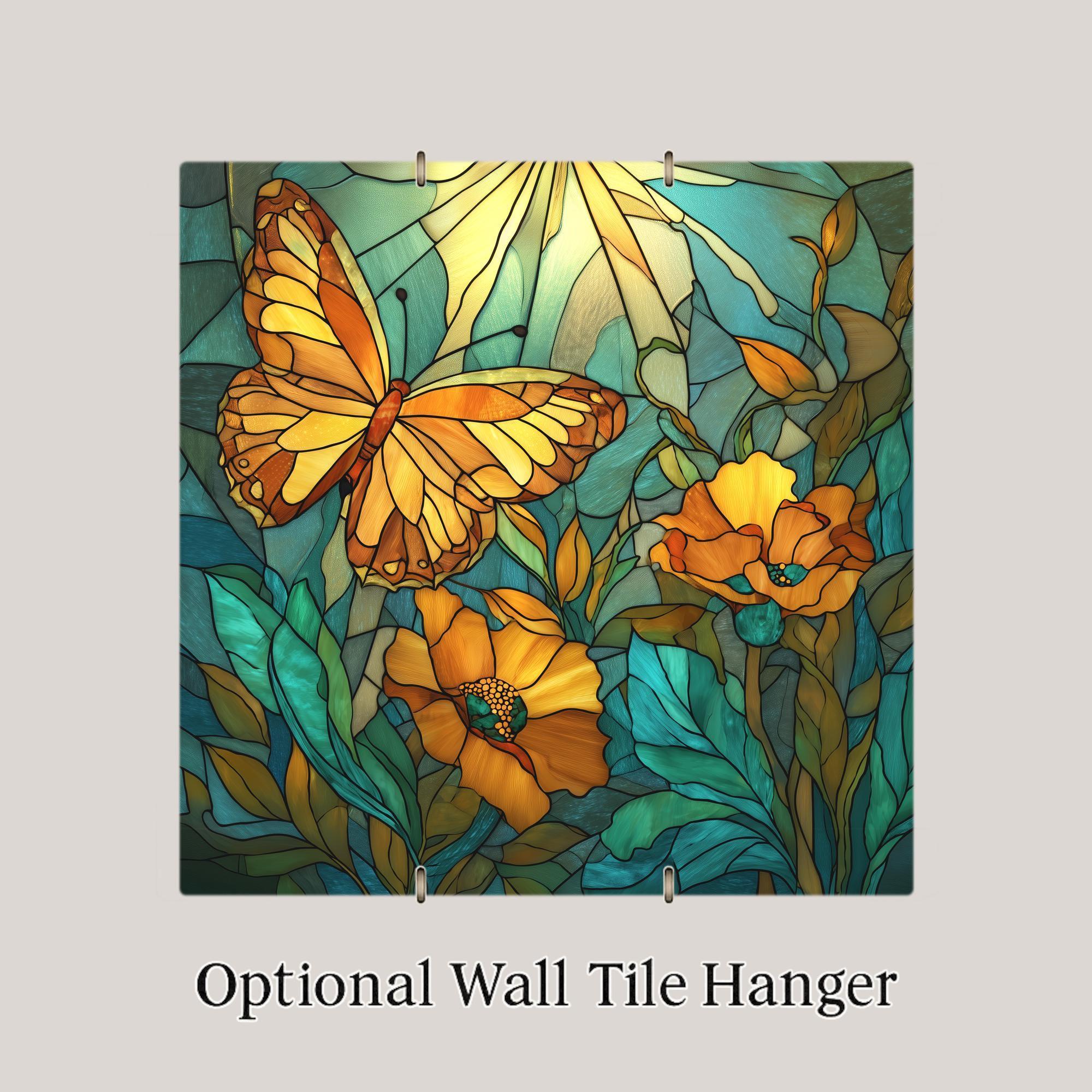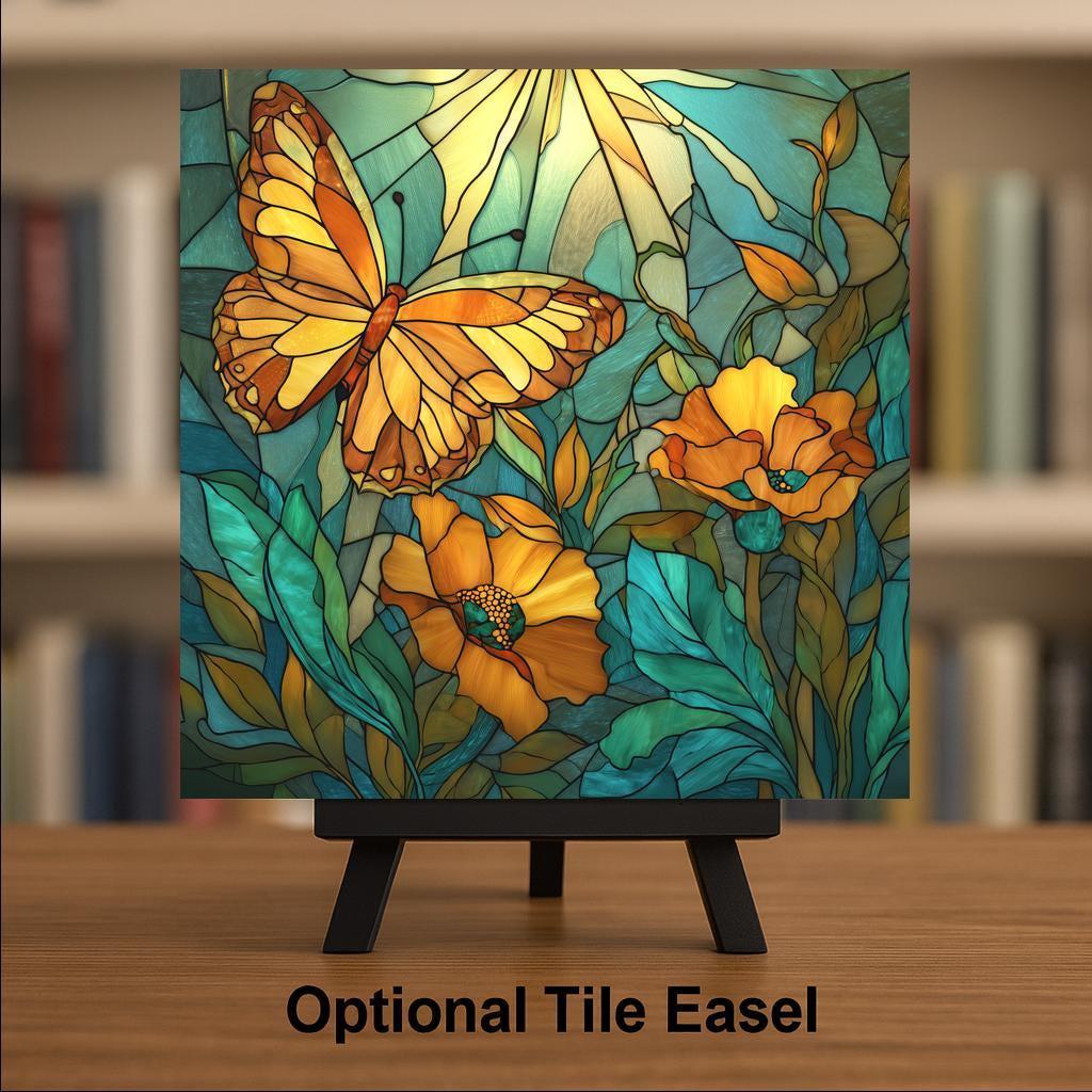 Butterflies have long symbolized renewal and transformation, and the monarch butterfly is one of the most recognizable pollinators in nature. This tile captures the butterfly mid-flight as it glides above golden blossoms and leafy botanical forms.