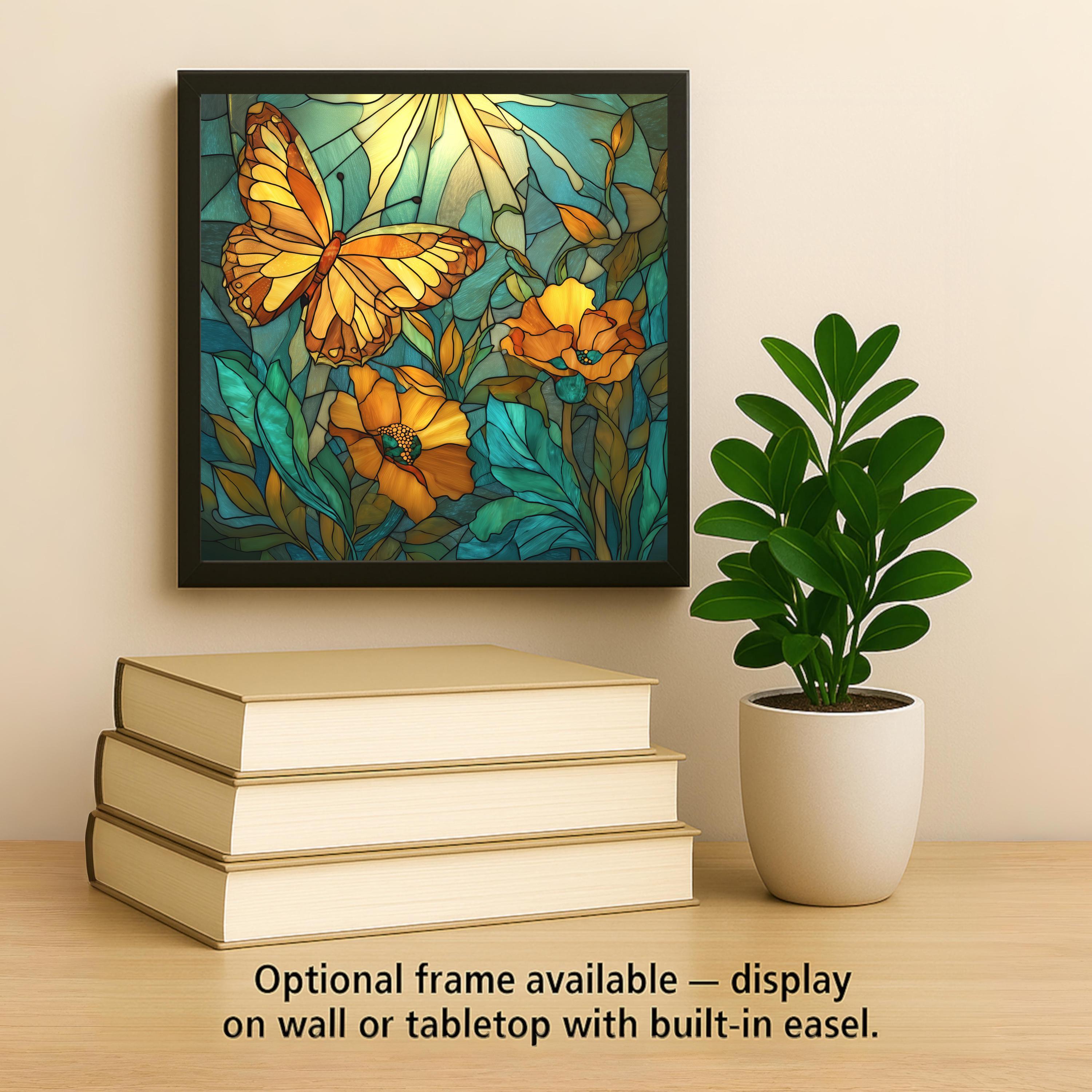 The composition draws inspiration from art nouveau stained glass windows, where flowing organic lines and layered colors create luminous patterns. Warm orange wings glow against cool teal foliage, creating a natural harmony between insect and plant life.