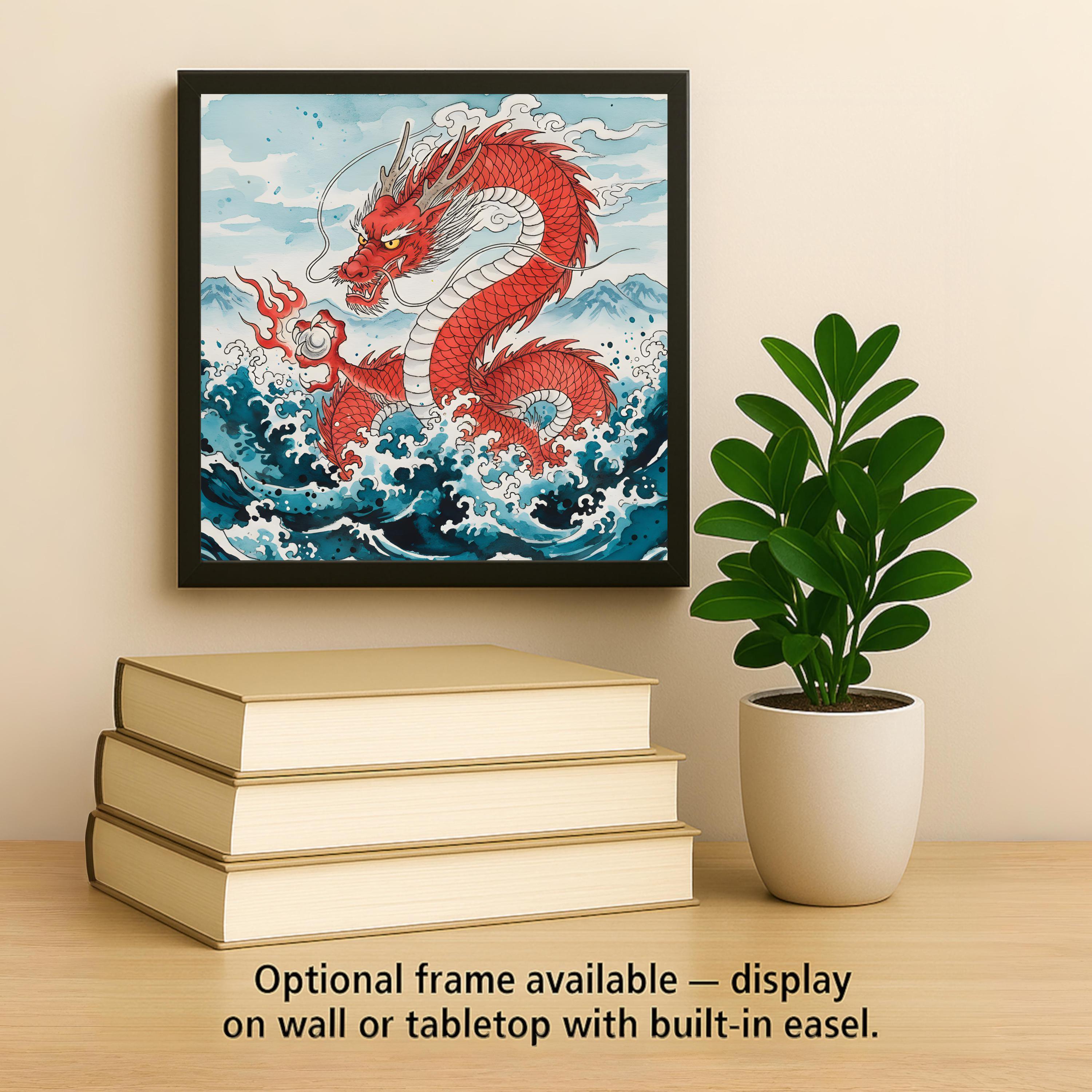The dragon emerges from swirling waves while holding a glowing pearl—often called the dragon pearl, a symbol of wisdom, enlightenment, and cosmic power.