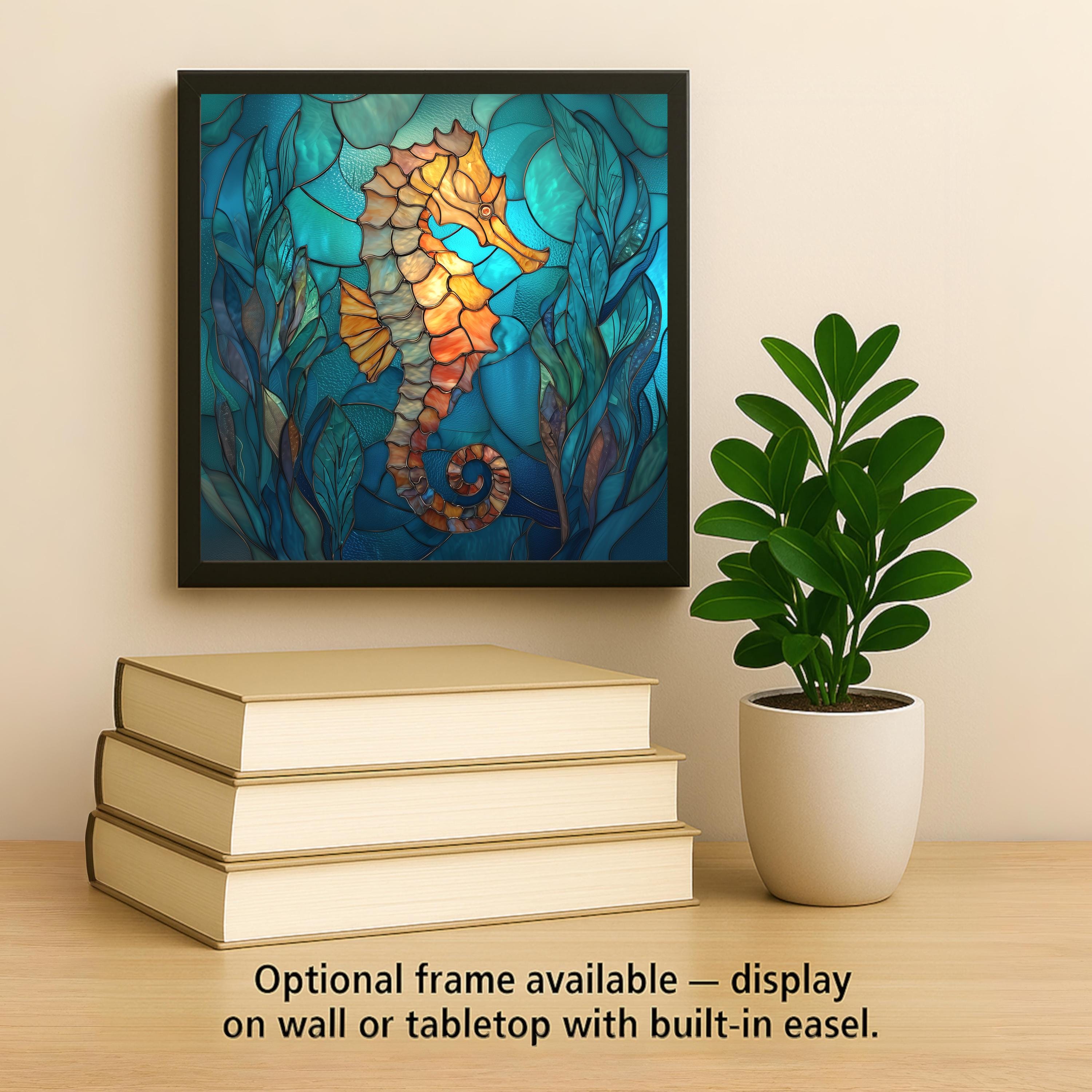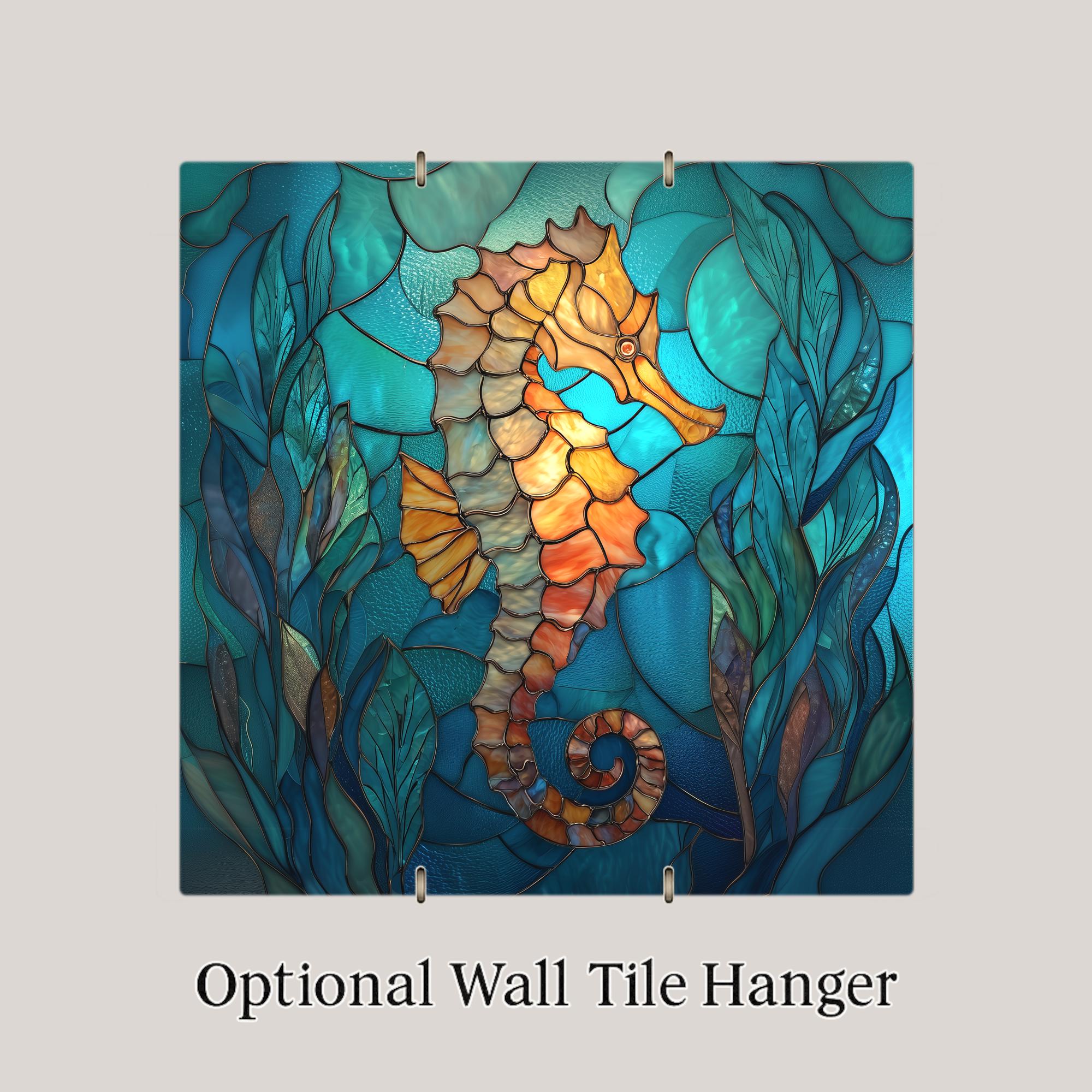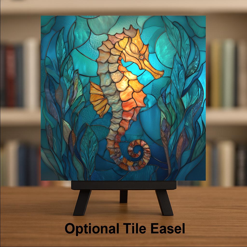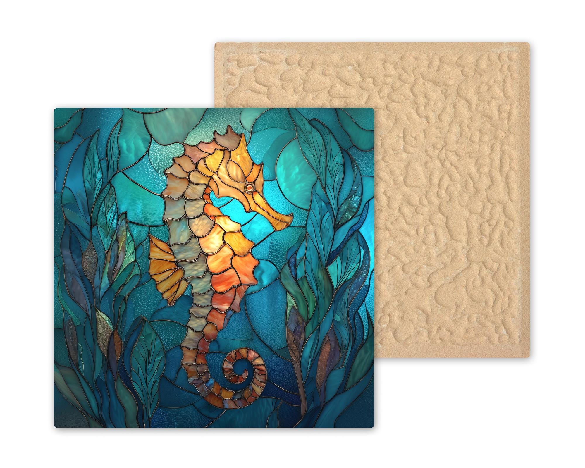 This seahorse tile was designed for customers who love coastal decor with strong color, graceful movement, and ocean character. The flowing seaweed, glass-like textures, and jewel-toned water give the piece a peaceful underwater feel while the warm seahorse tones create a beautiful focal point.