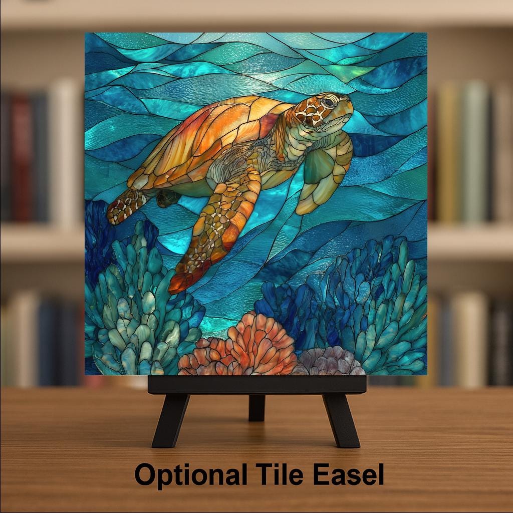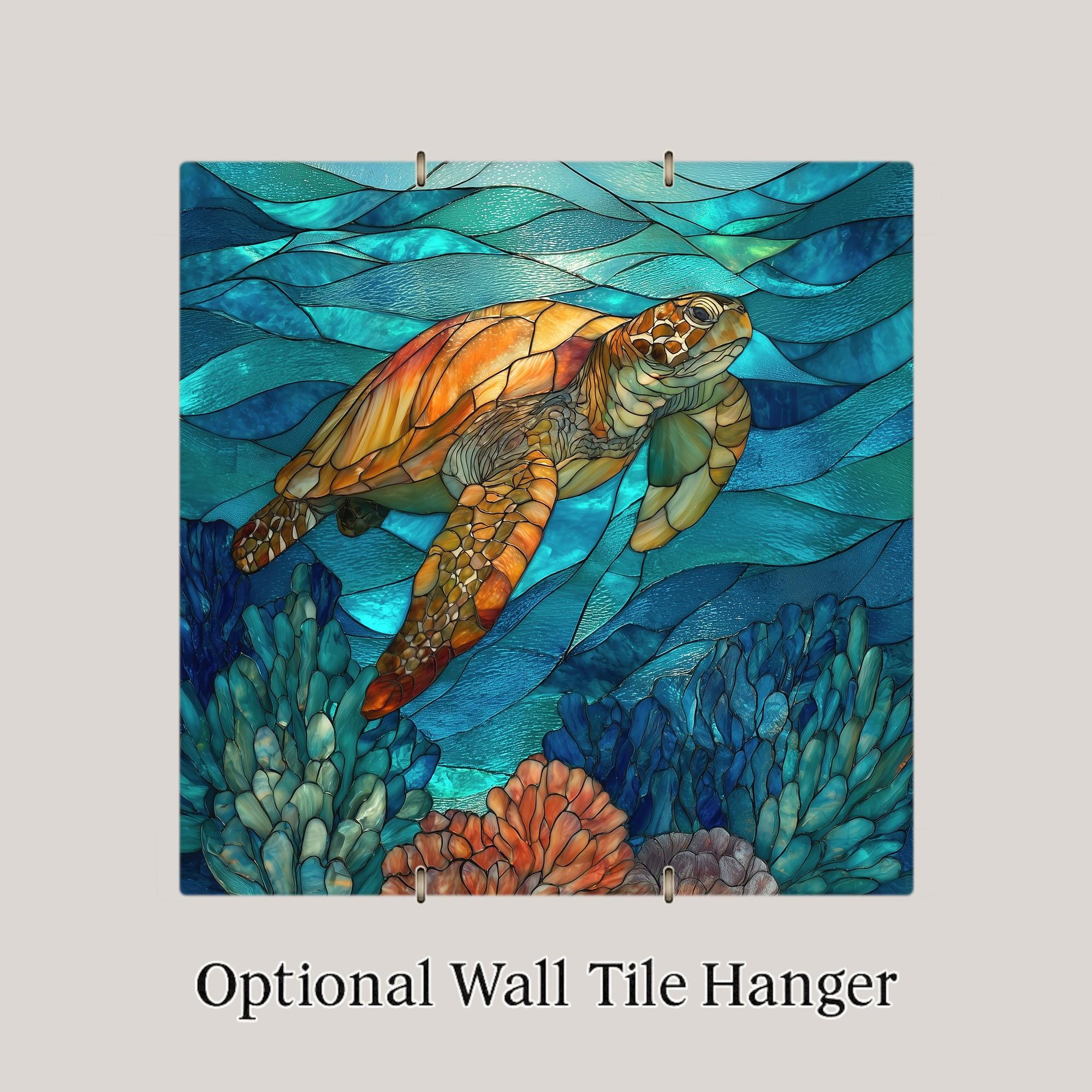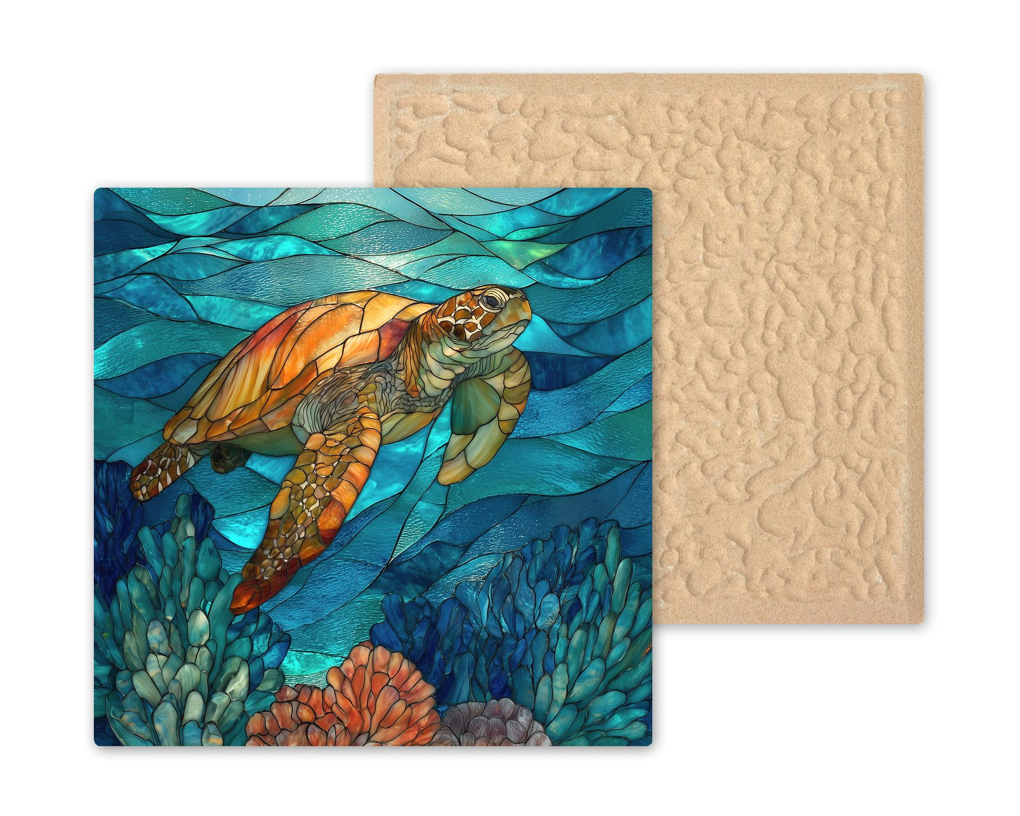 The stained glass look gives the artwork a luminous finish, but the image is actually permanently infused into the tile surface. That keeps the finish smooth while preserving the detailed ocean textures and vibrant color.