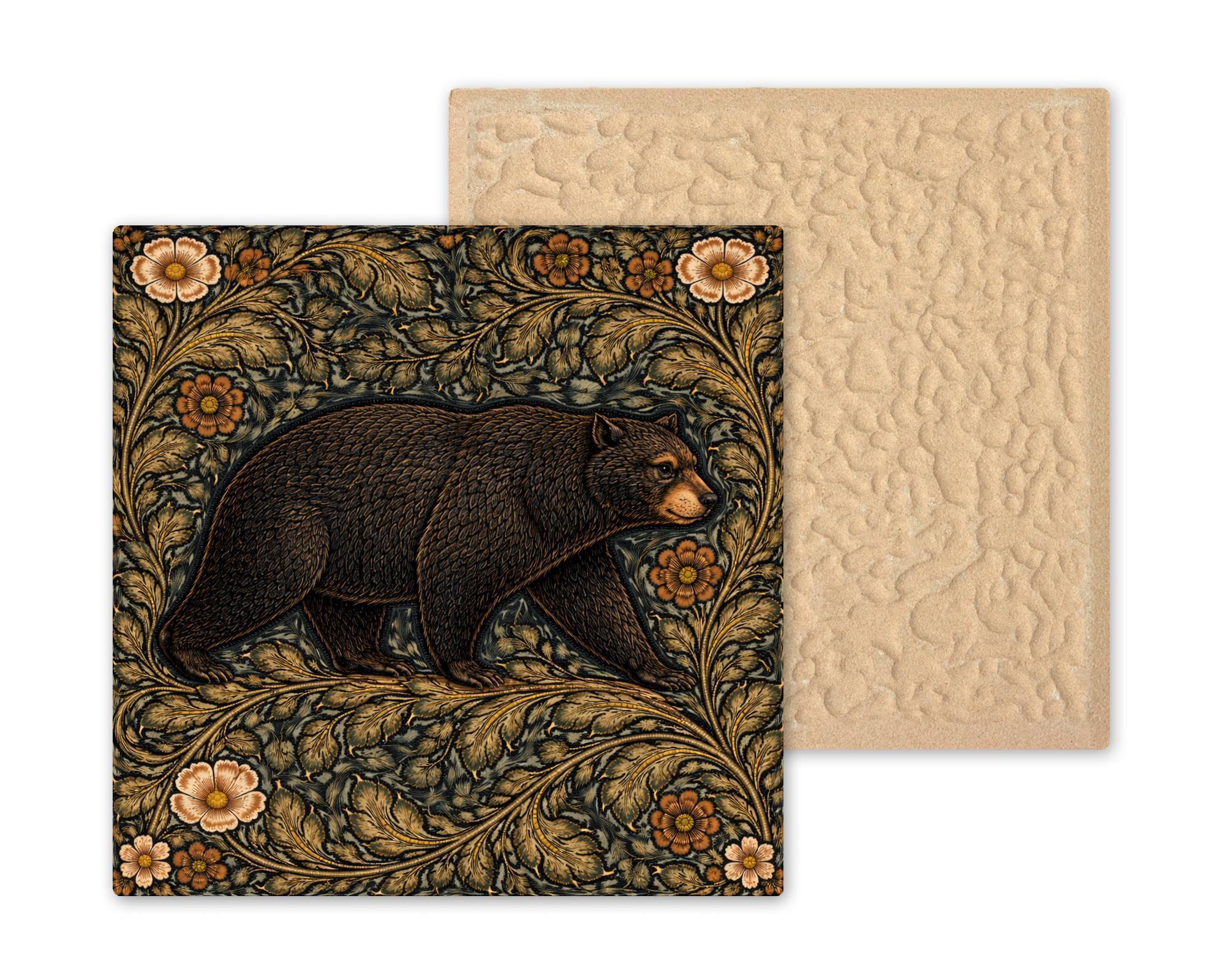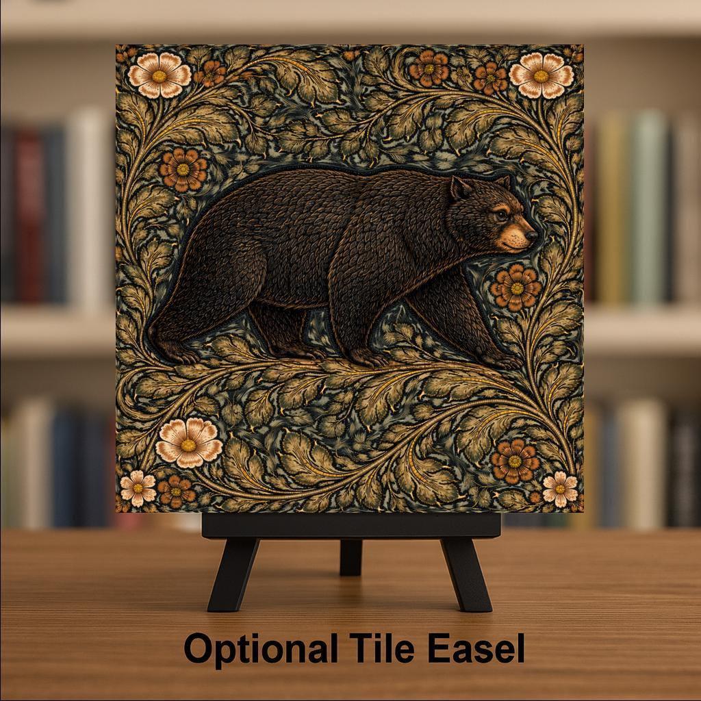 This woodland bear tile draws inspiration from classic Arts and Crafts botanical design. Flowing leaves, detailed florals, and rich forest colors frame the bear in a way that feels both natural and decorative.