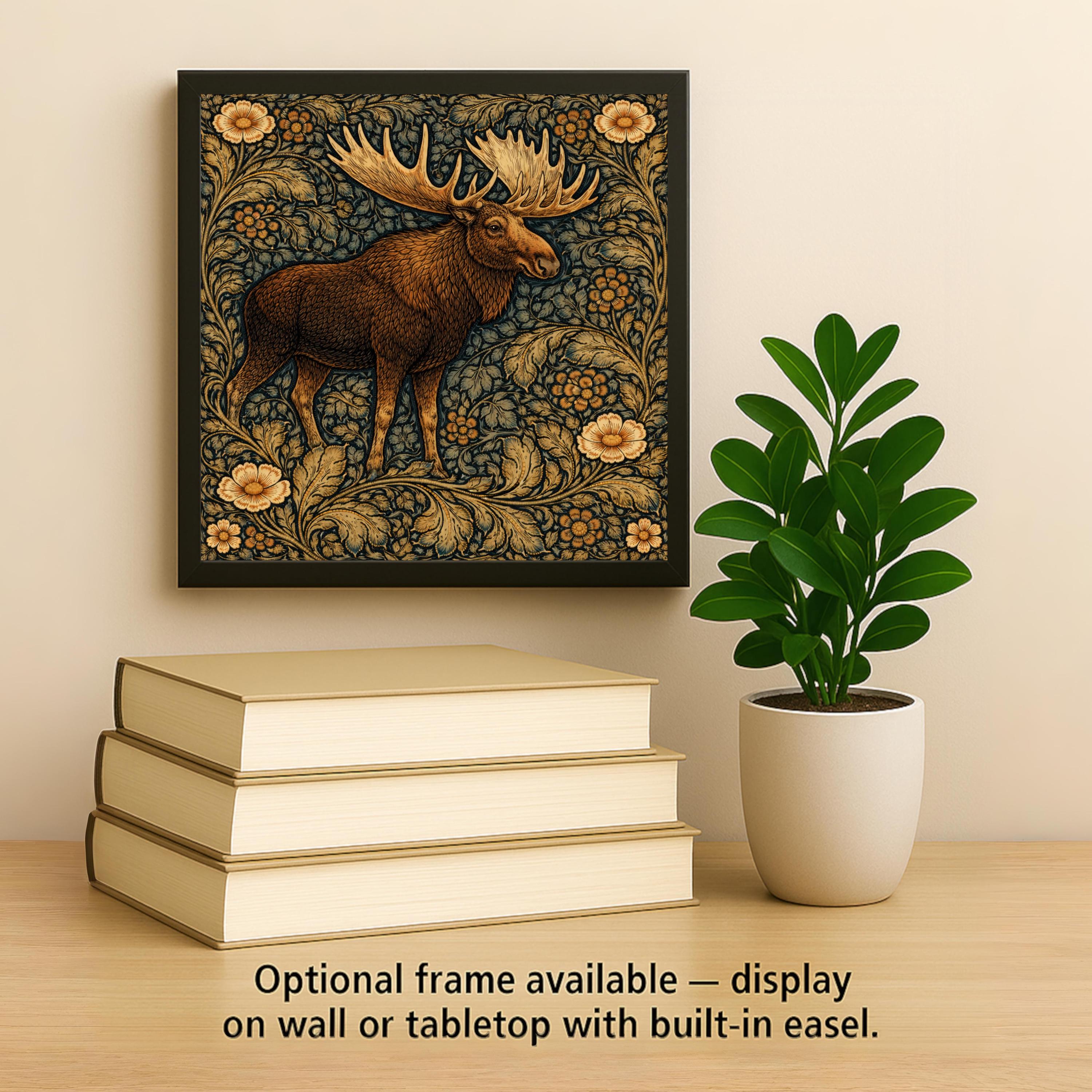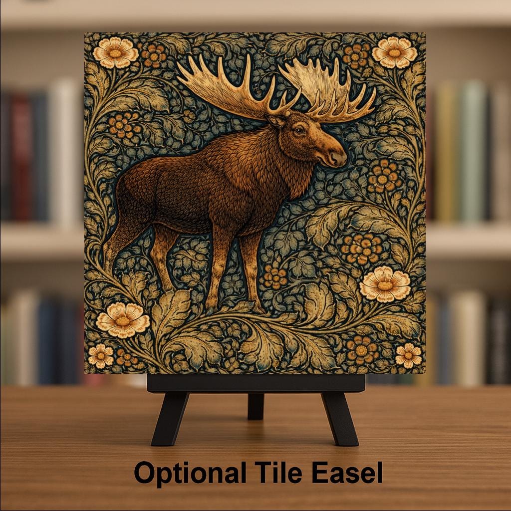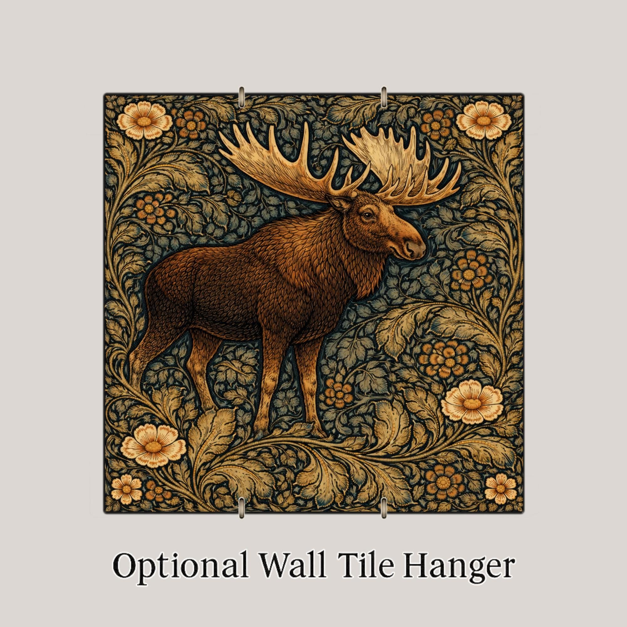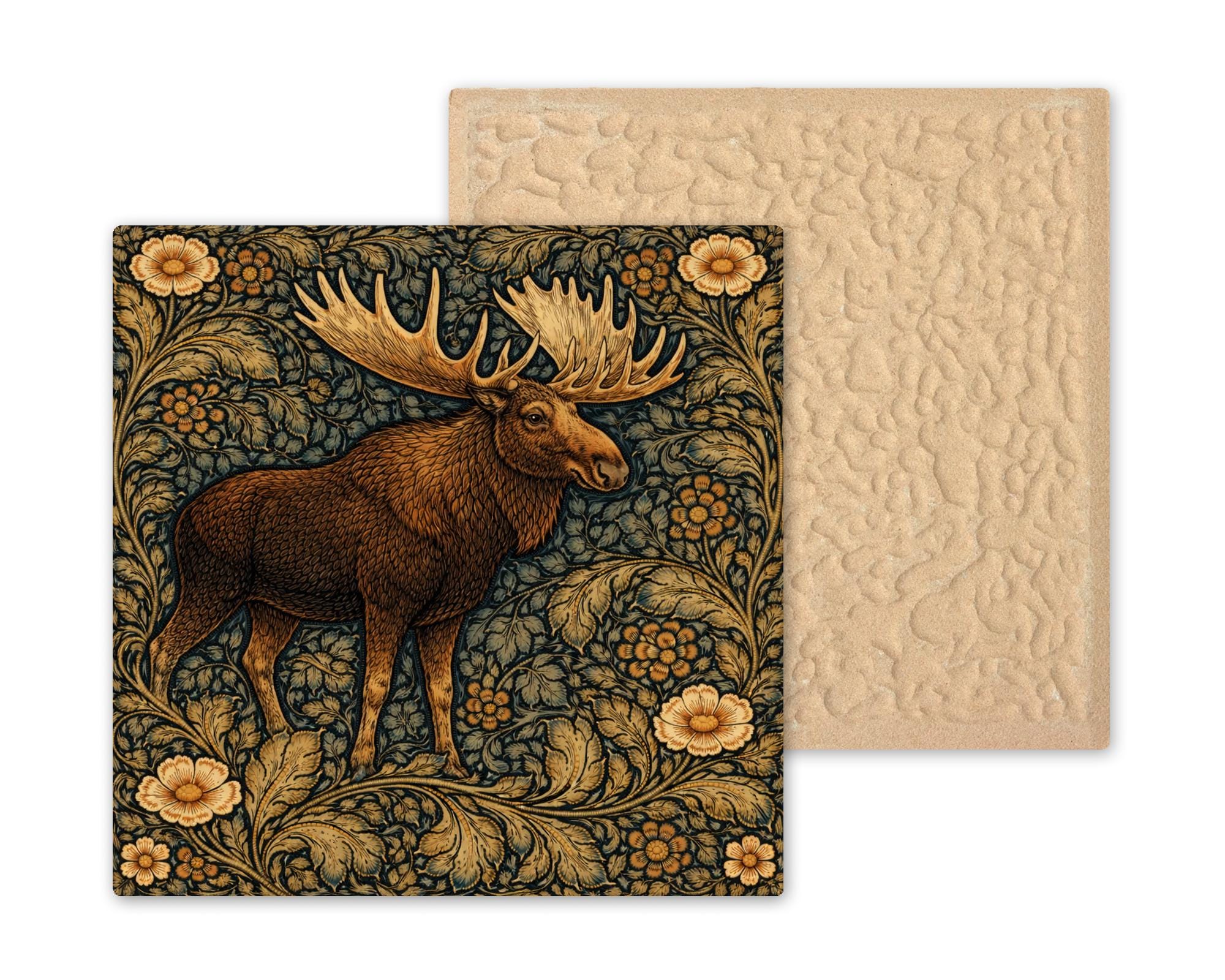 This moose ceramic tile was designed for customers who love northern wildlife and rustic interiors. The strong silhouette of the moose combined with the flowing botanical background creates a balance between wildlife art and decorative pattern.