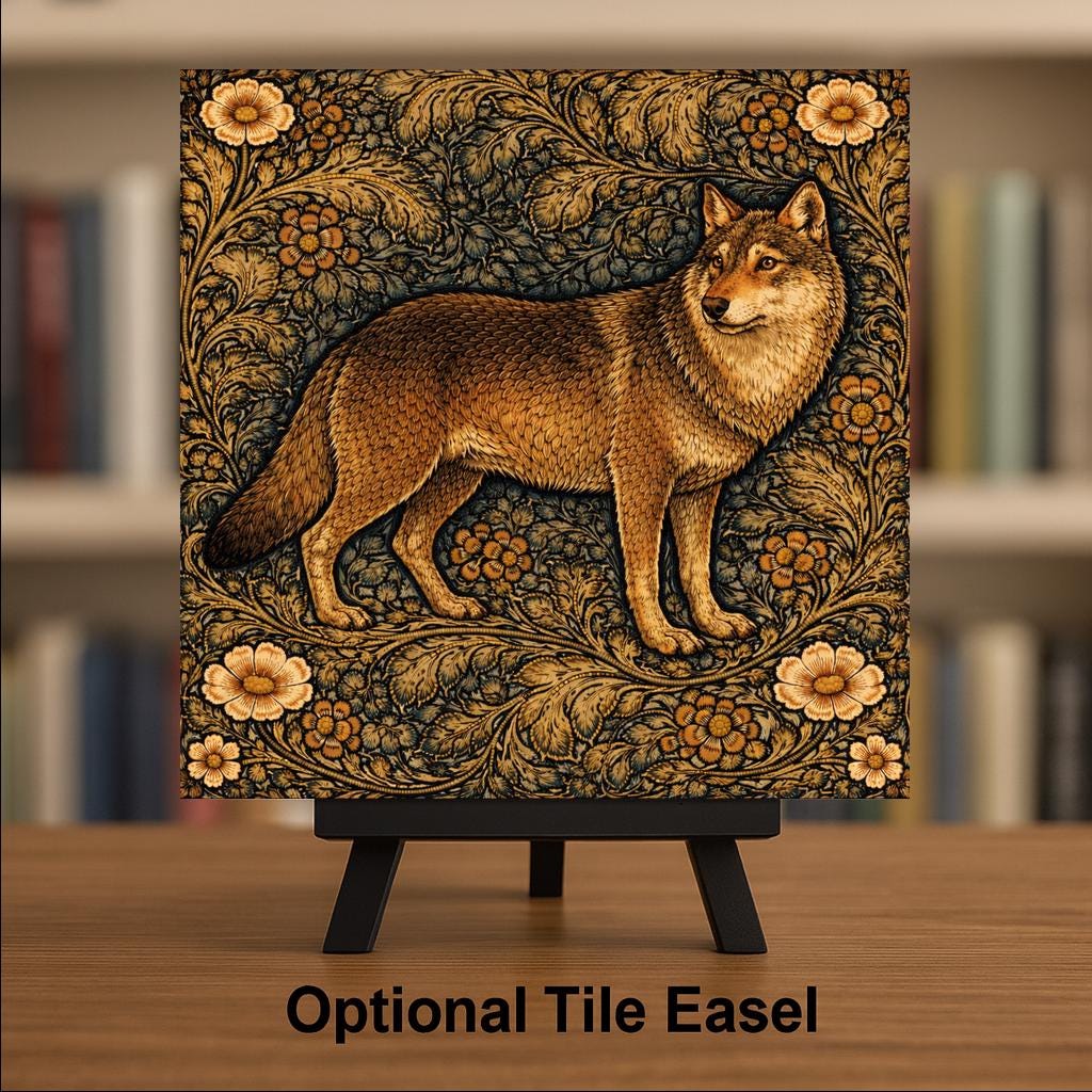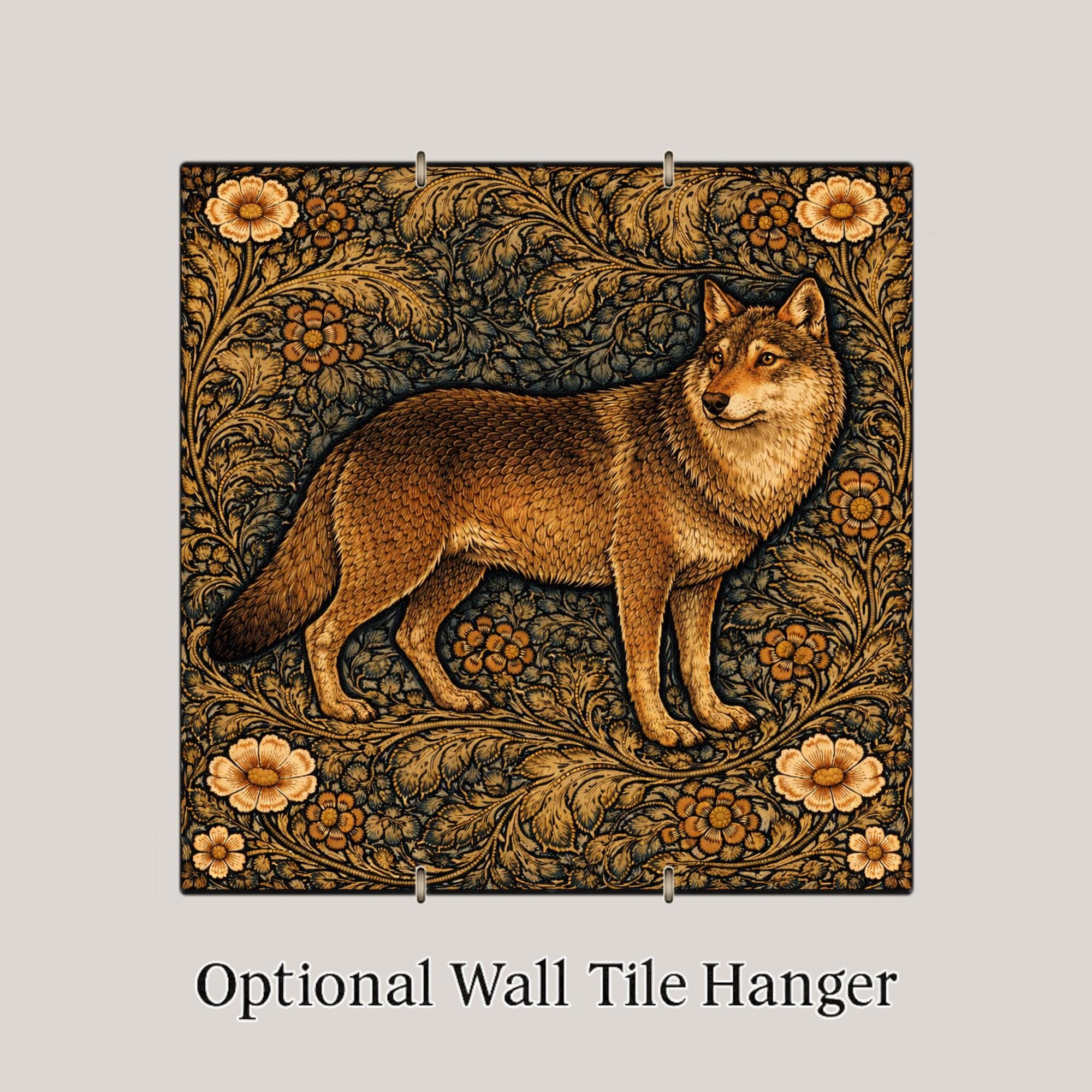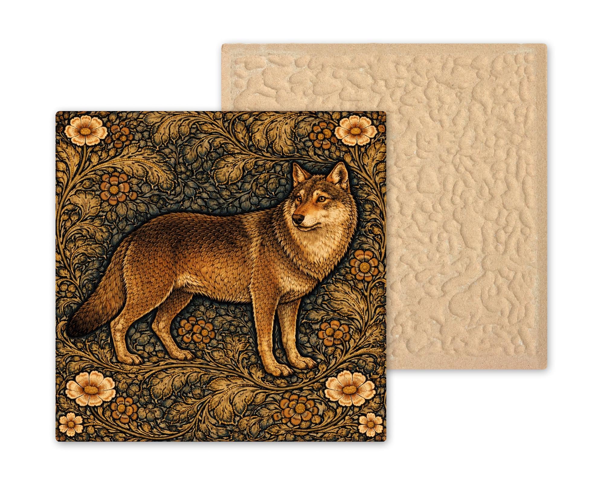 The flowing foliage creates movement around the wolf while the earthy color palette keeps the piece grounded in nature. This balance between wildlife and decorative pattern makes the tile both artistic and timeless.
