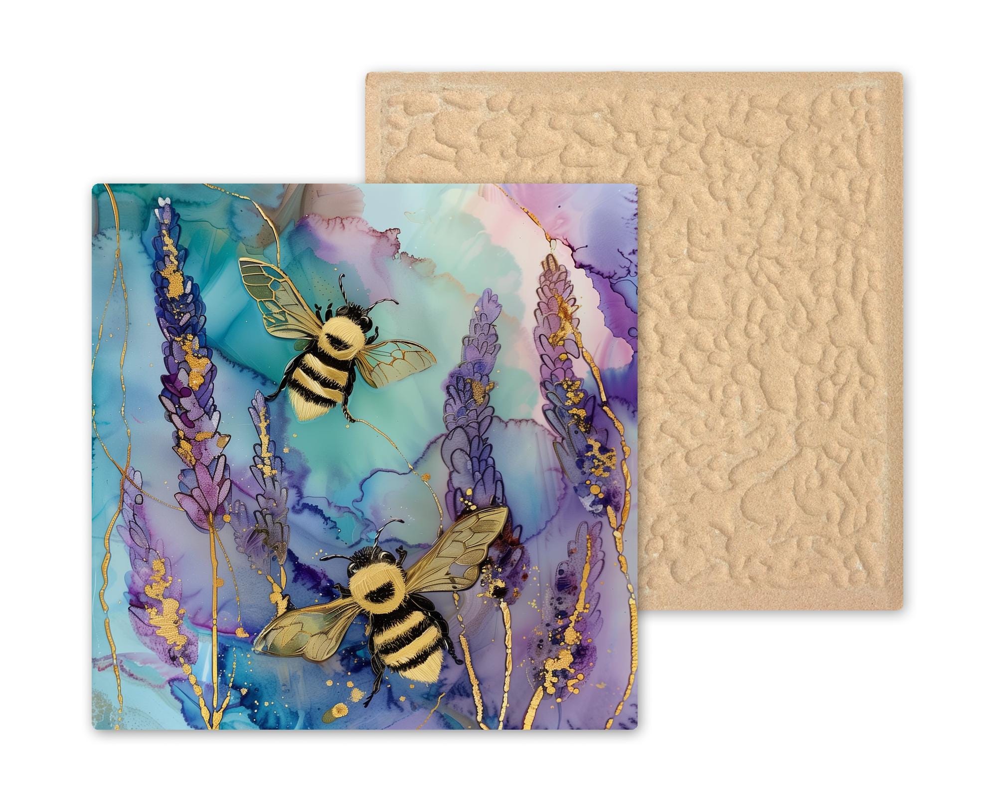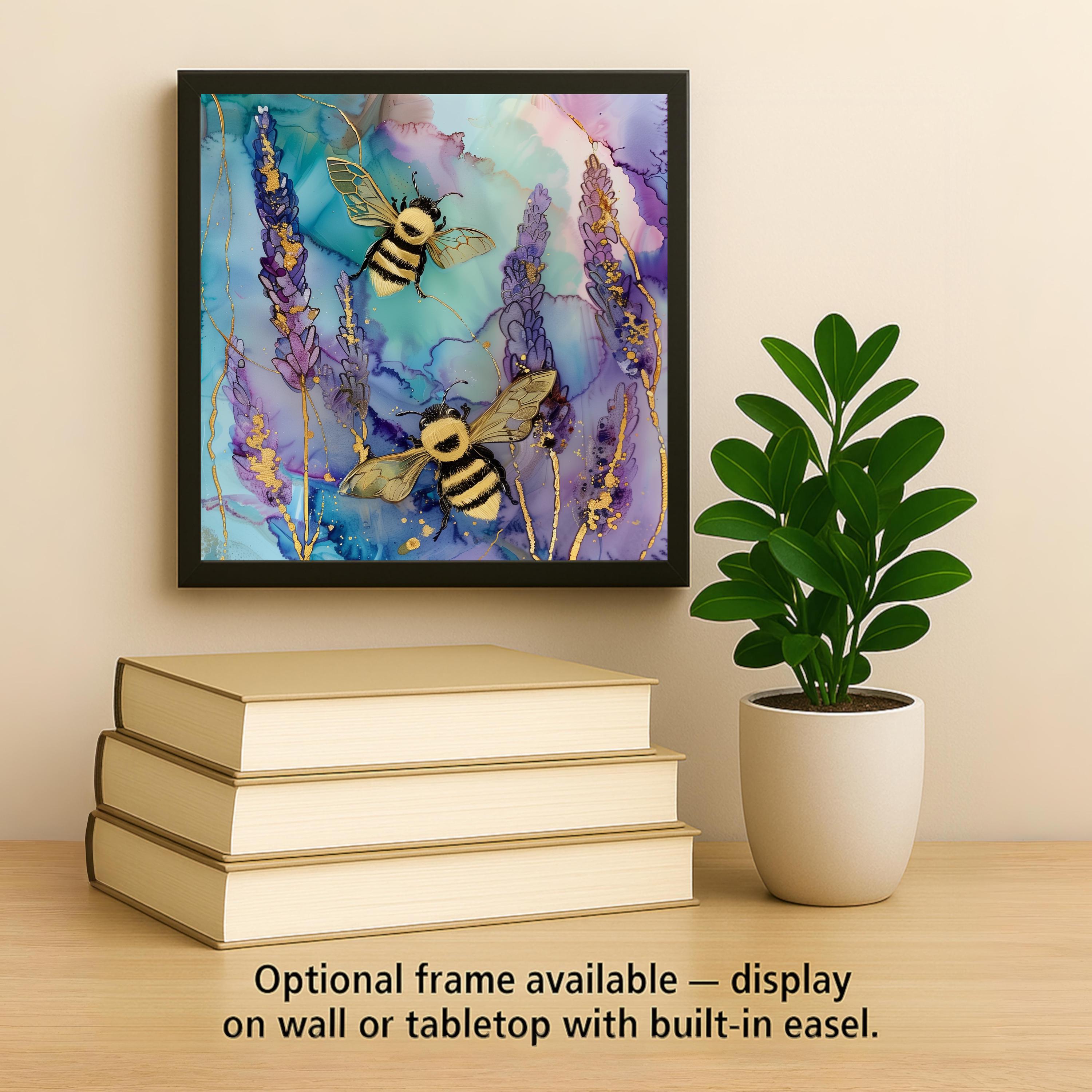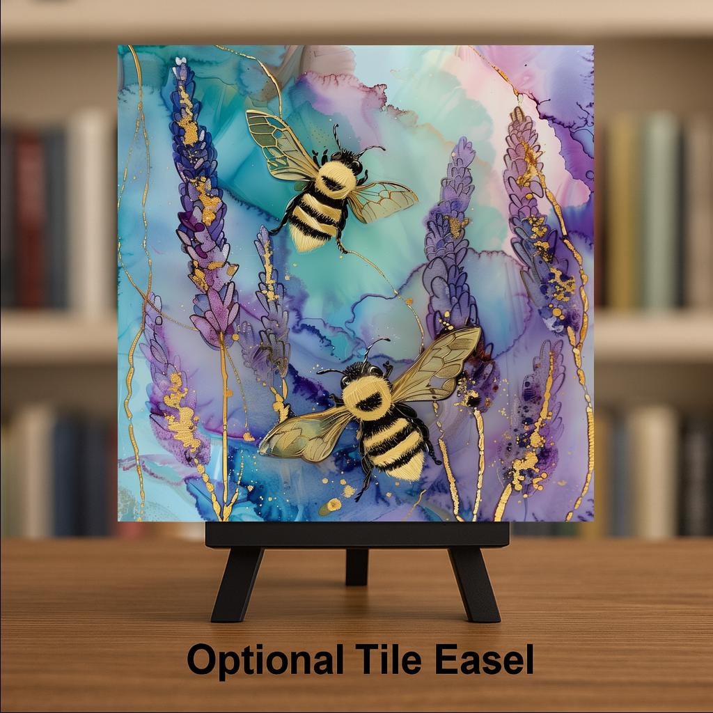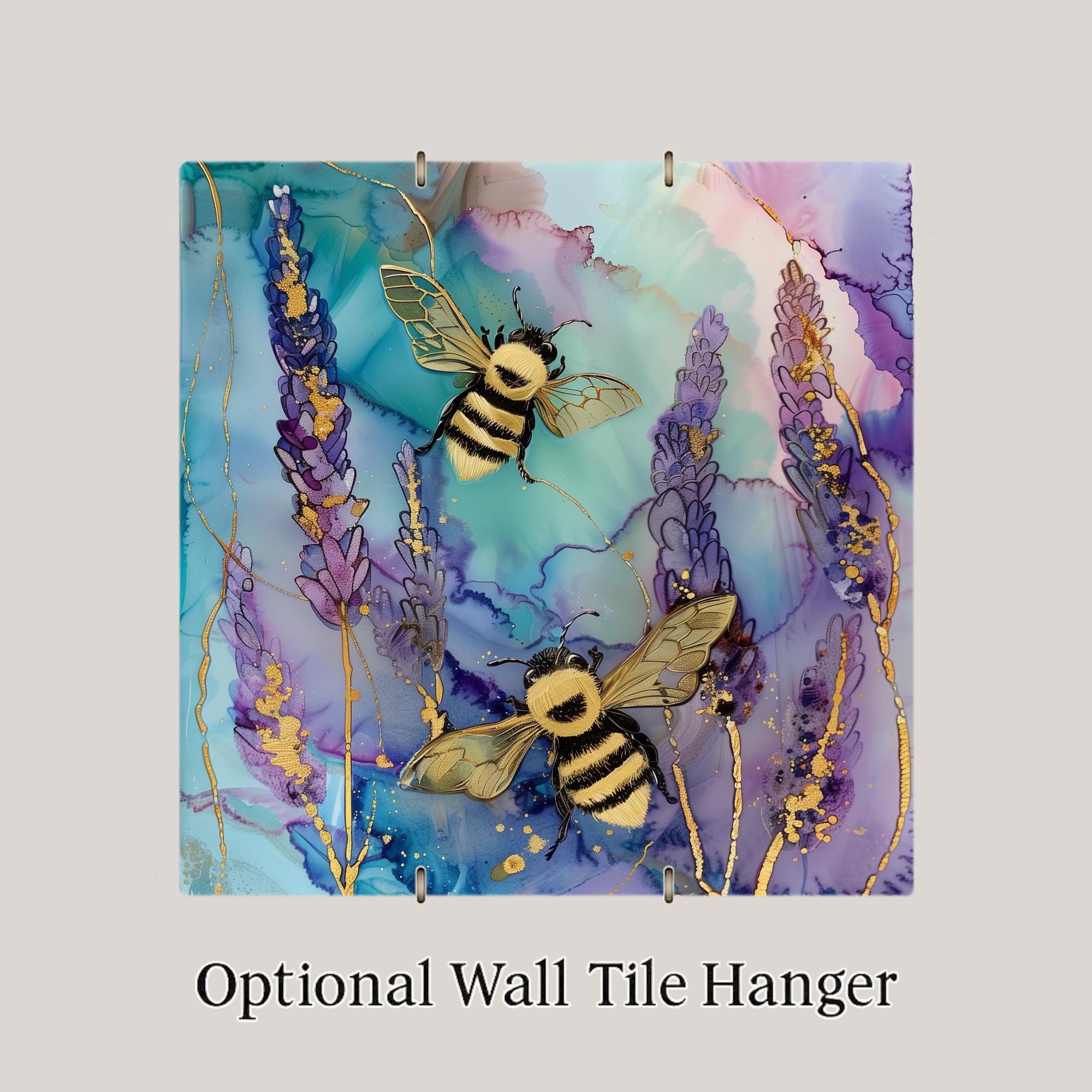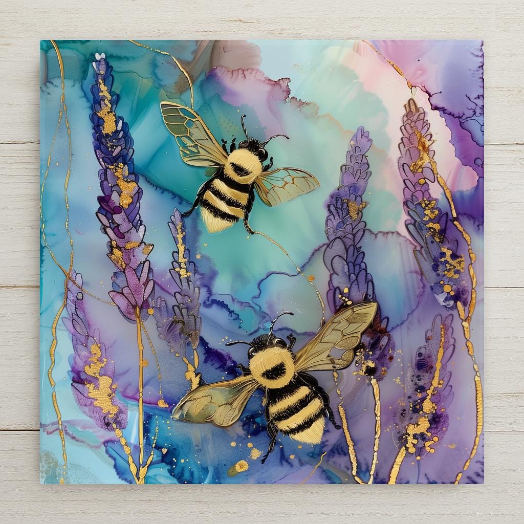 Soft color, natural movement, and quiet detail come together in this lavender bee design. Inspired by blooming fields and pollinator life, this piece captures a peaceful moment where bees drift through delicate purple florals. The flowing alcohol ink background adds depth and motion, while subtle gold accents elevate the overall look.