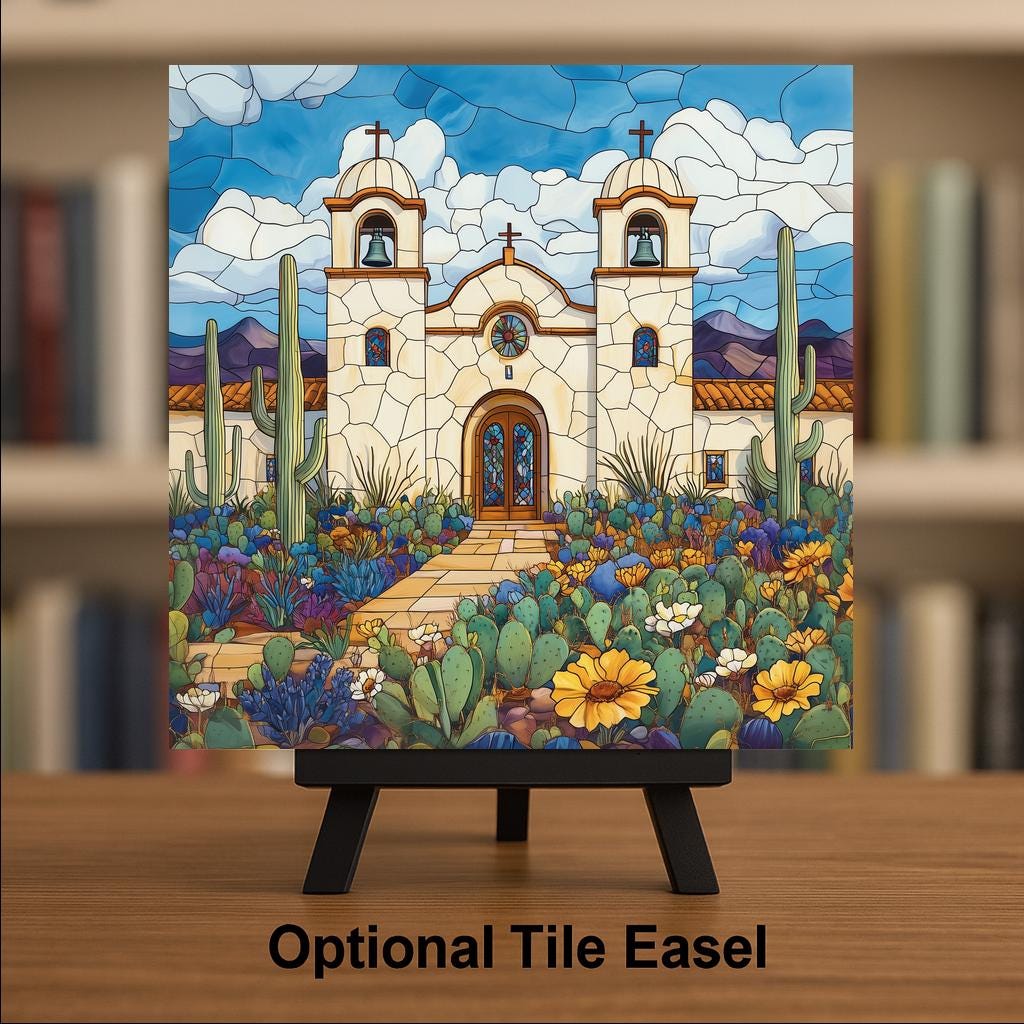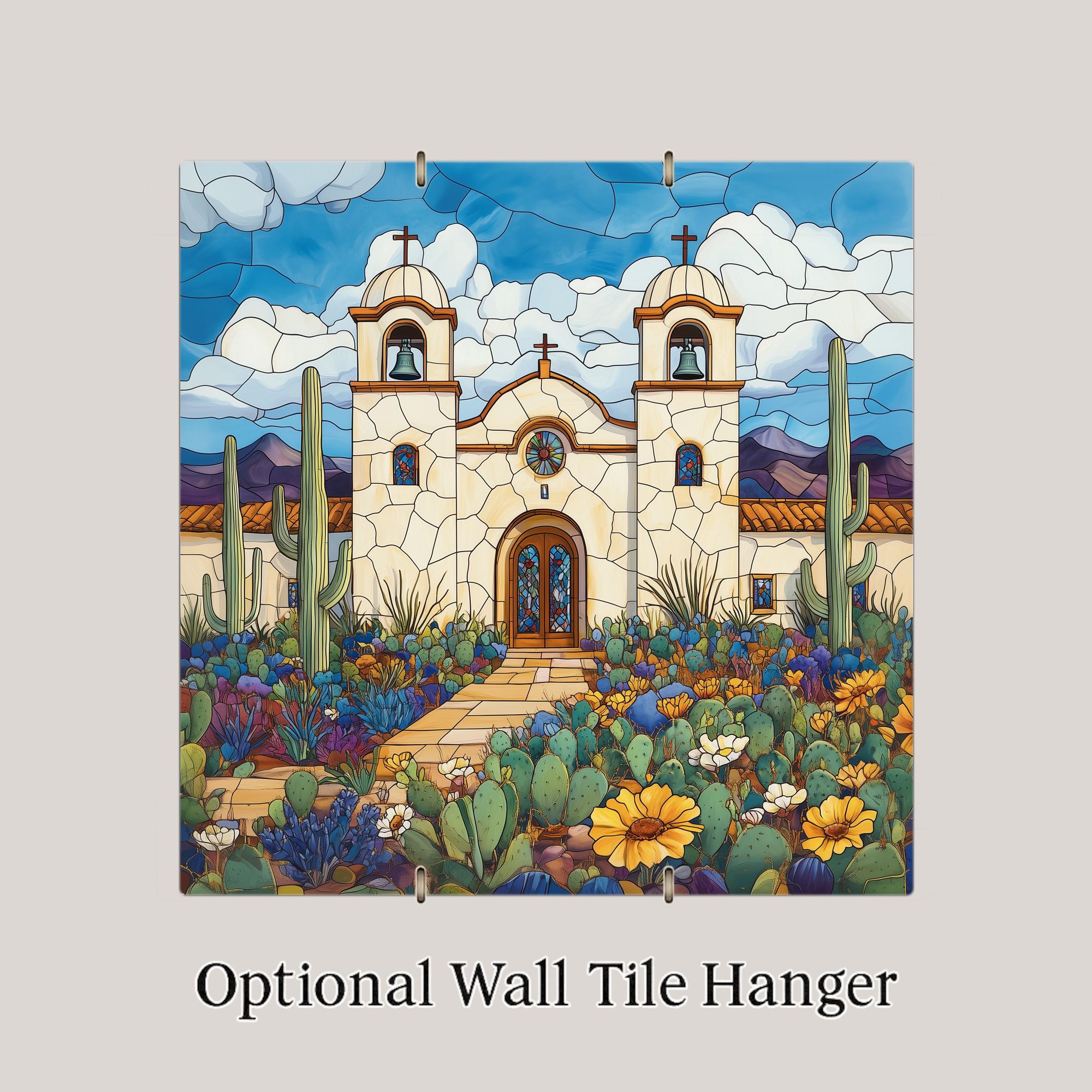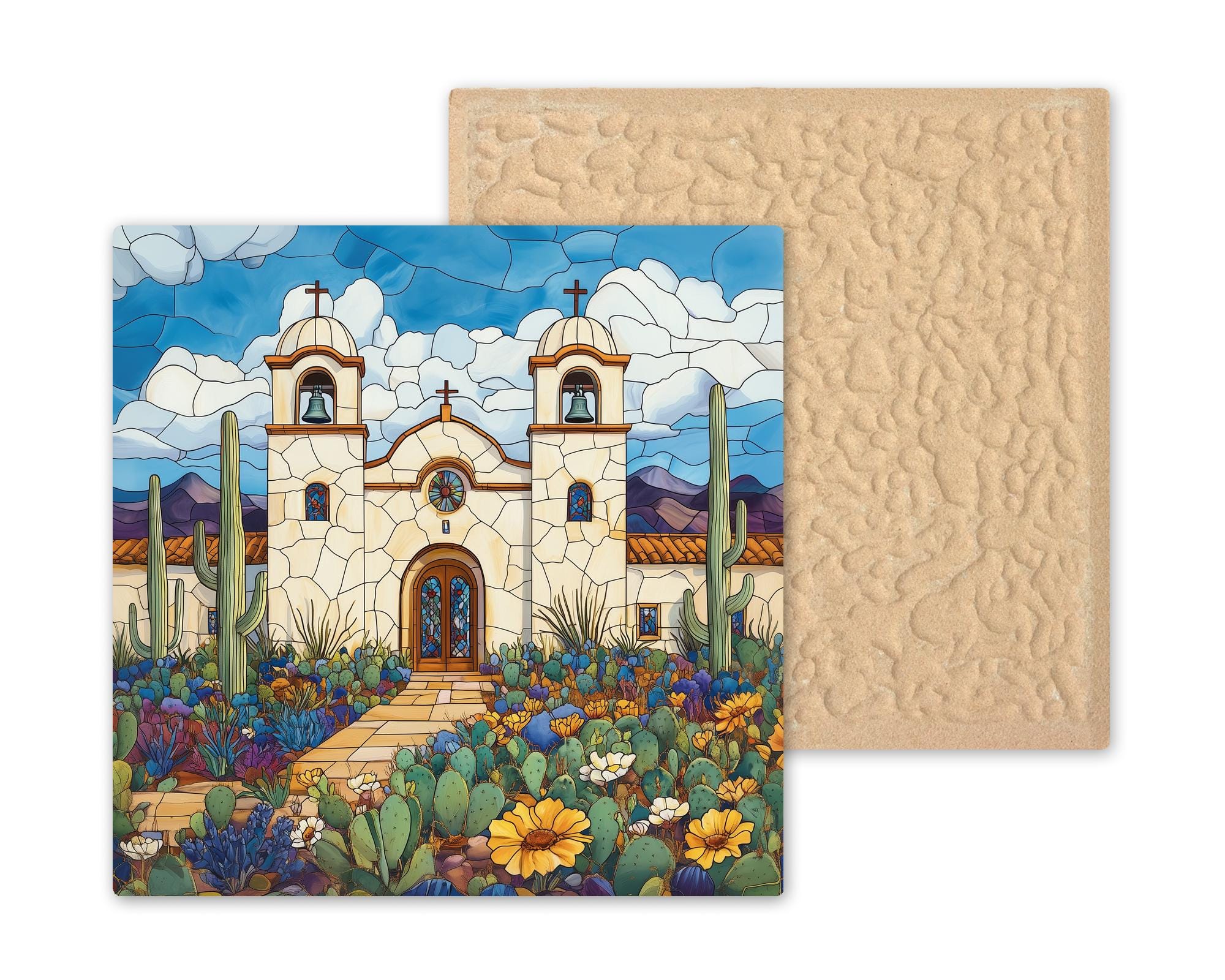 This Spanish mission ceramic tile was designed for buyers who love Southwest architecture, desert landscapes, and the cultural history of the American West. The twin bell towers, arched mission doorway, and blooming desert foreground give the piece strong visual identity without being tied to a single named location — it reads as the soul of every mission church from California to Texas to New Mexico.