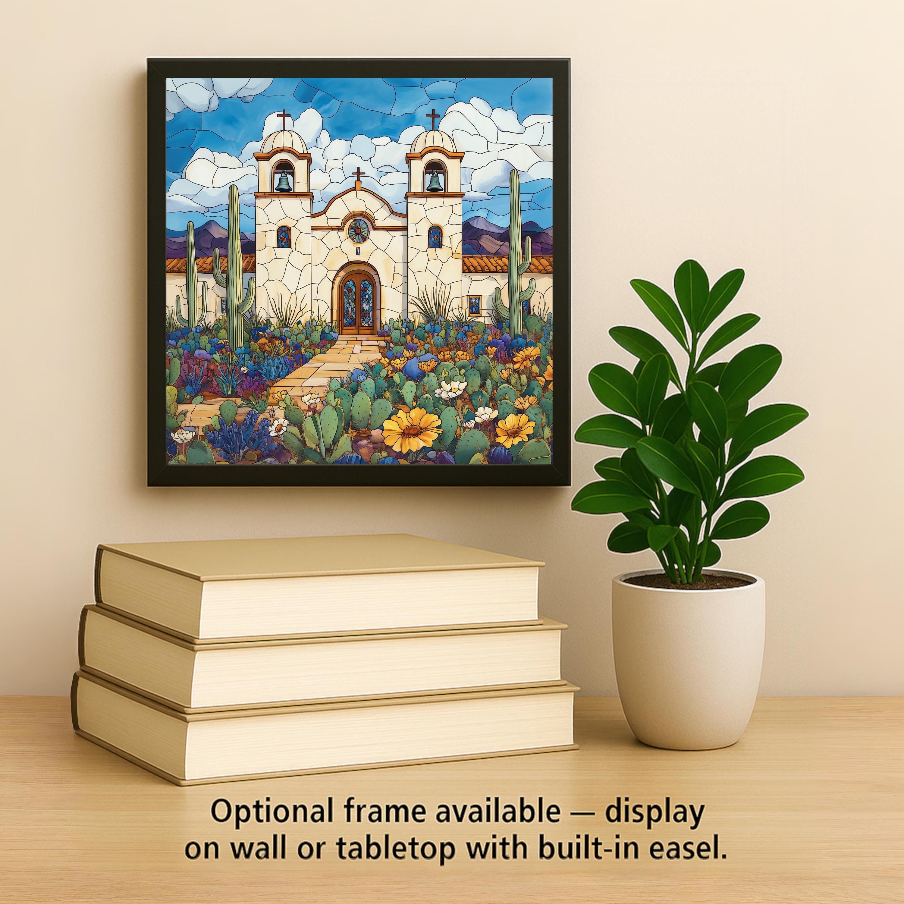 It makes a strong gift for Southwest travelers, Catholic home decorators, Arizona and New Mexico residents, Santa Fe style interior lovers, and anyone drawn to the color and warmth of desert art. The stained glass treatment adds richness and depth that a photograph or flat print cannot replicate.