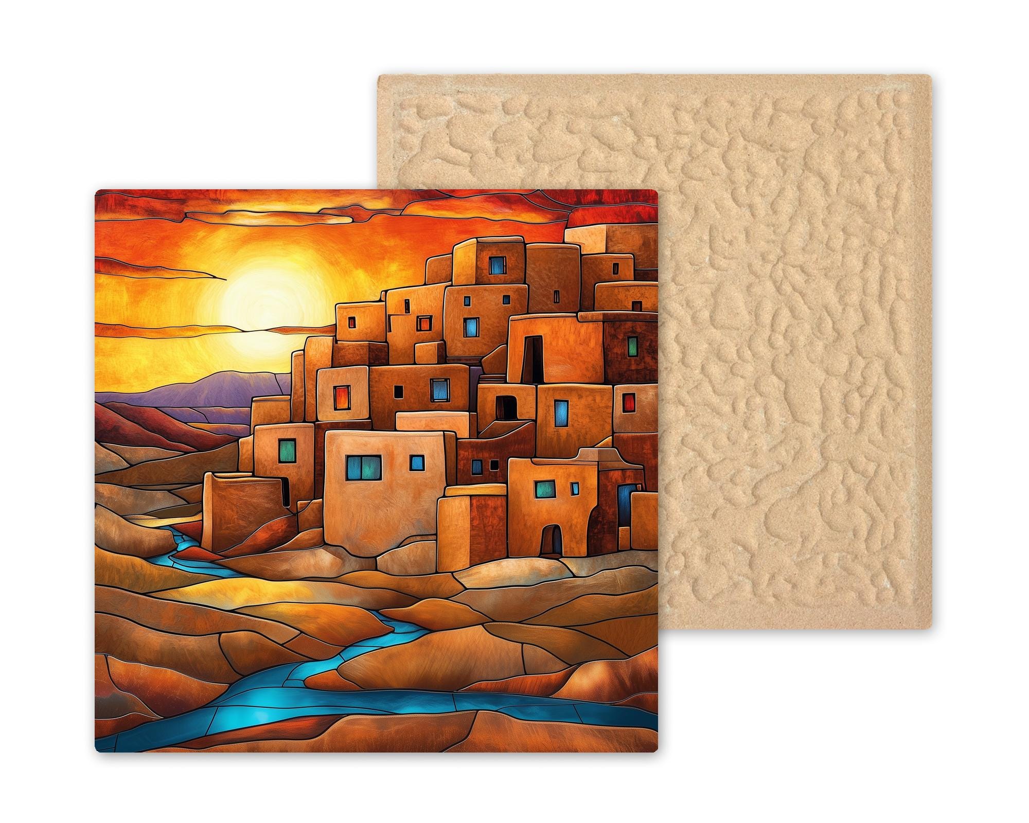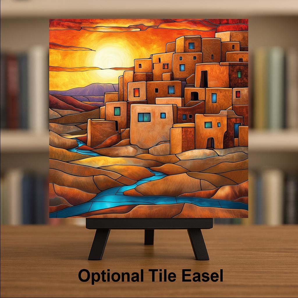 This Taos Pueblo ceramic tile was designed for buyers who want Southwest wall art with genuine cultural weight and visual drama. The ancient multi-story adobe architecture, the blazing desert sunset, and the turquoise river together tell a story that resonates deeply with anyone who has stood in the high desert of New Mexico and felt its pull.