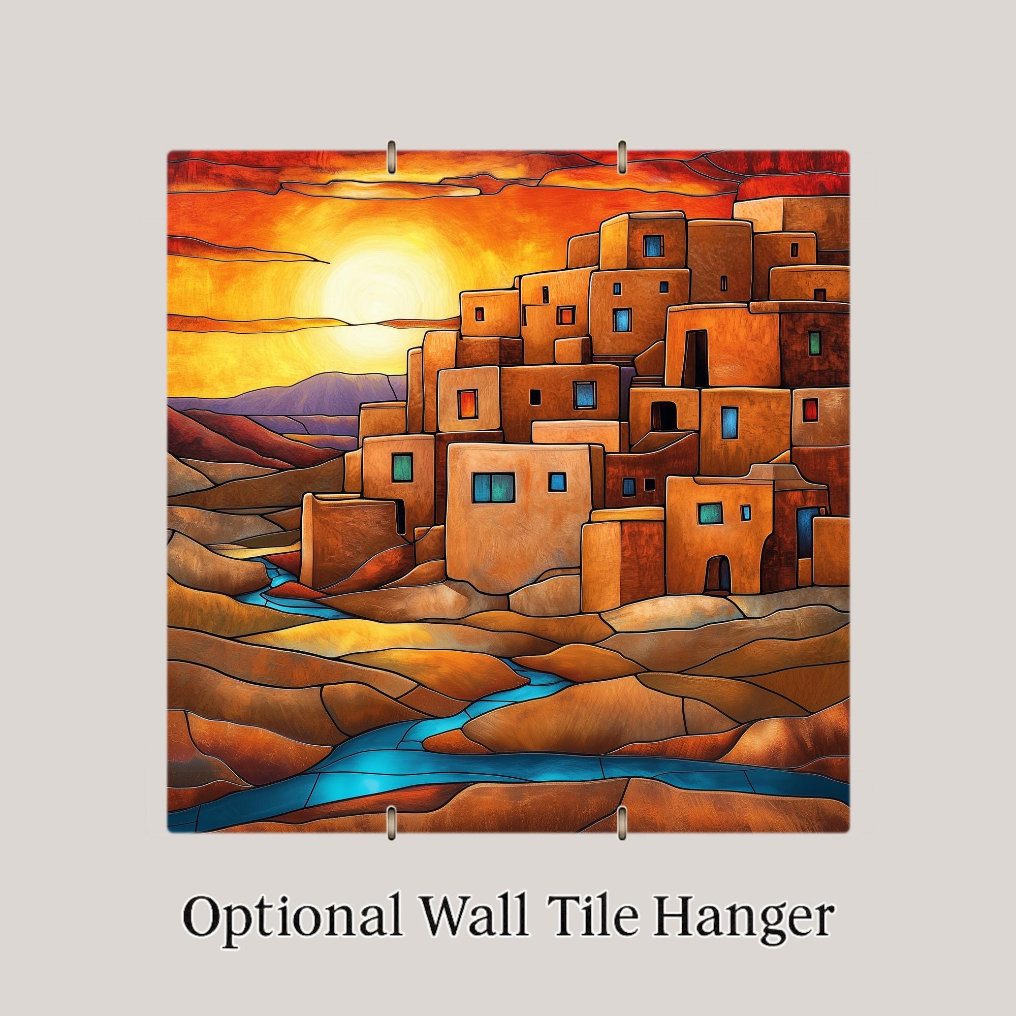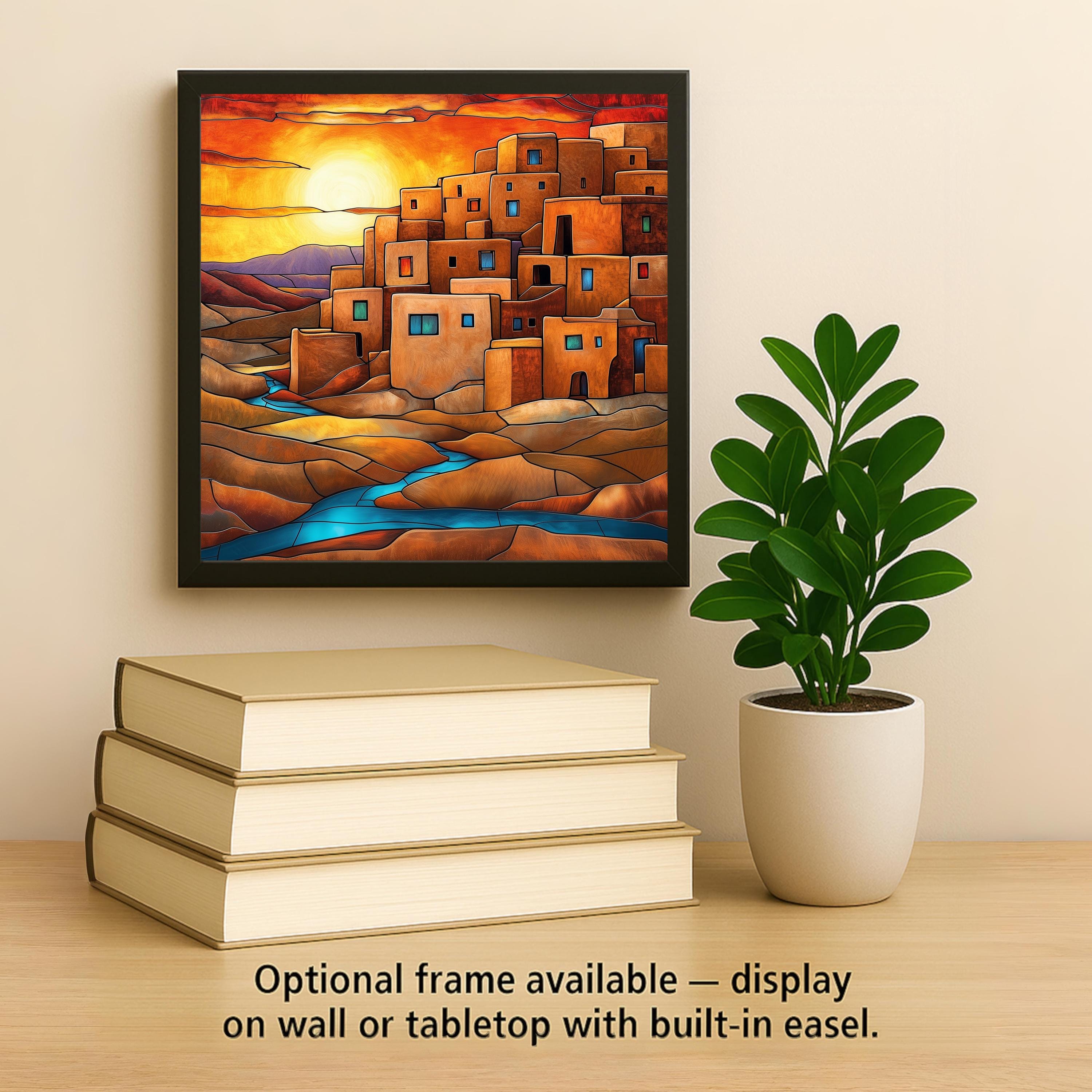 It makes a strong gift for Taos and Santa Fe visitors, New Mexico natives, Southwest art collectors, boho home decorators, and anyone drawn to the earthy palette and rich cultural heritage of pueblo architecture. The stained glass style gives a timeless subject an unexpected luminous treatment that makes it stand apart from photography and standard illustration.