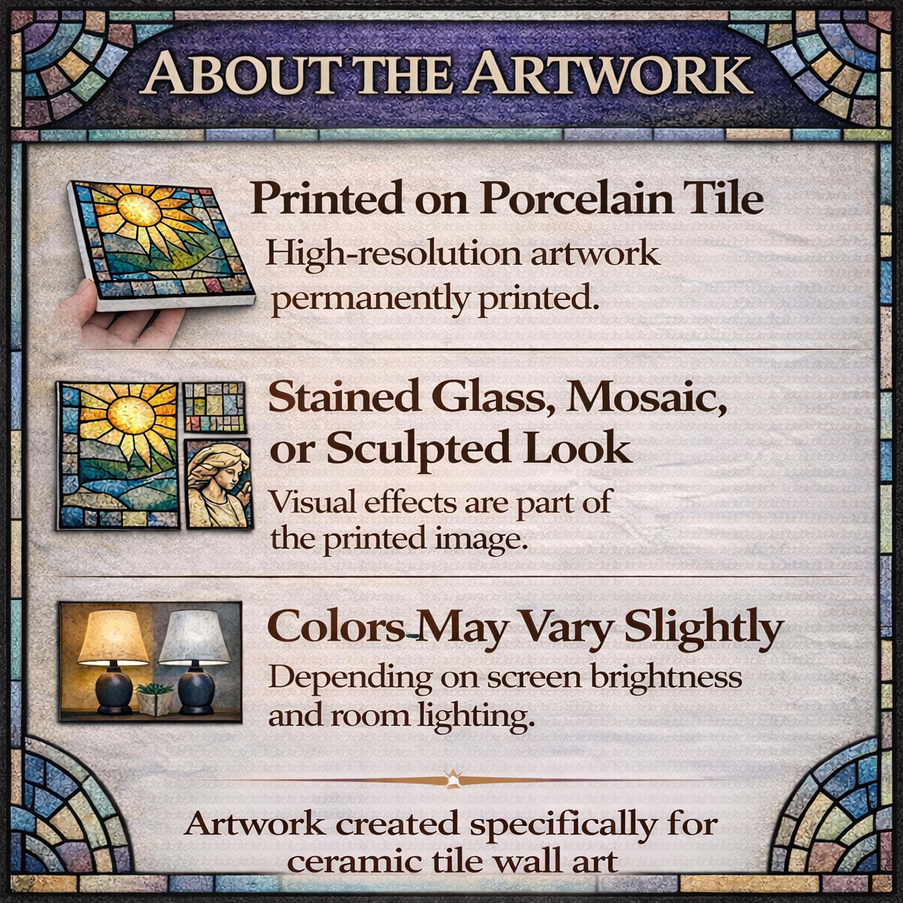 Although it has the look of stained glass, the artwork is permanently infused into the tile surface, creating a smooth finish with vivid color and fine botanical and feather detail.