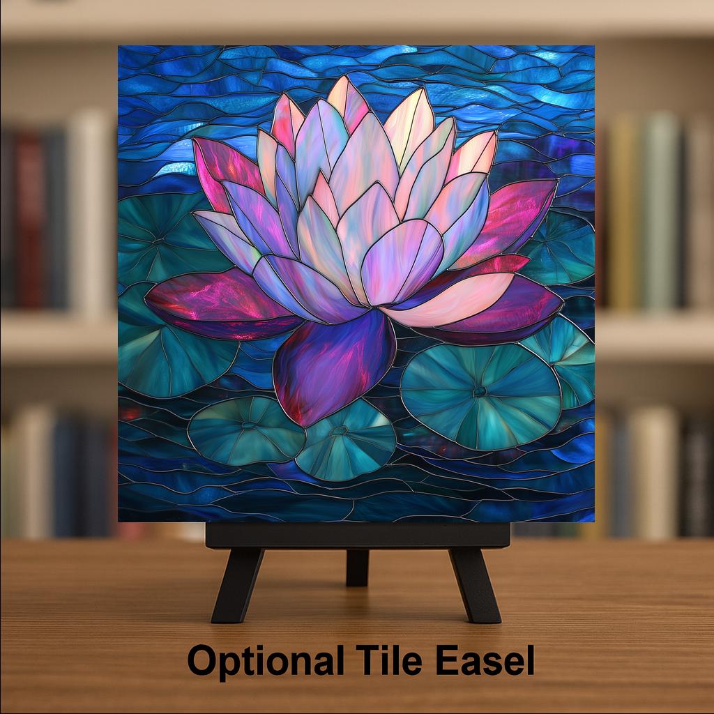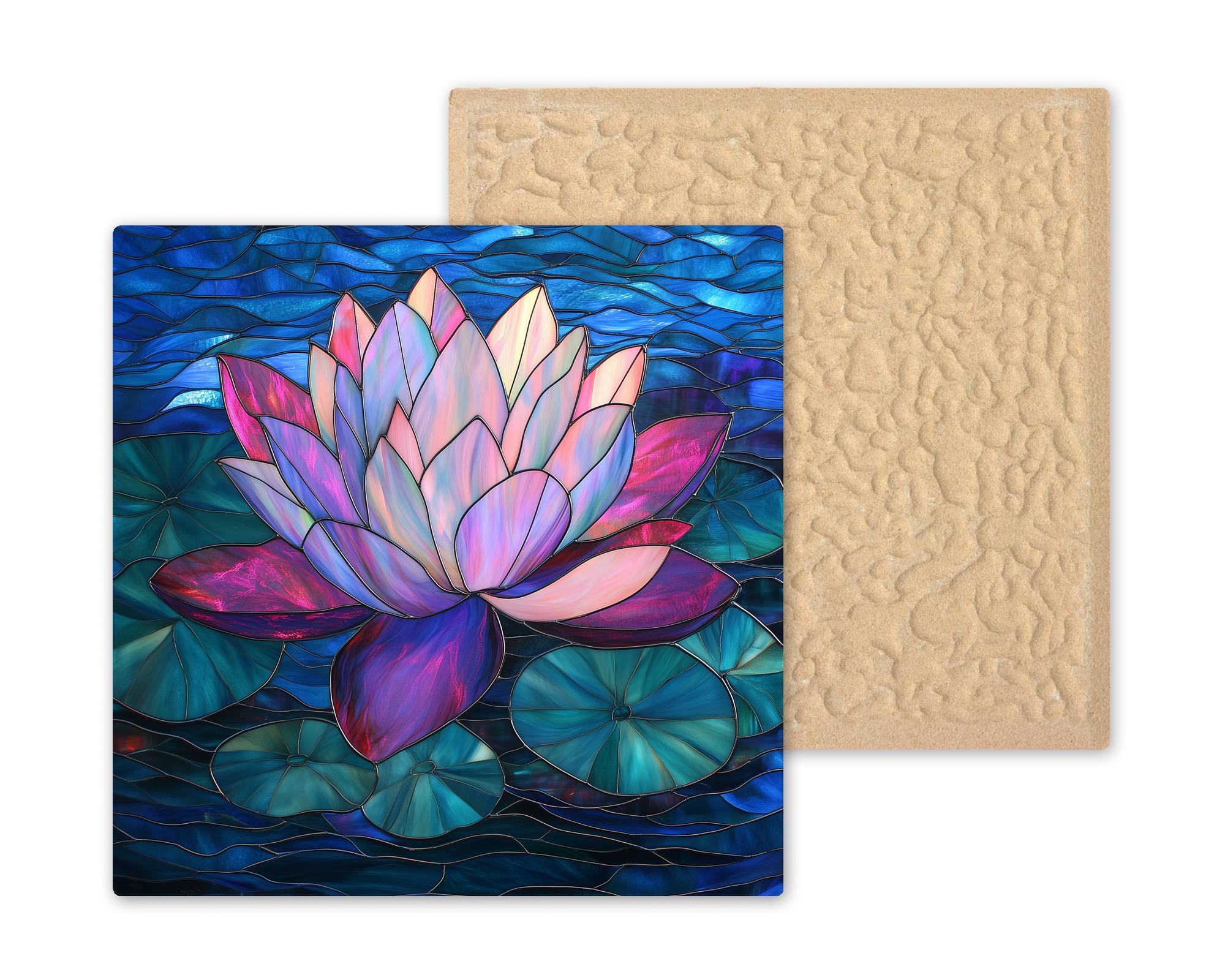 Although it has the look of stained glass, the artwork is permanently infused into the tile surface, creating a smooth finish with vivid color and fine botanical water detail.