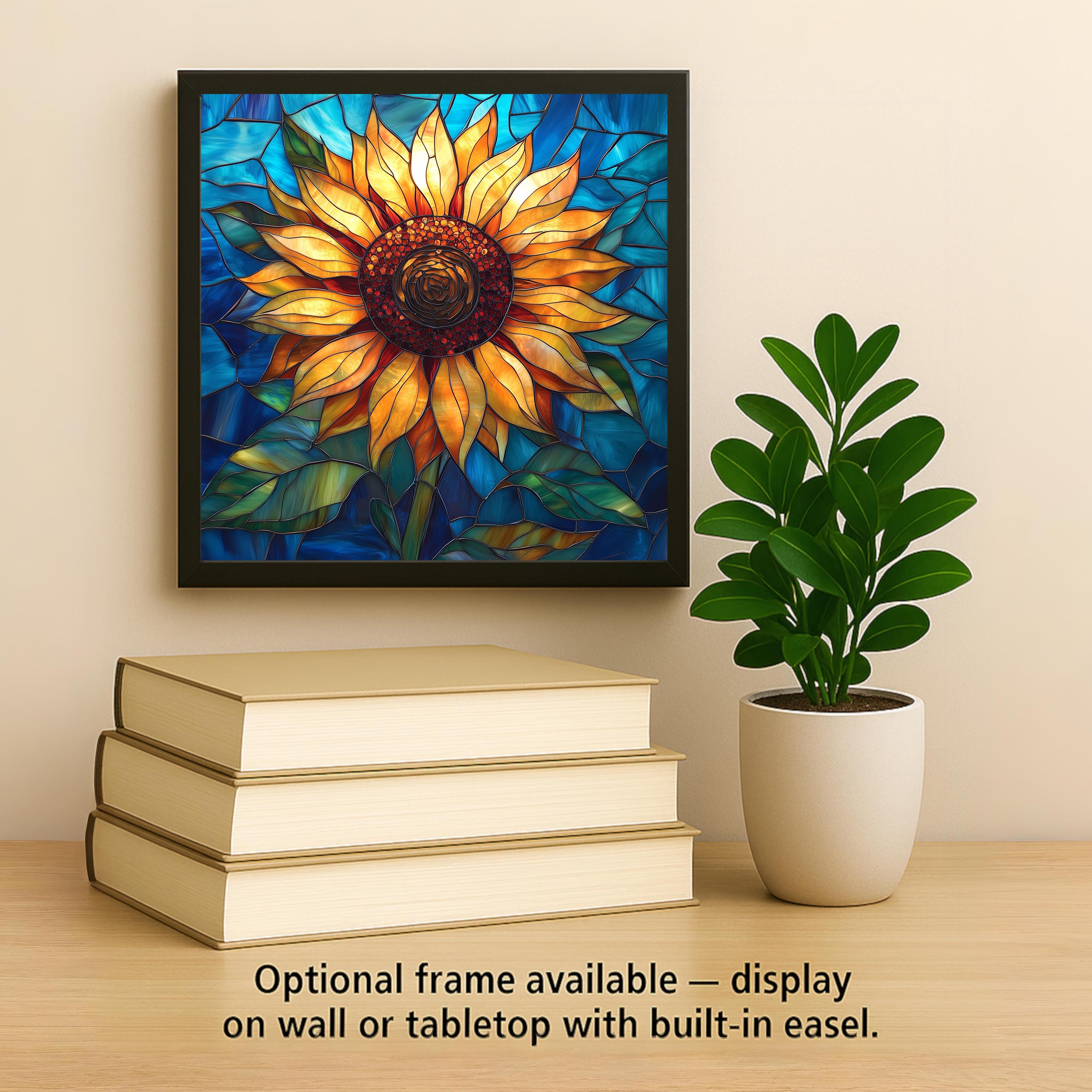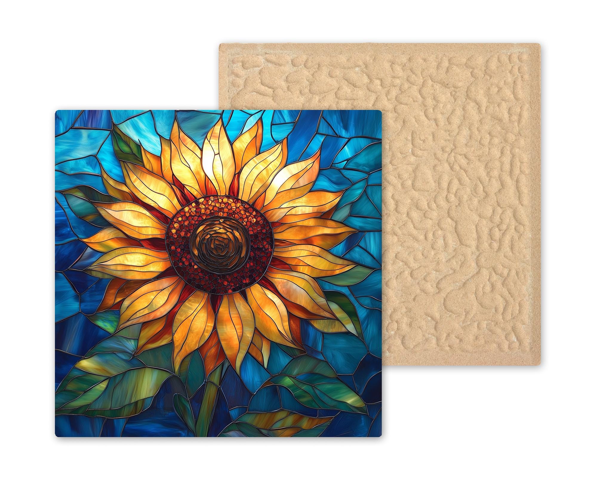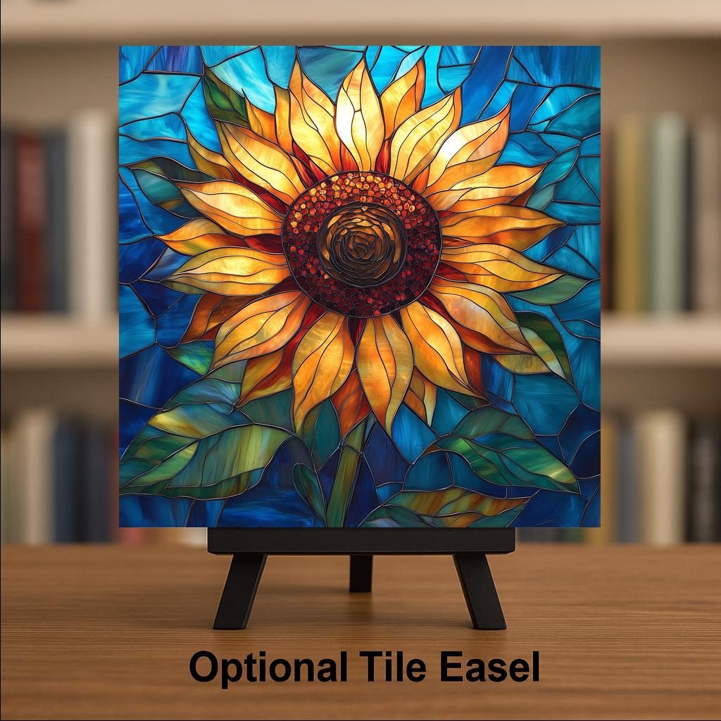 This sunflower ceramic tile was designed for the kitchen decorator first — and your review data confirms that kitchen is your most common placement room. A sunflower on a kitchen windowsill in the cobalt and warm gold stained glass palette brings the energy of a late summer garden into the room every morning. It works as a standalone statement piece or as part of a coordinated floral kitchen series alongside the bee and lavender tiles.