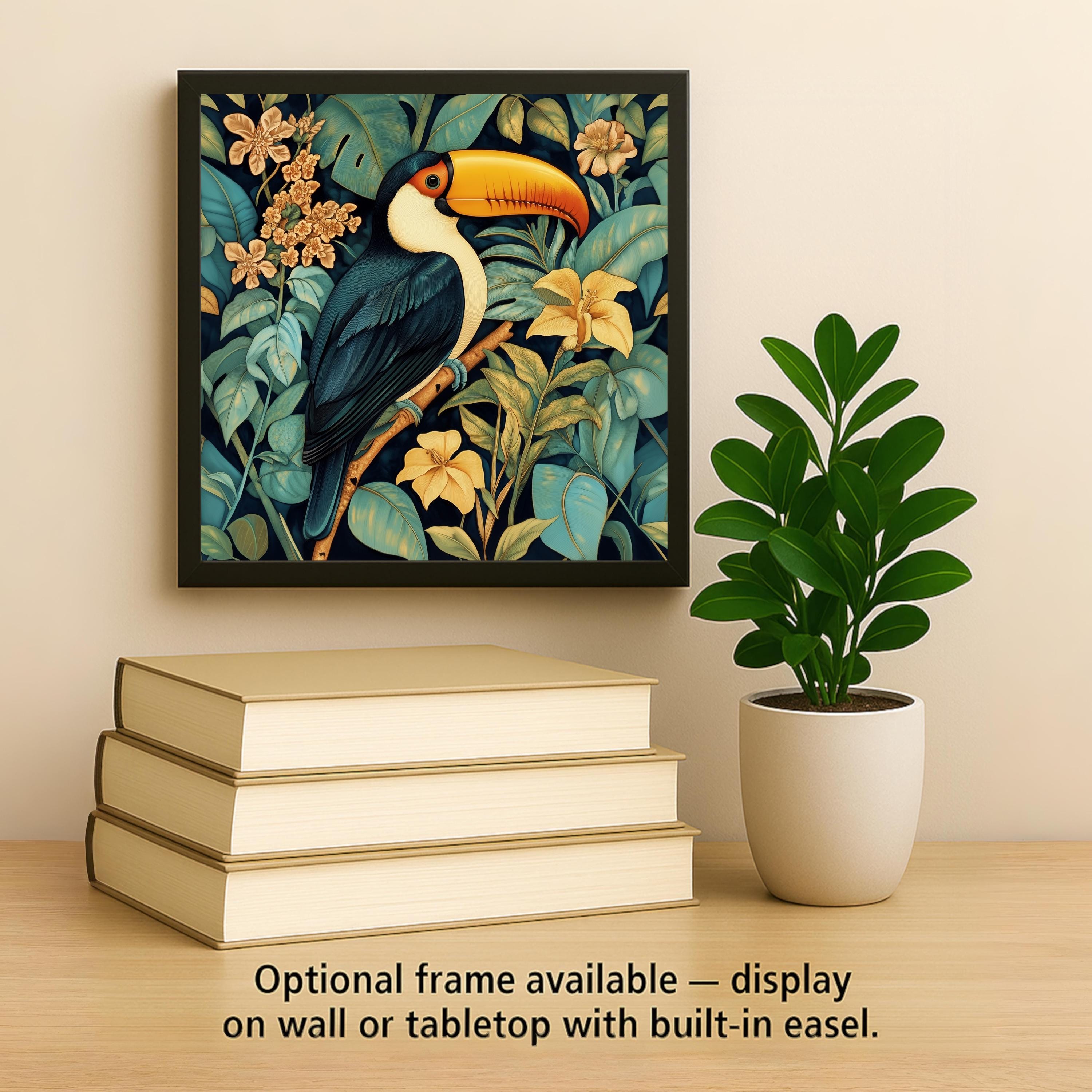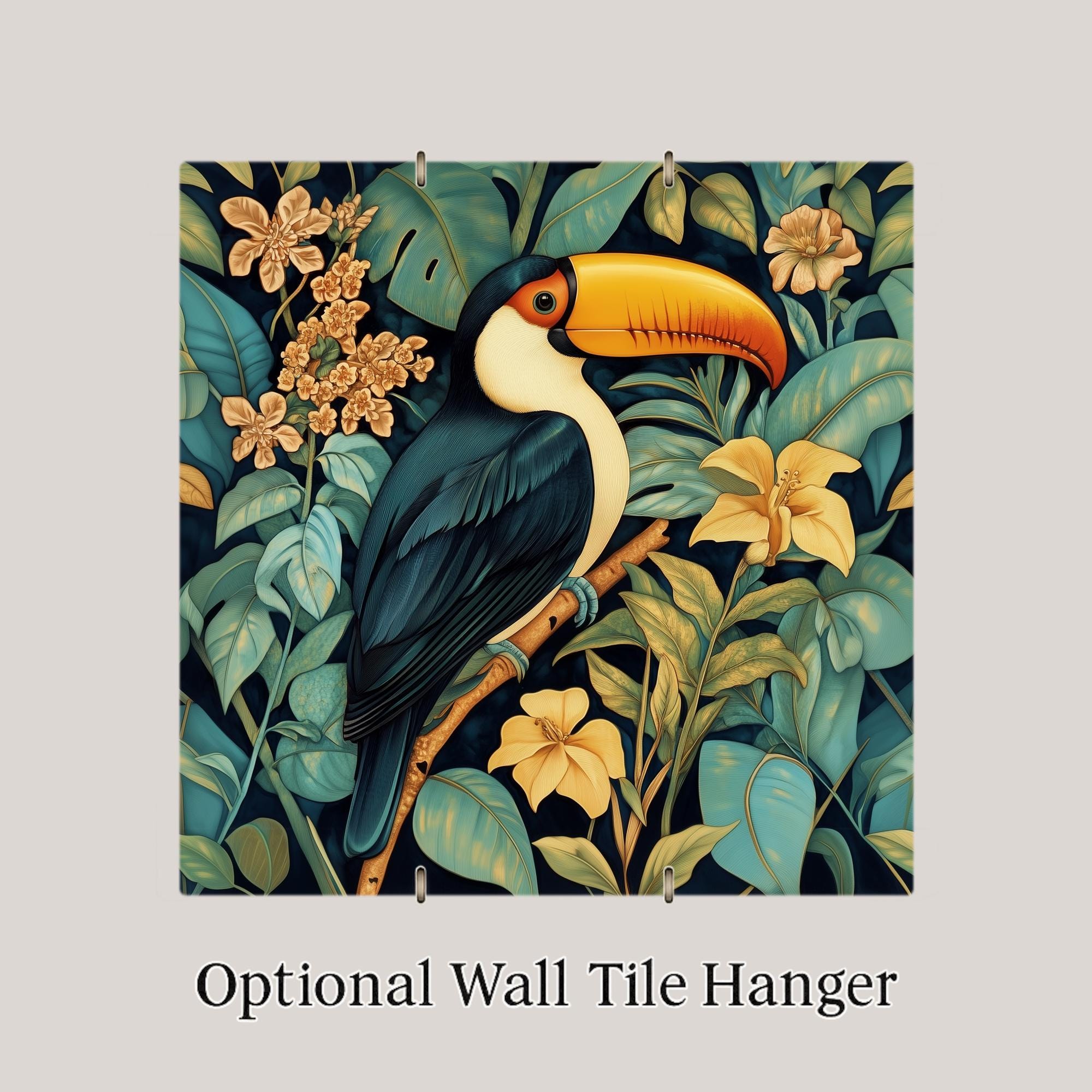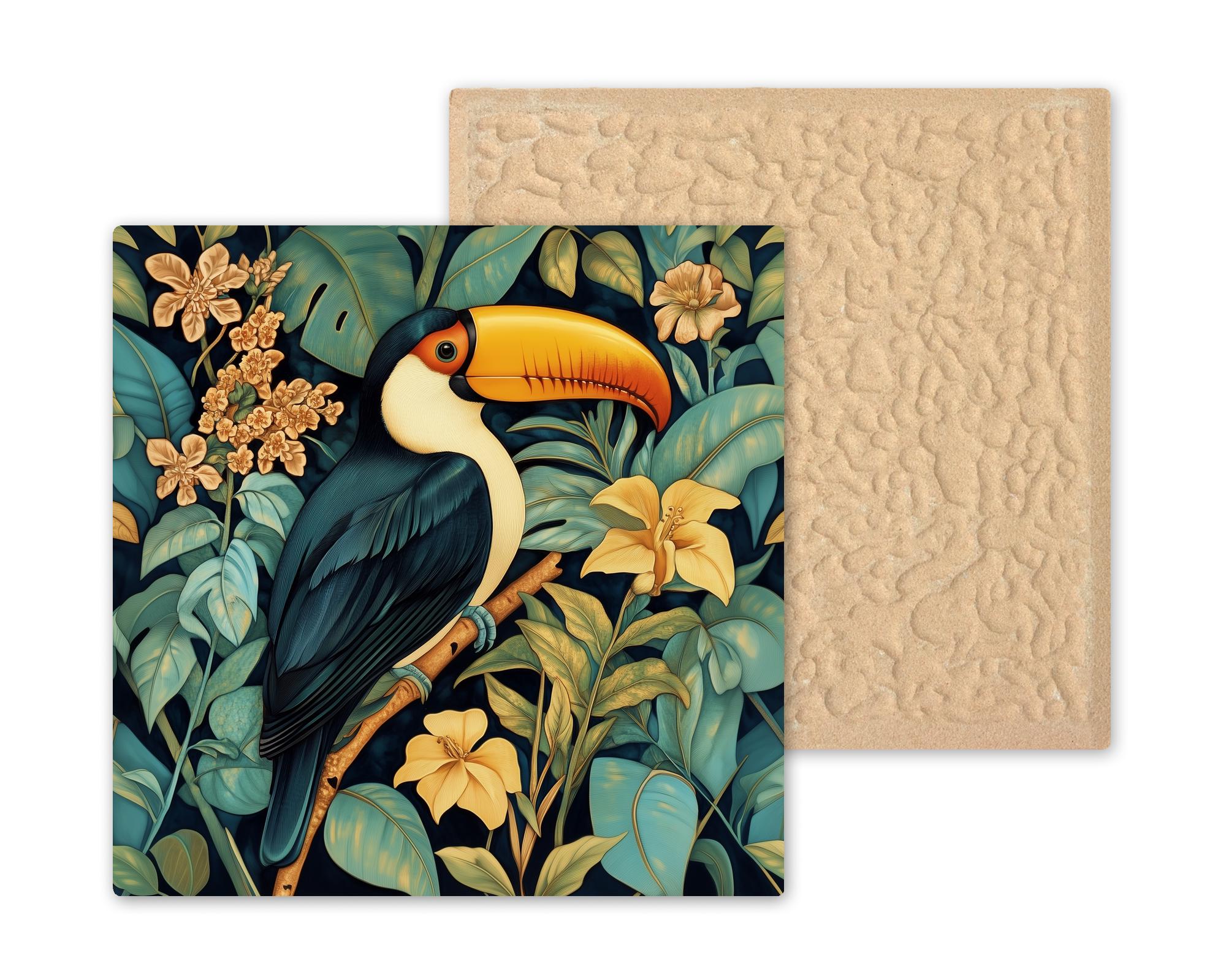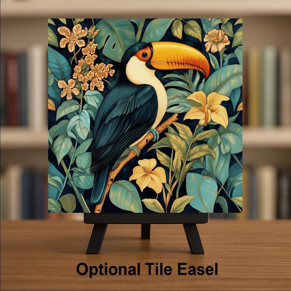 The buyer of this tile wants the toucan in an elevated register — not just a bird print but something that feels like heirloom art. The William Morris botanical style does exactly that, giving a beloved tropical subject the treatment it deserves. It's for the collector who already has the stained glass version and wants a different mood, or the first-time buyer who prefers the heritage aesthetic.