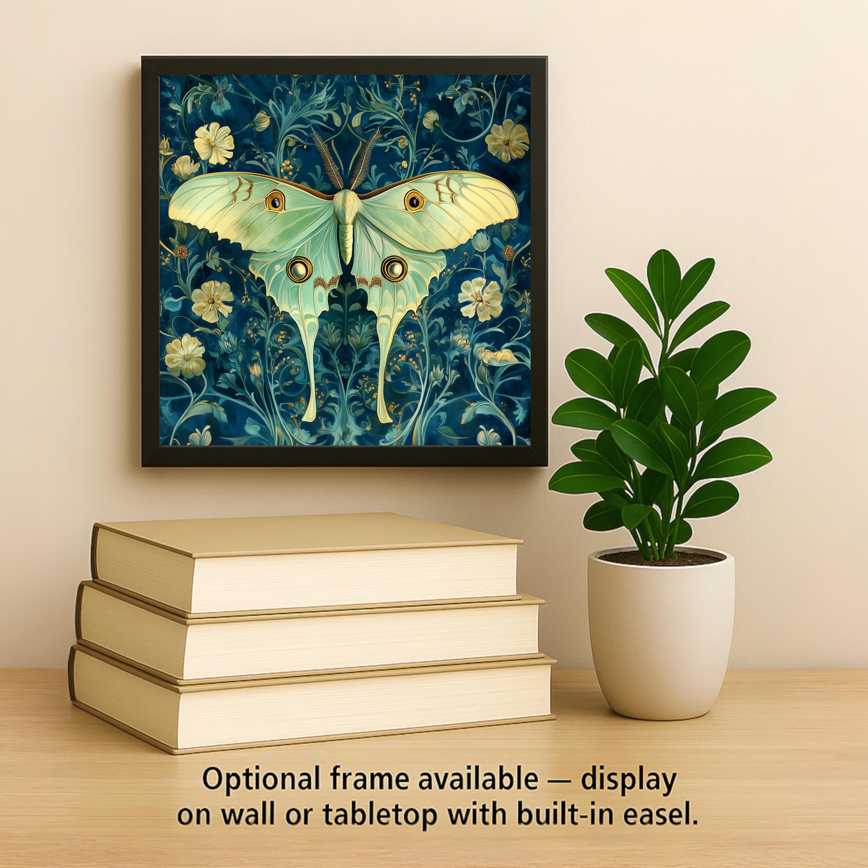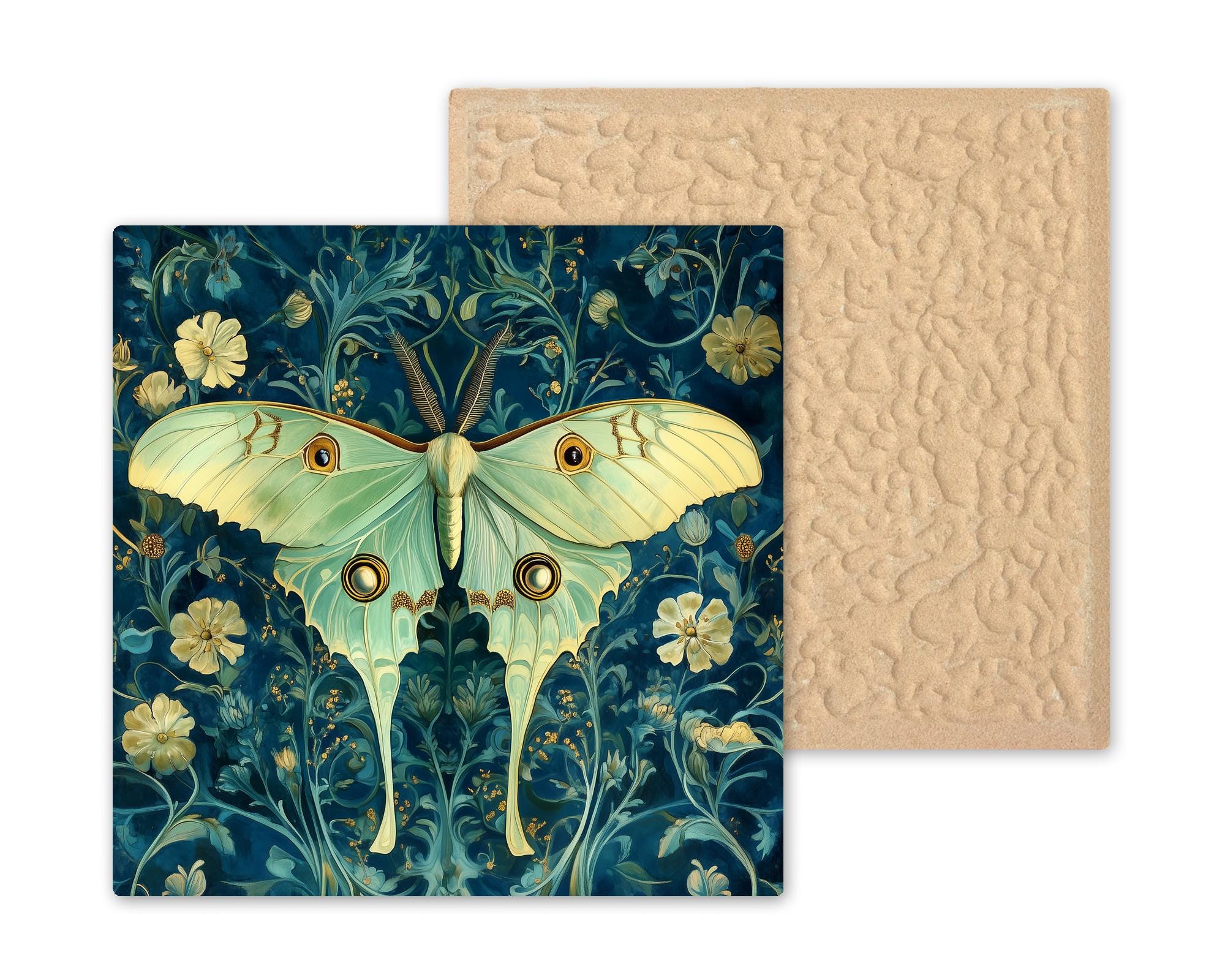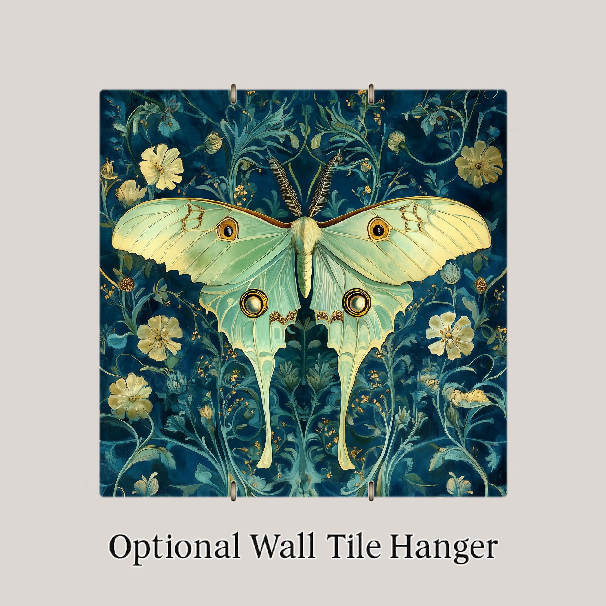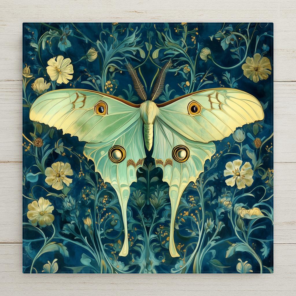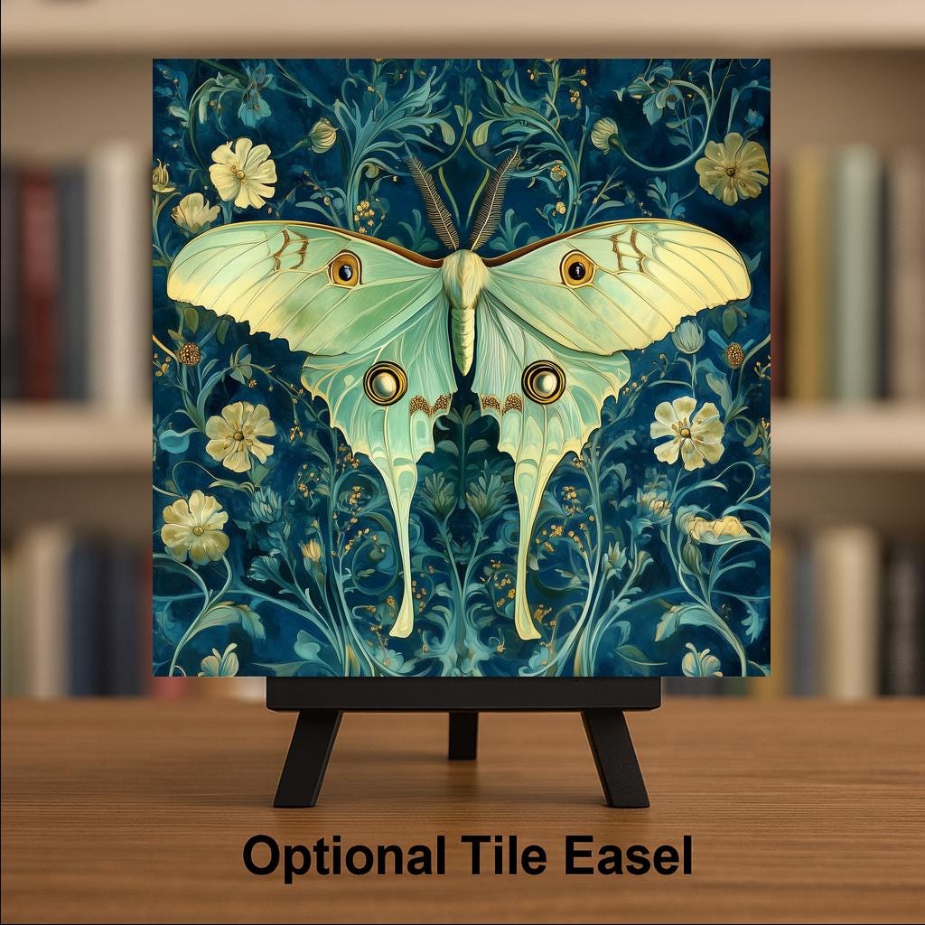 The buyer of this tile wants the luna moth in an elevated, heritage-feeling register — not the midnight magic version but the botanical illustration version. They love the William Morris style and they love luna moths and this tile brings both together. It's for the collector completing a set or the first buyer who prefers organic sinuous beauty to luminous nocturnal drama.