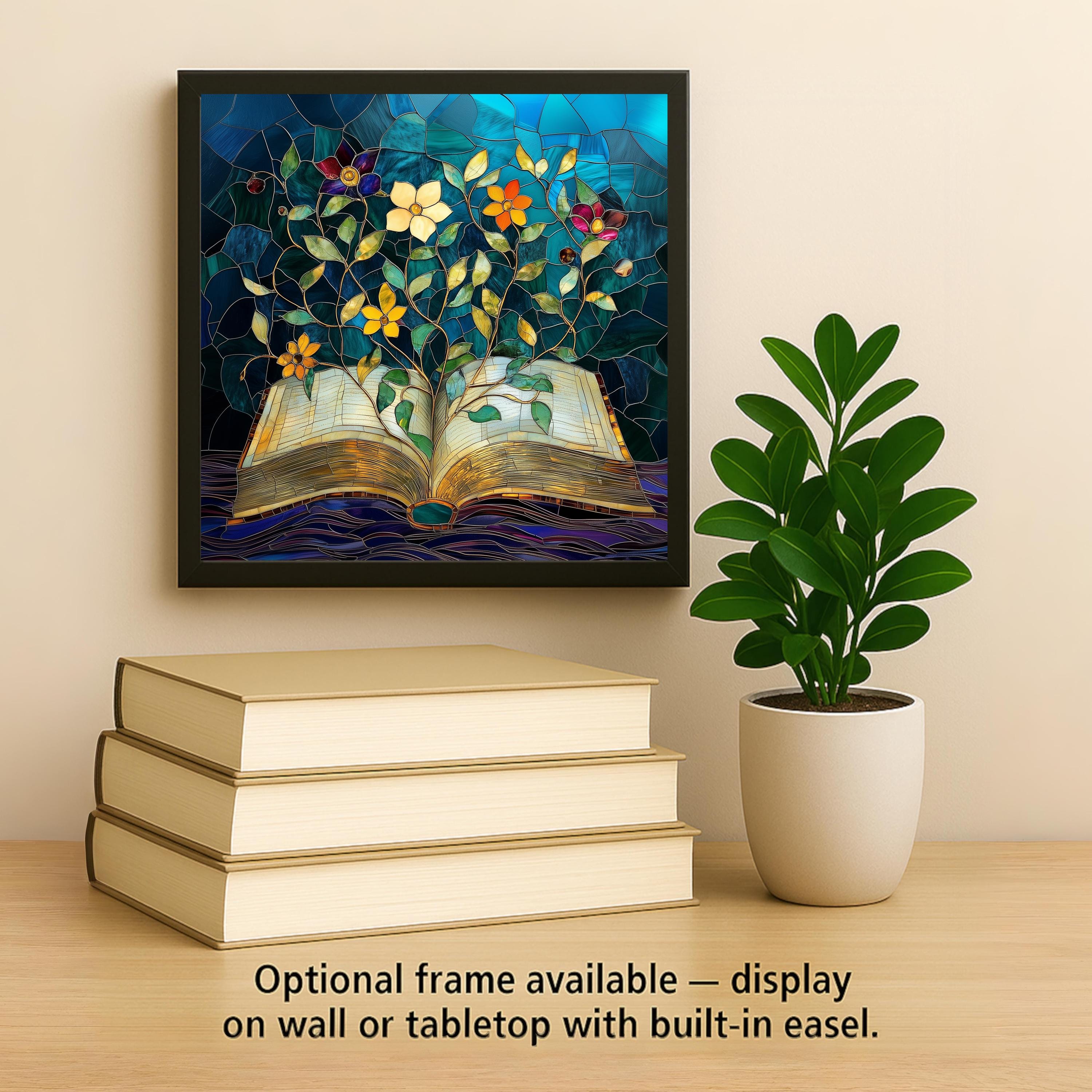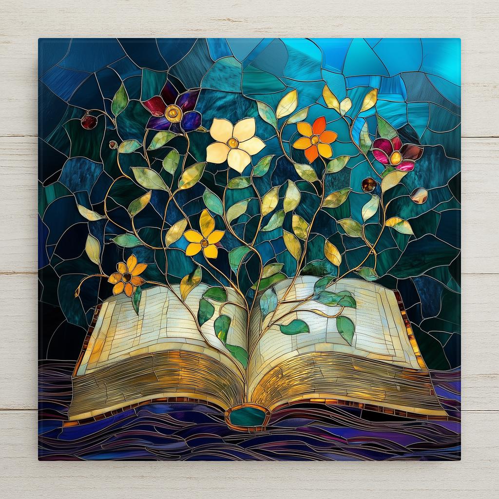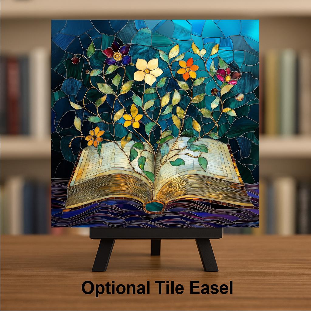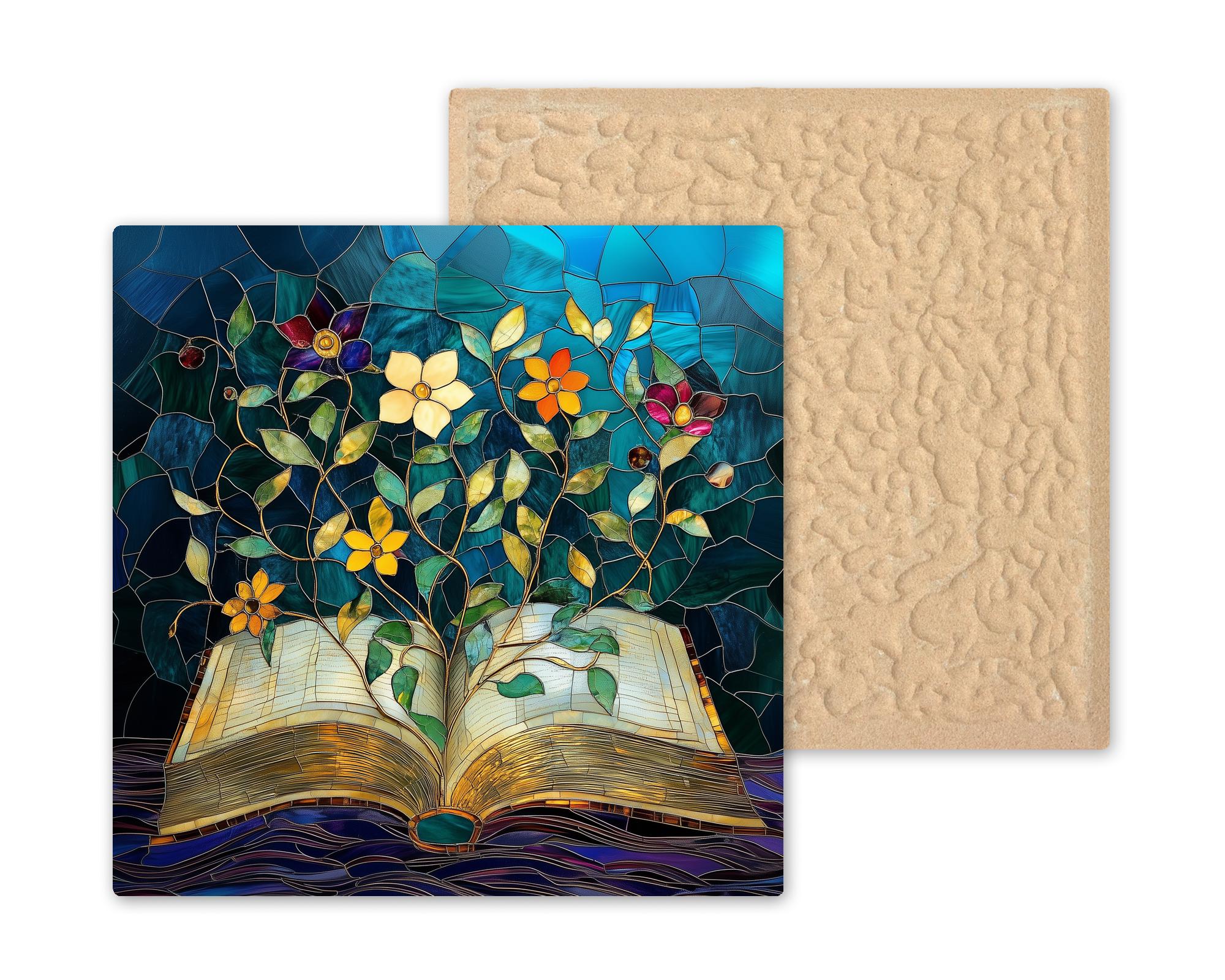 The buyer of this tile is a reader. They have a stack of books on the nightstand and another by the armchair. They want art that understands that — something that captures what books actually feel like from the inside. This tile does that in jewel-tone stained glass that makes every visitor ask where it came from. It also pairs beautifully with the Antique Books with Candle and Butterfly from Book tiles as a three-piece reading nook collection.