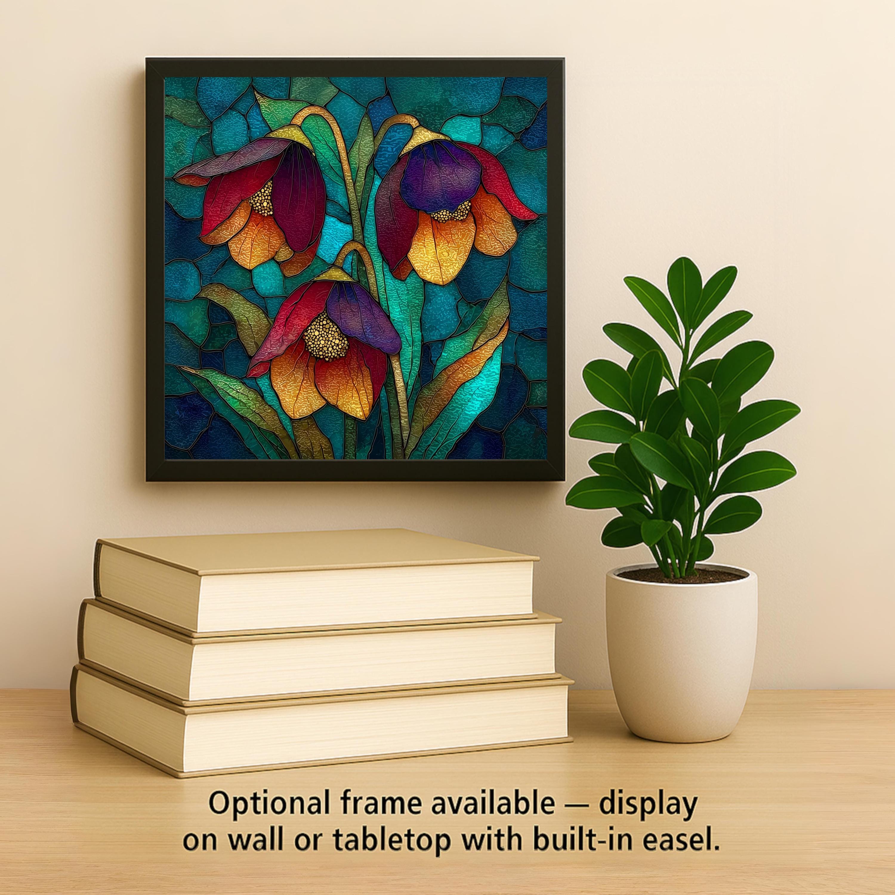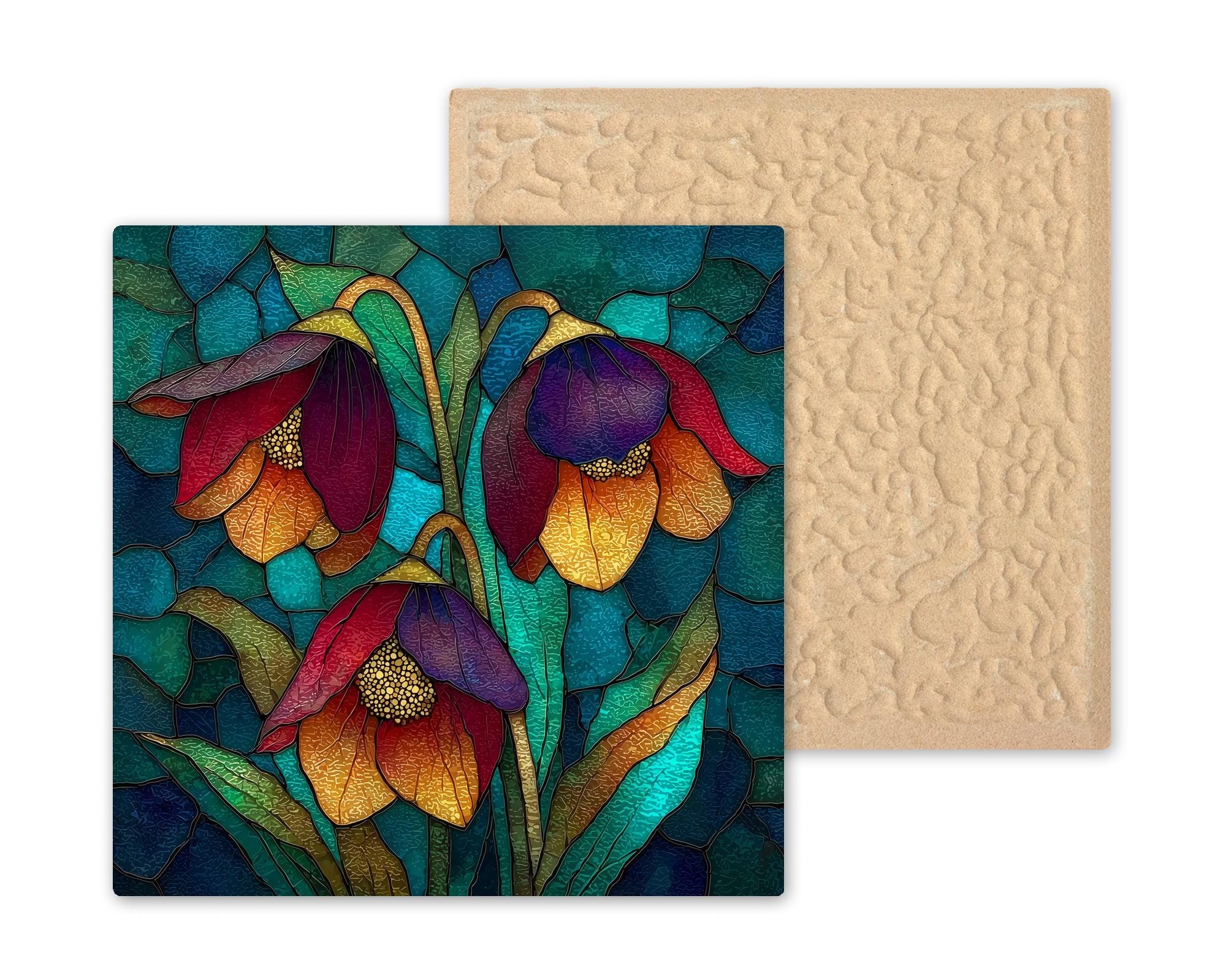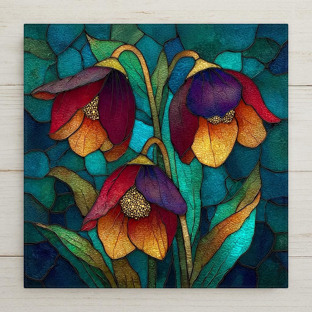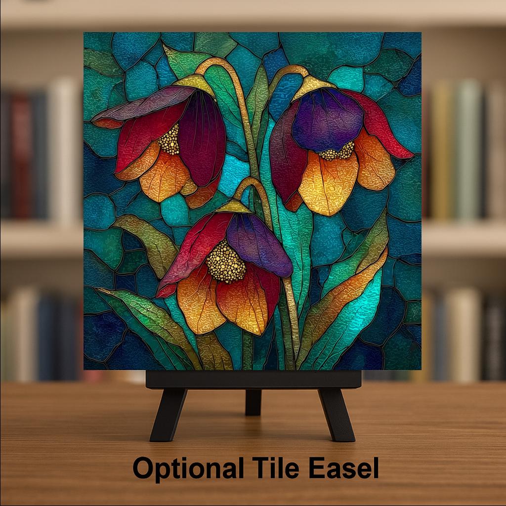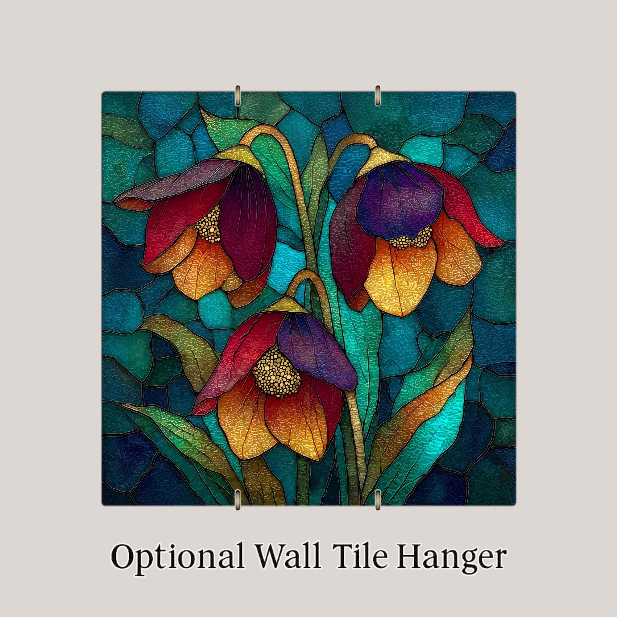 The design has a stained glass style appearance, but this is a permanent artwork print on ceramic tile and not actual stained glass, mosaic material, or sculpted construction. The colors remain vivid and the detail sharp over time.