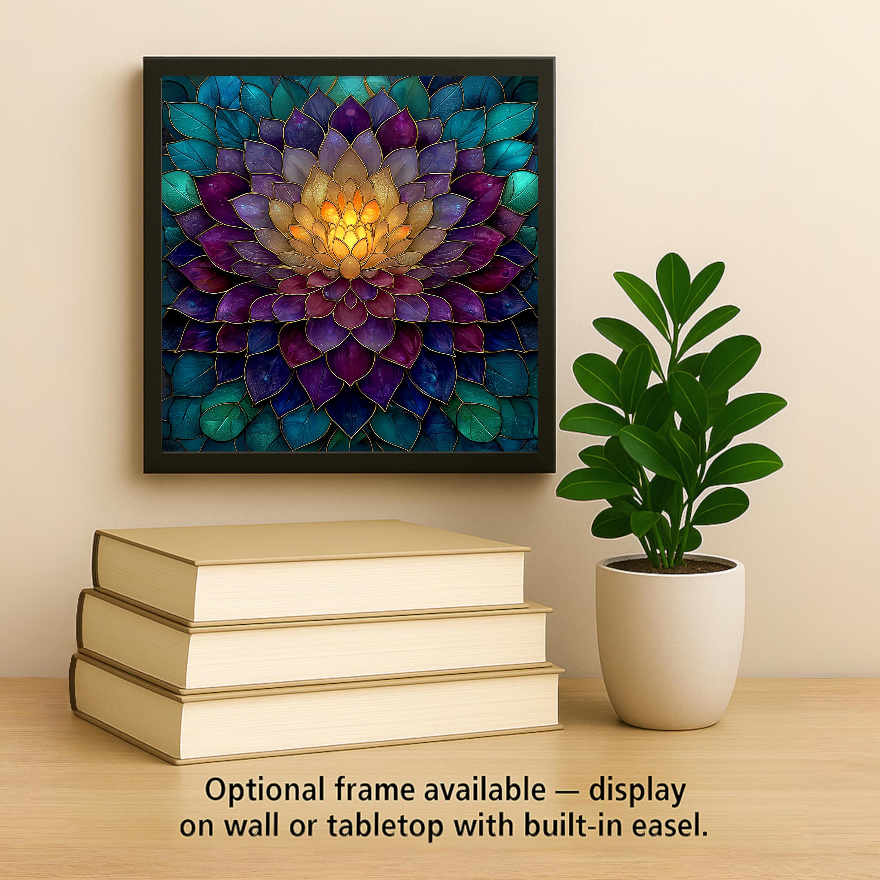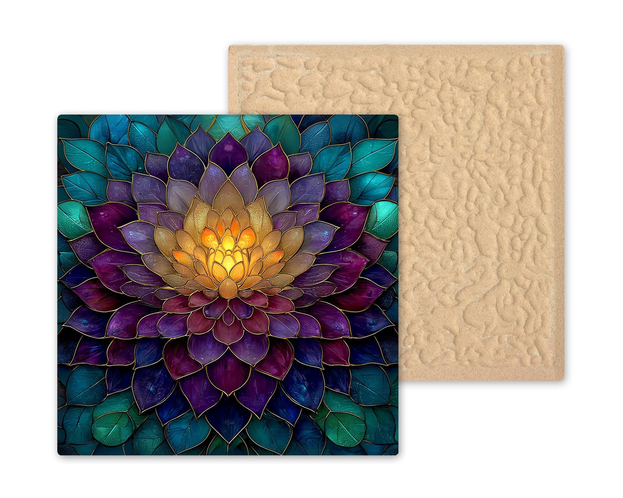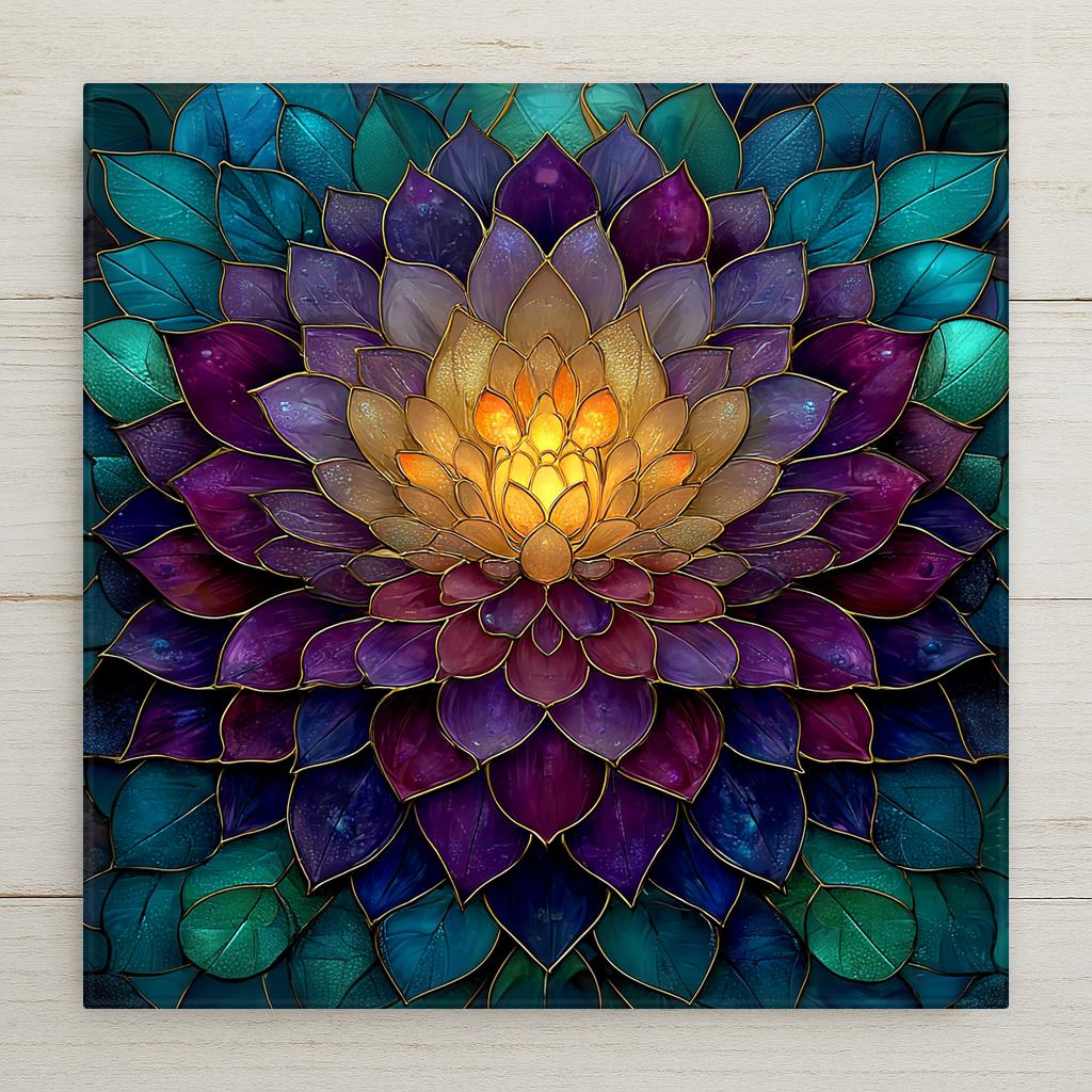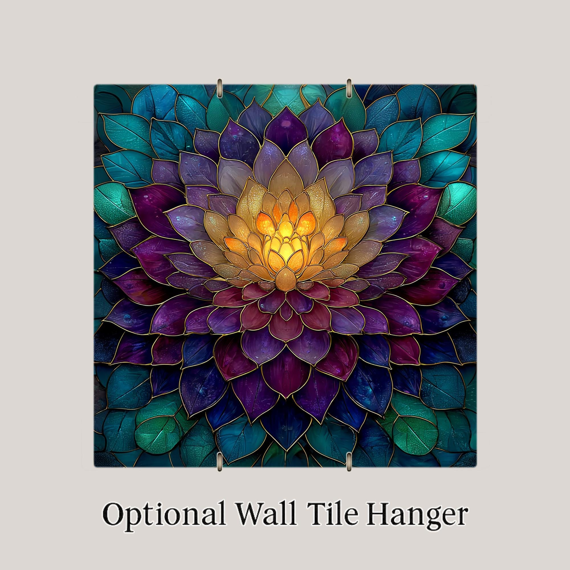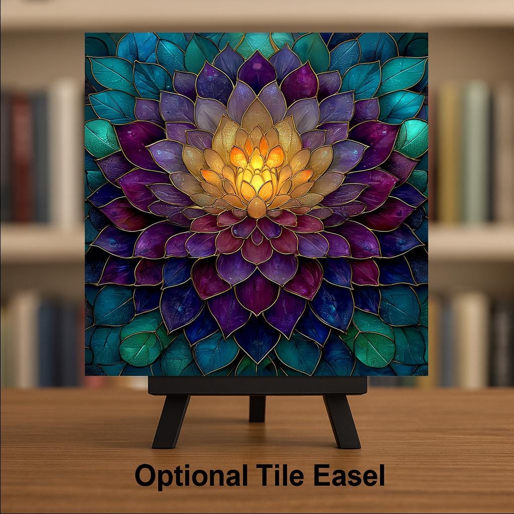 The design has a stained glass style appearance, but this is a permanent artwork print on ceramic tile and not actual stained glass, mosaic material, or sculpted construction. The colors remain vivid and the detail sharp over time.
