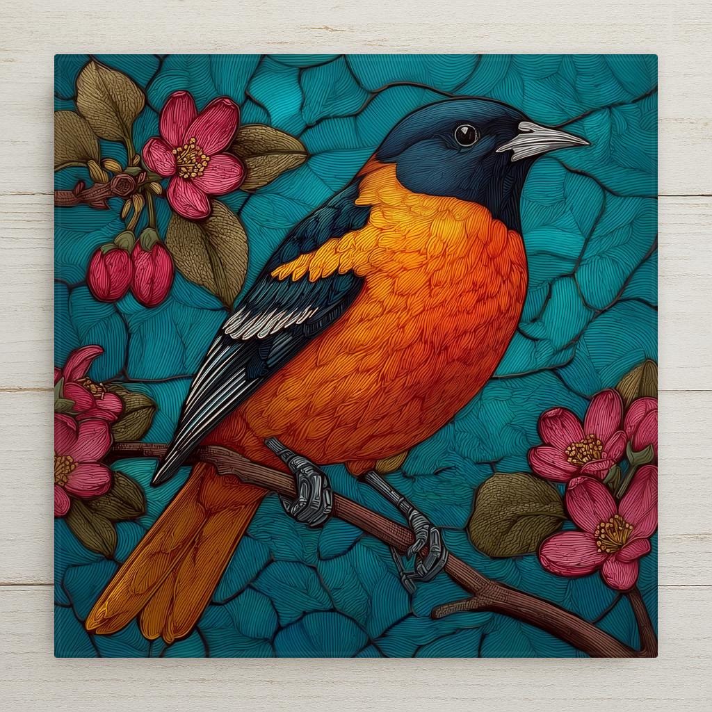 For the person who knows the oriole's call before they see the bird. This tile is for the bird enthusiast who has earned it — the one with binoculars by the back door and a life list on the fridge. Vivid, precise, and heirloom-quality.