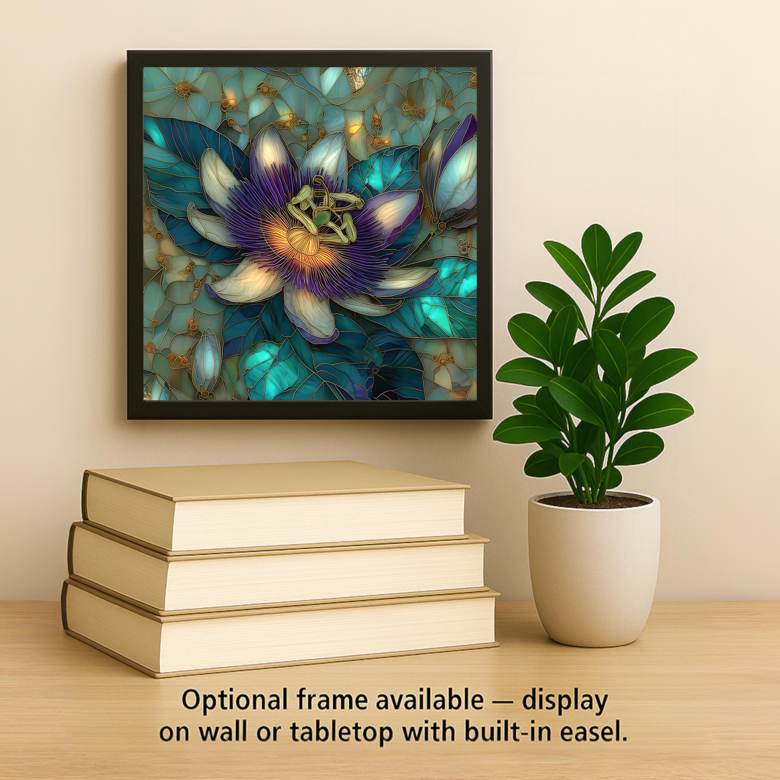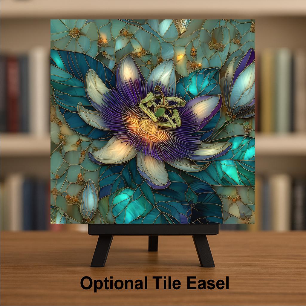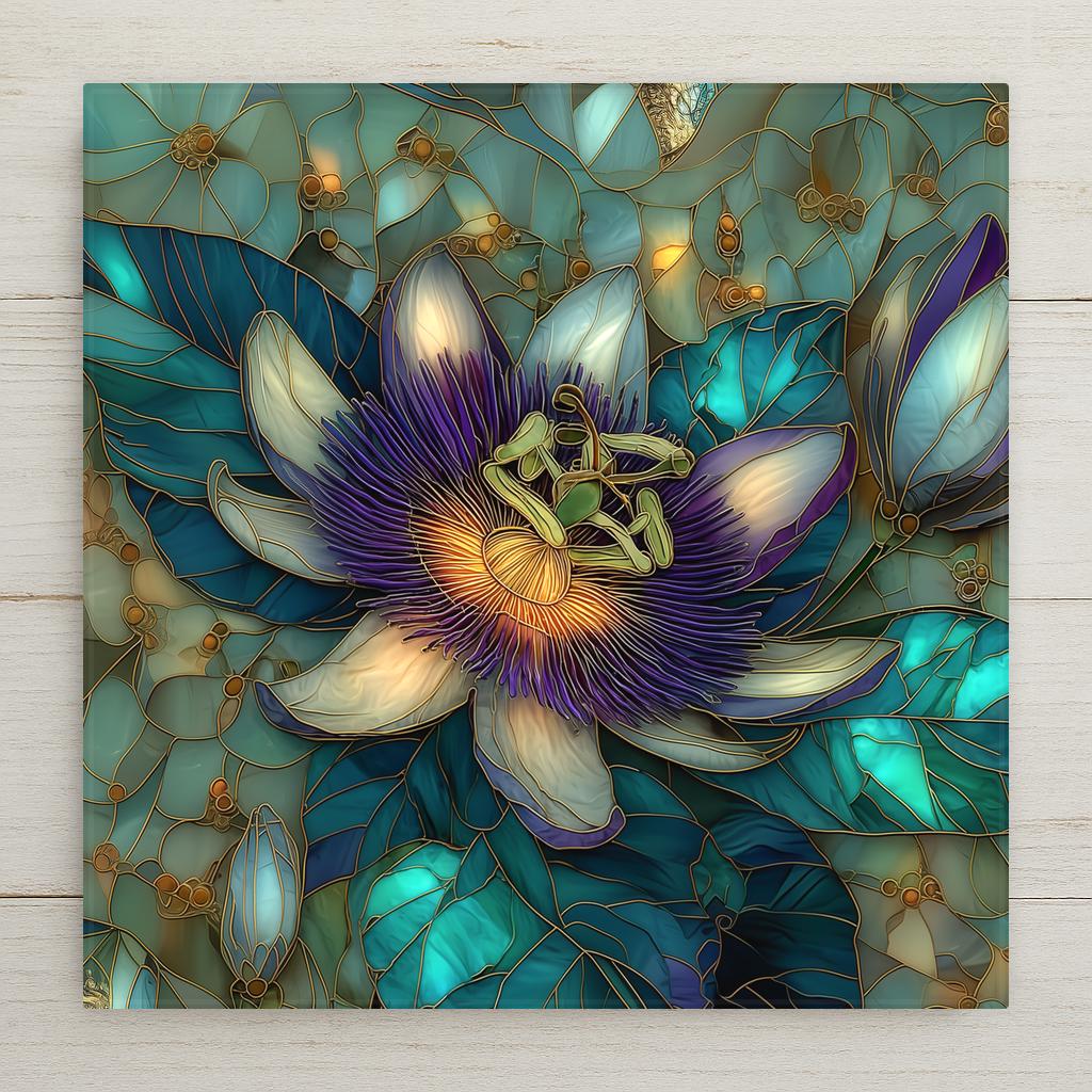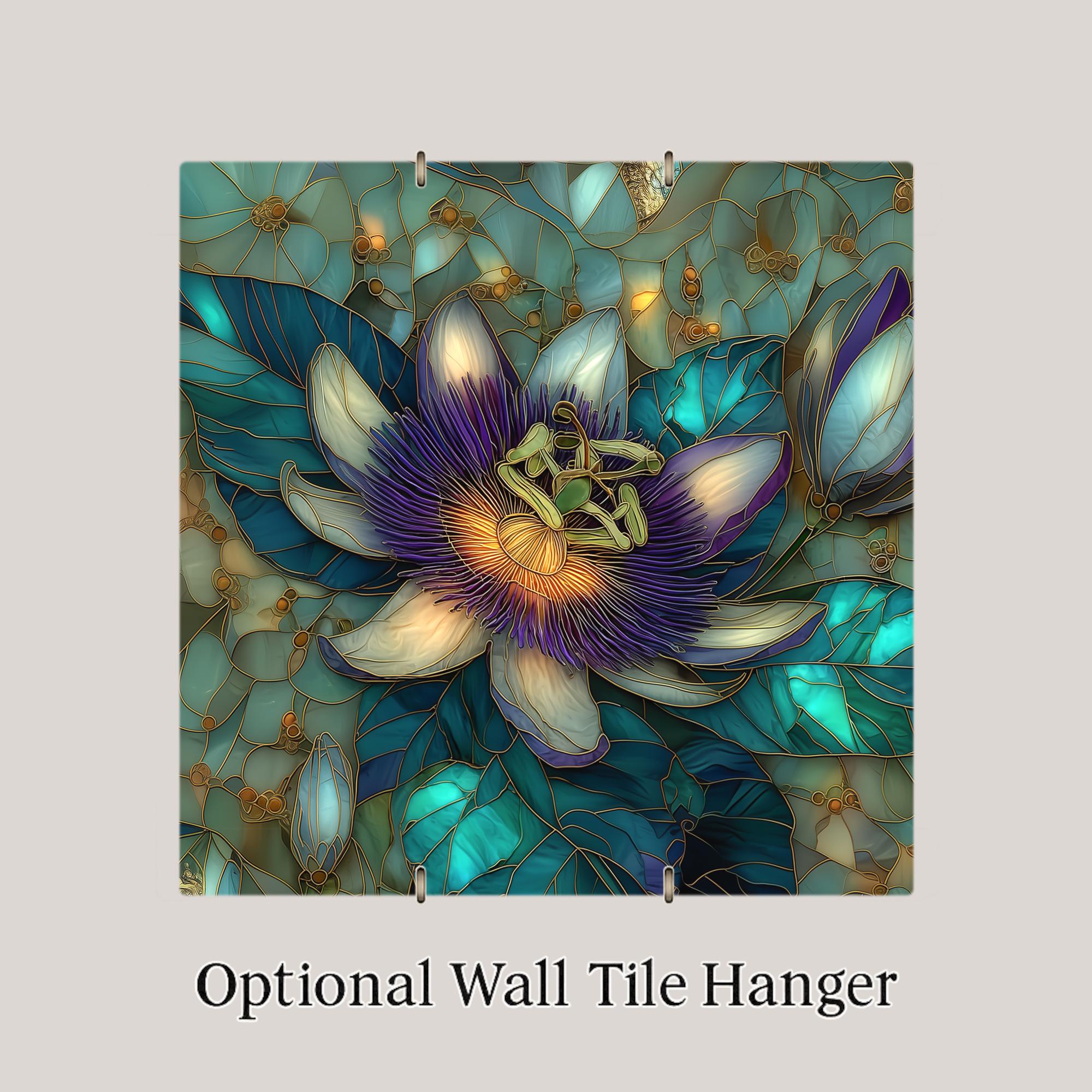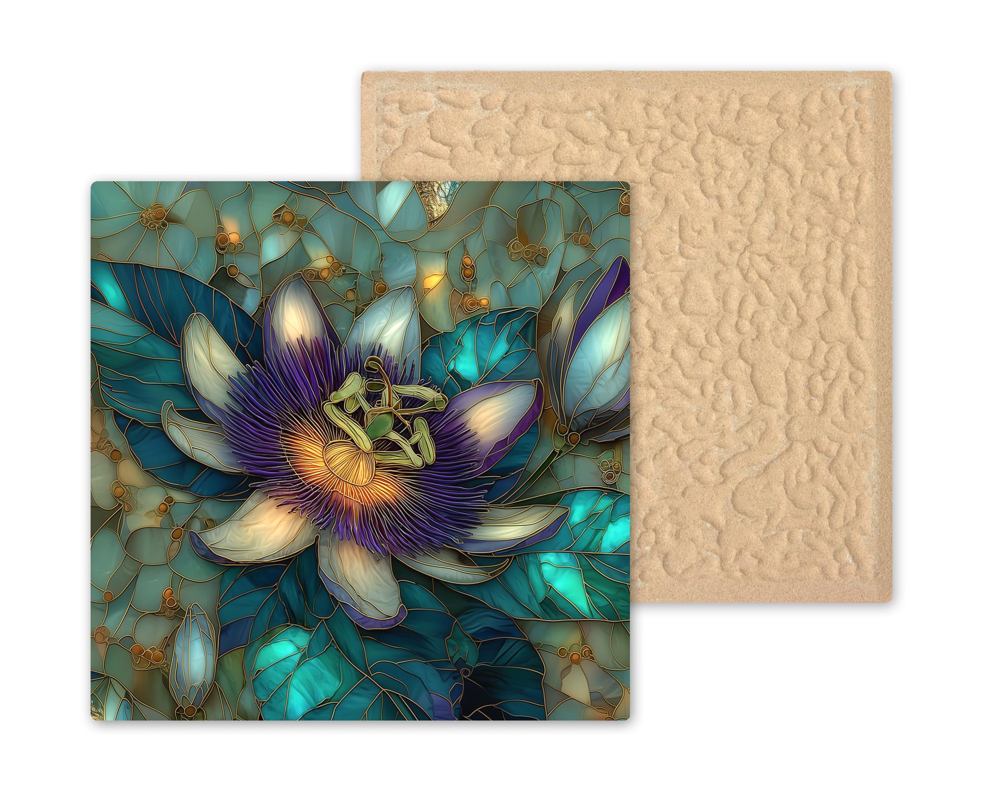 For the botanical collector who wants something that rewards close attention. The passionflower is the subject most people walk past in a garden without stopping — this tile makes stopping inevitable. The corona filament detail in stained glass style is unlike anything else in the series.
