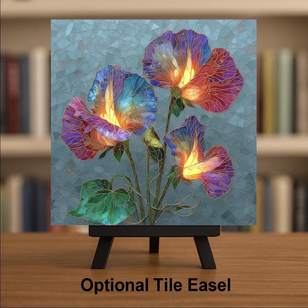 The design has a stained glass style appearance, but this is a permanent artwork print on ceramic tile and not actual stained glass, mosaic material, or sculpted construction. The colors remain vivid and the detail sharp over time.