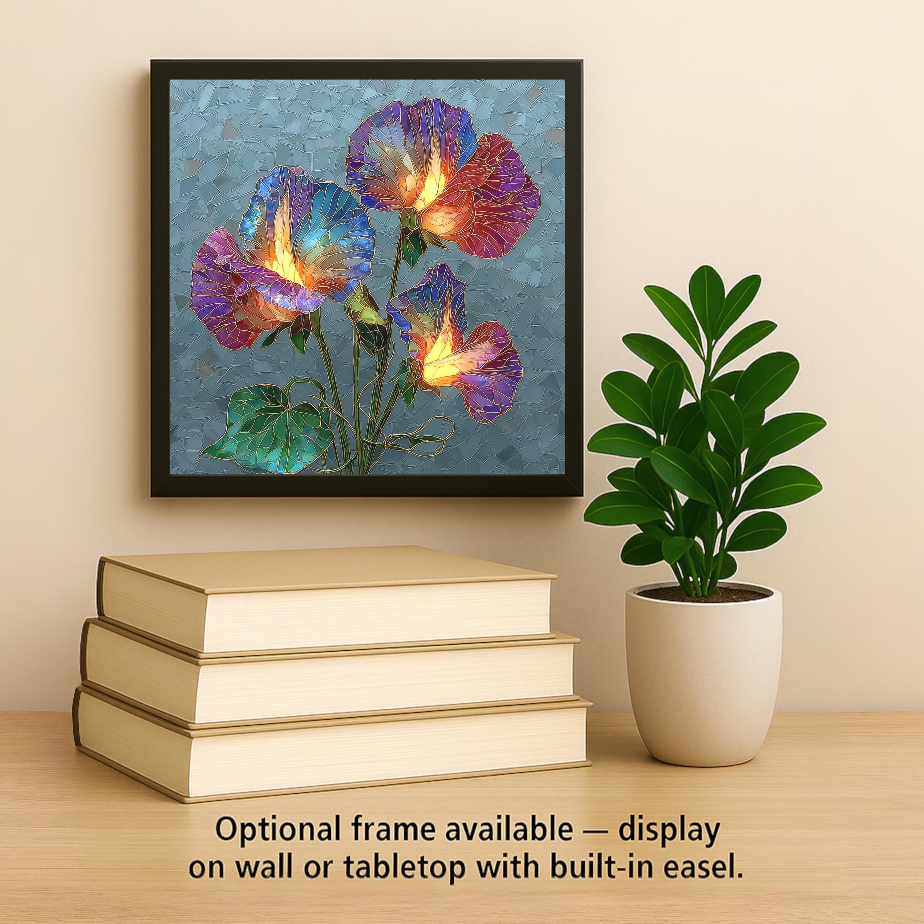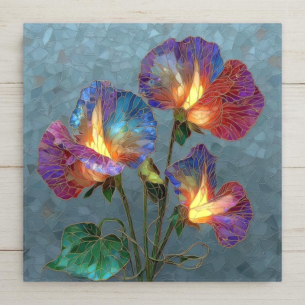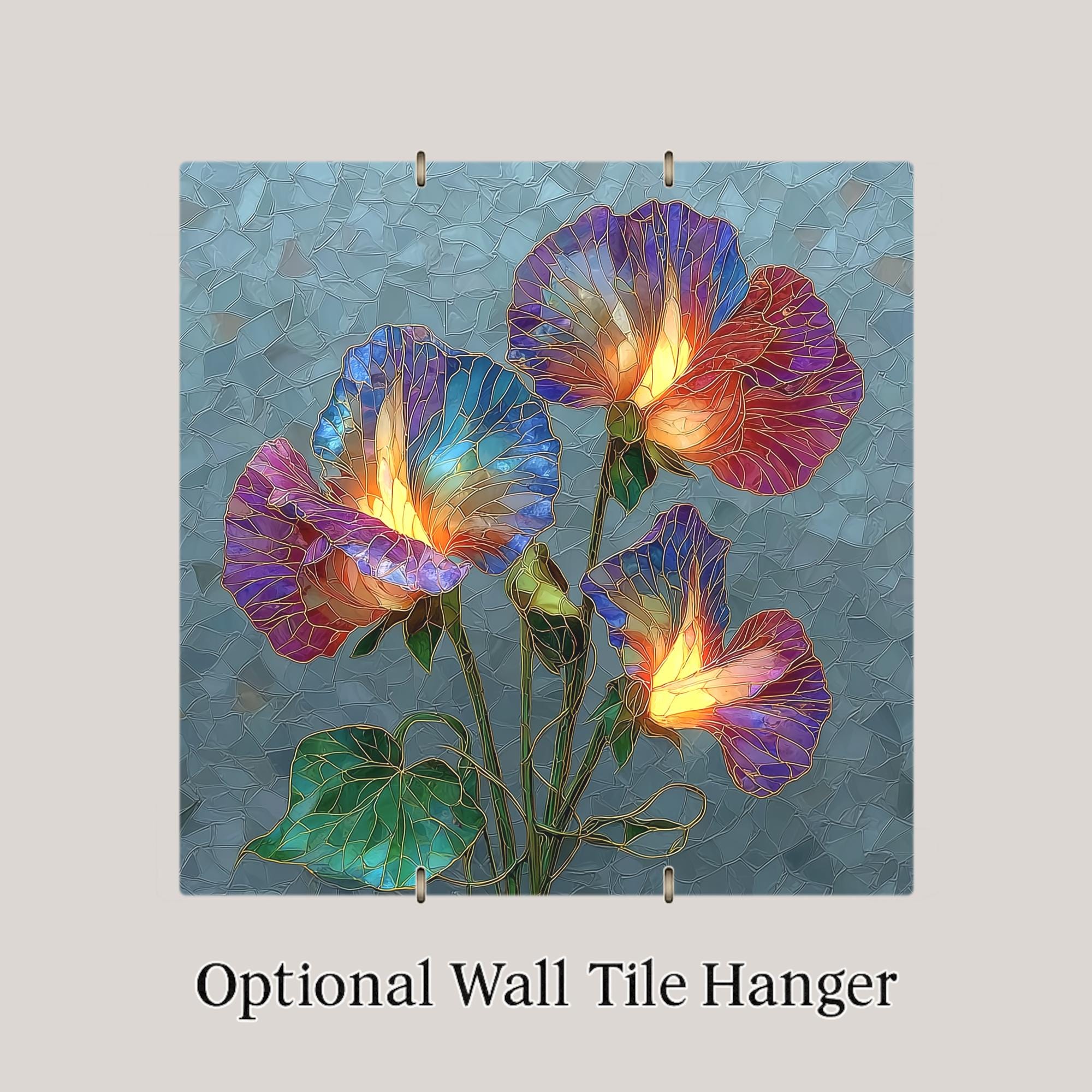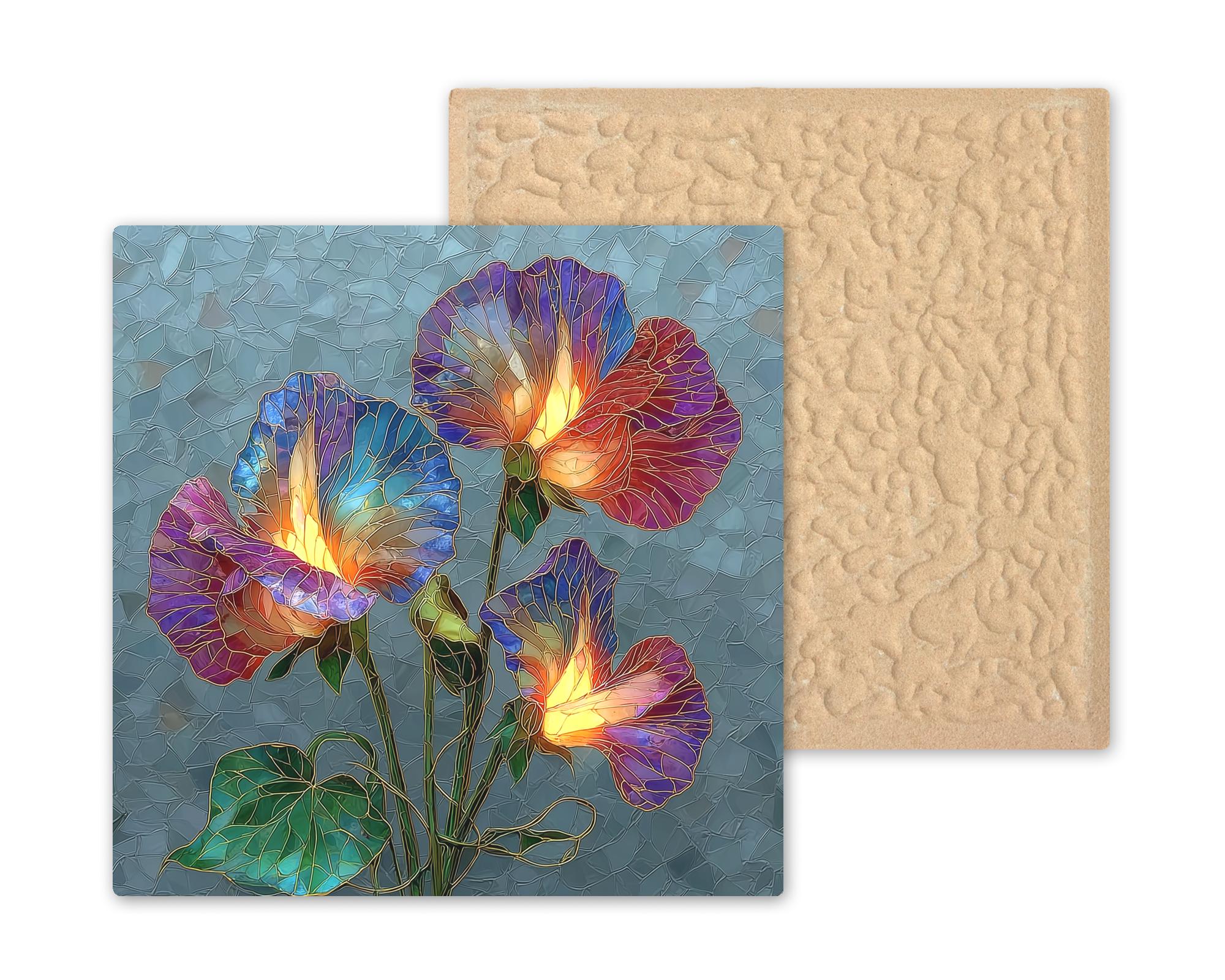For the gardener who knows that sweet peas are the whole point of having a trellis. This tile captures the specific softness of the sweet pea — the ruffled petal, the climbing tendril, the lavender-to-blush palette — in a way that lasts longer than the flowers do.