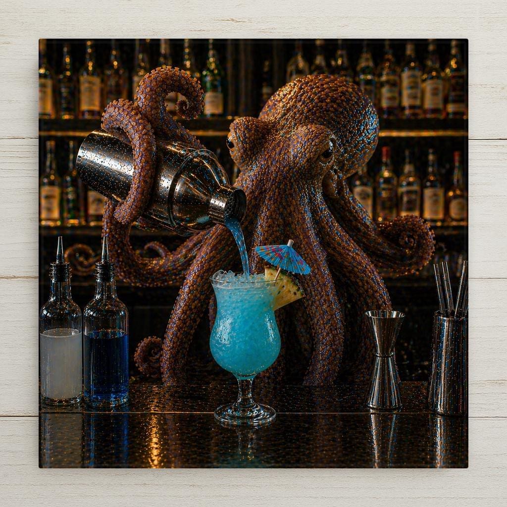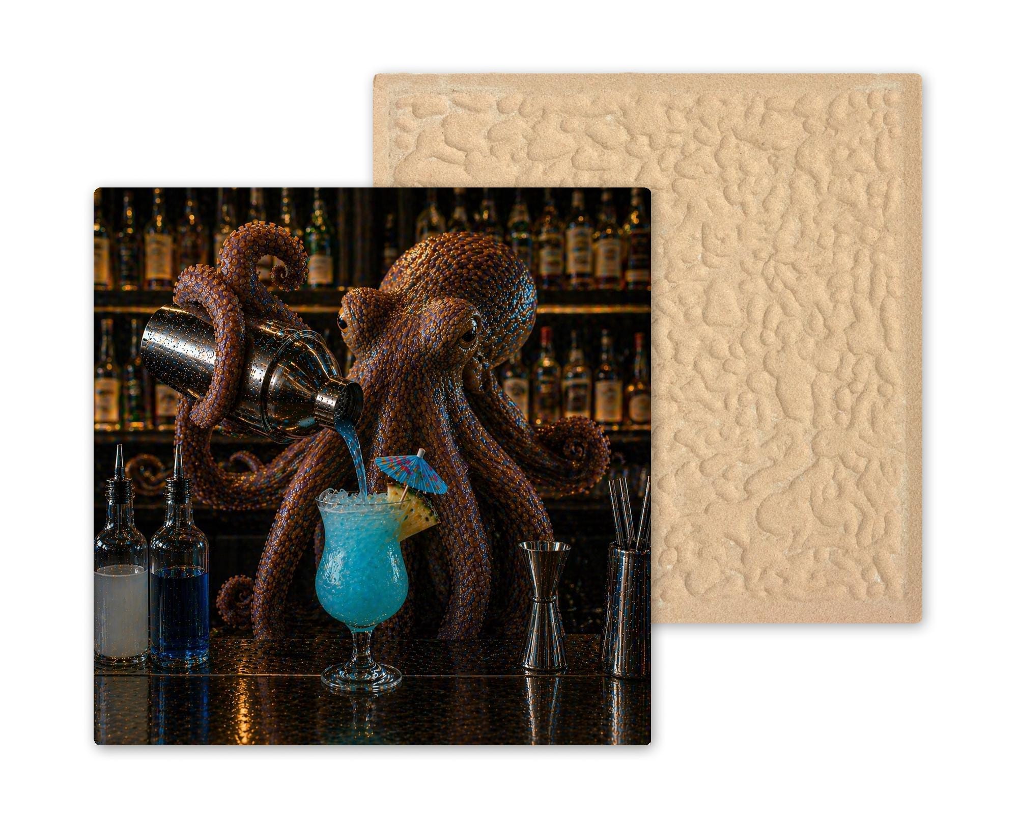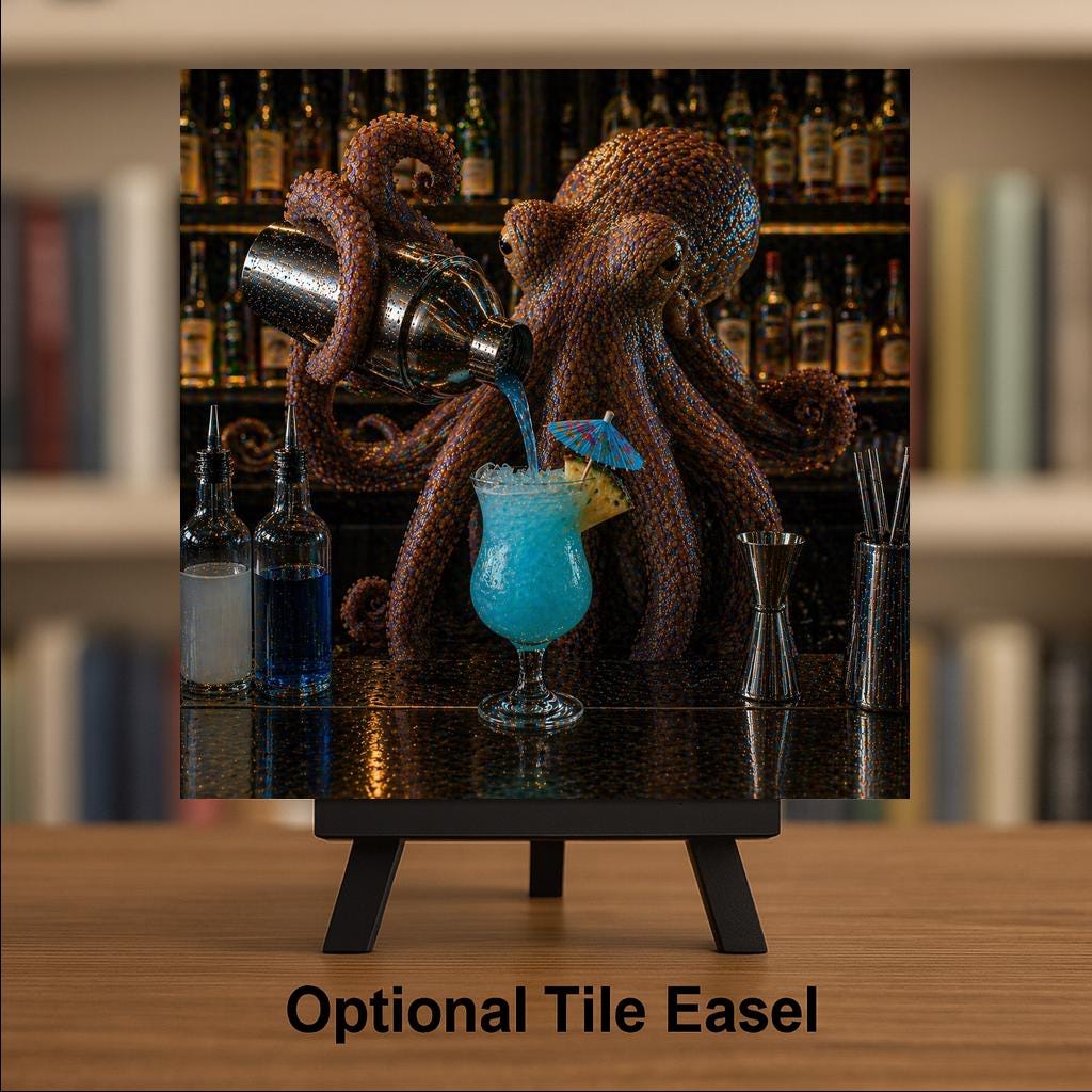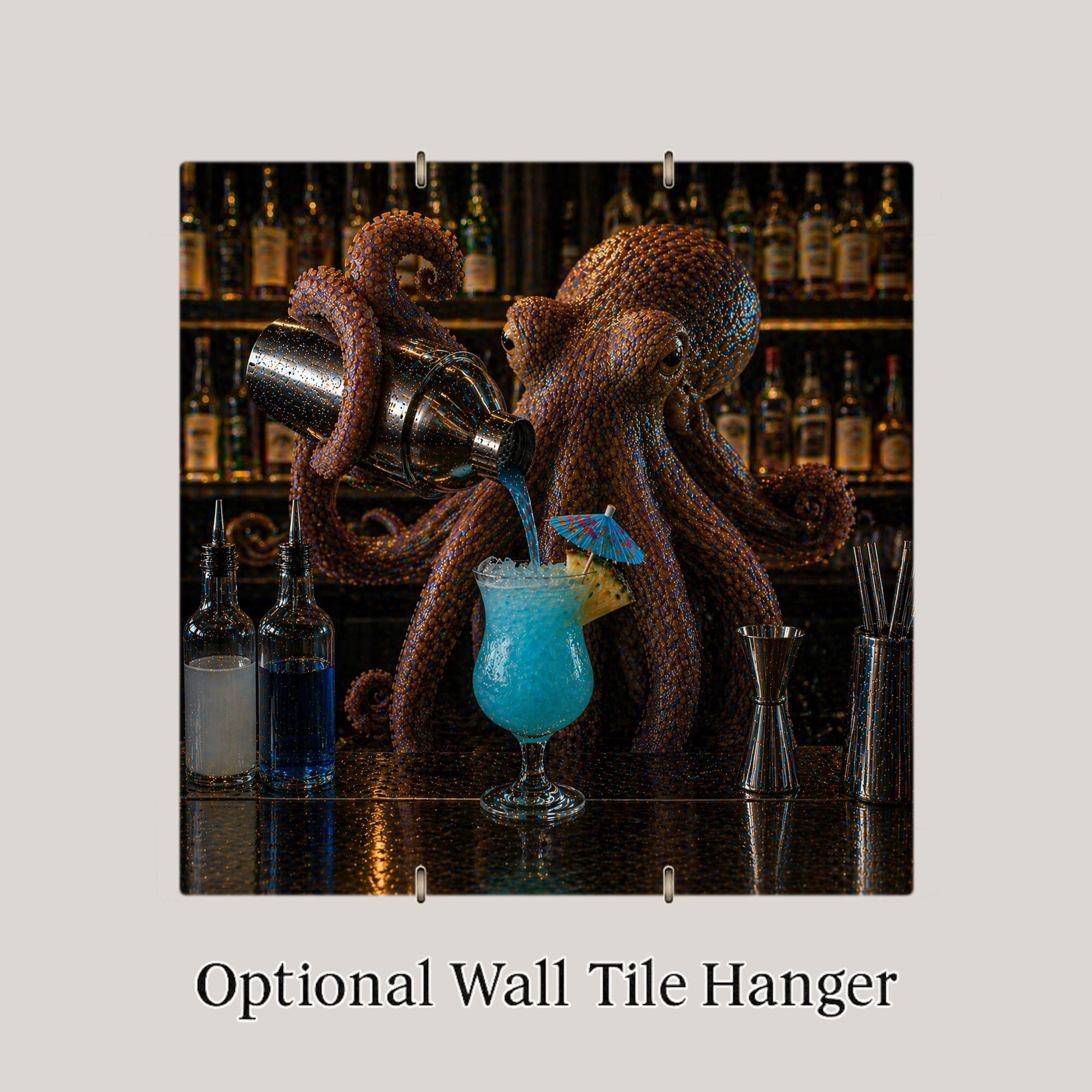 Whether it's a birthday gift for a bartender, a housewarming piece for the friend building their dream home bar, or a conversation starter for the cocktail lover who collects the unusual — this tile delivers. The octopus bartender is dramatic enough to anchor a wall on its own and detailed enough that people stop and look twice. The jewel-toned blue cocktail catches the light, the rich copper tentacles fill the frame with movement, and the full backlit bar shelf in the background makes the whole scene feel like you've walked into the best underground bar you've ever been to.