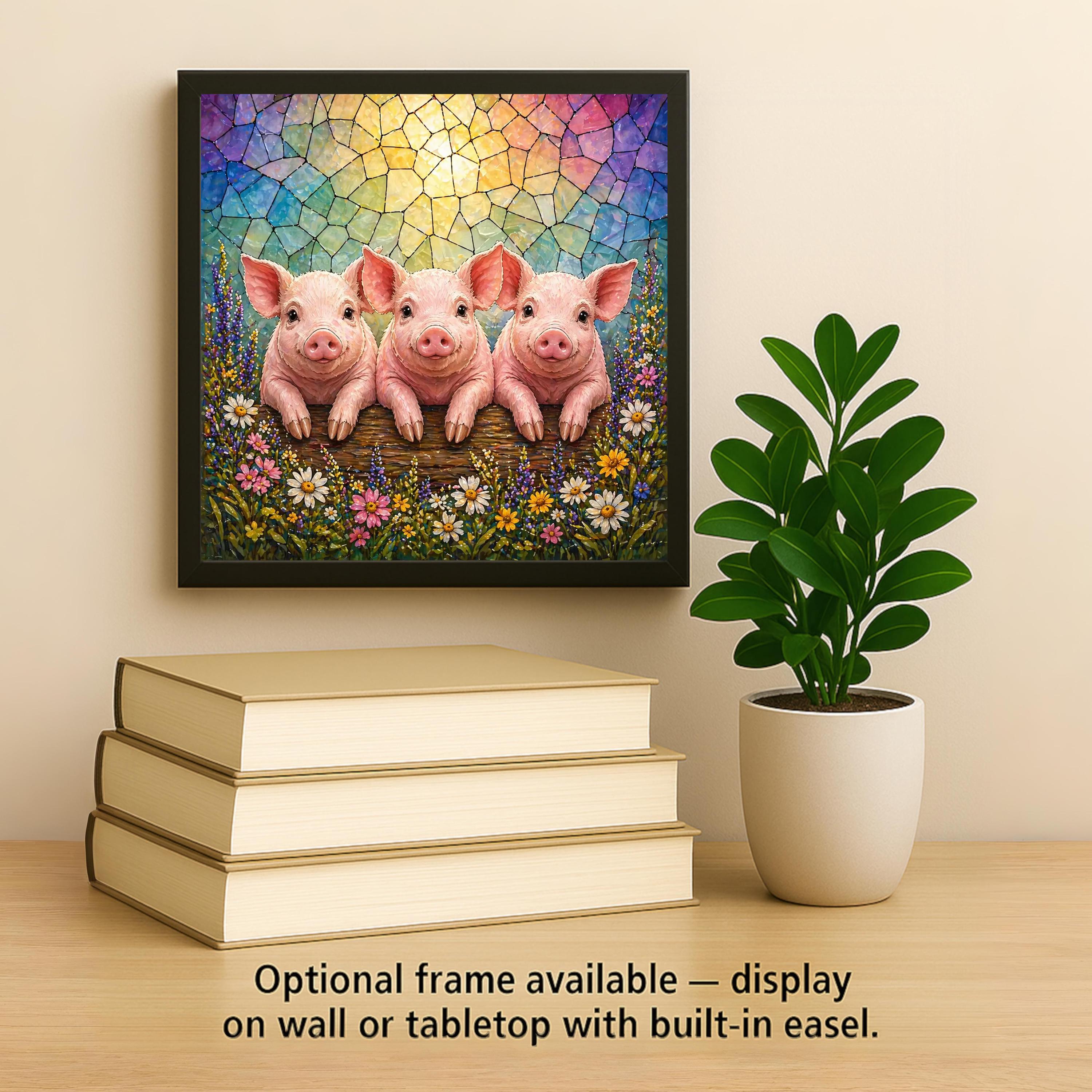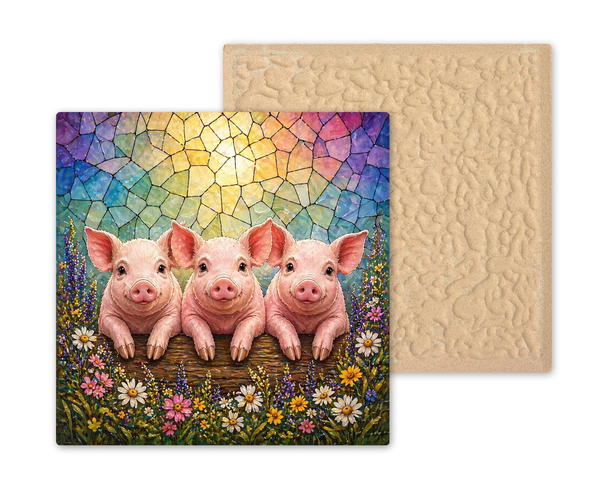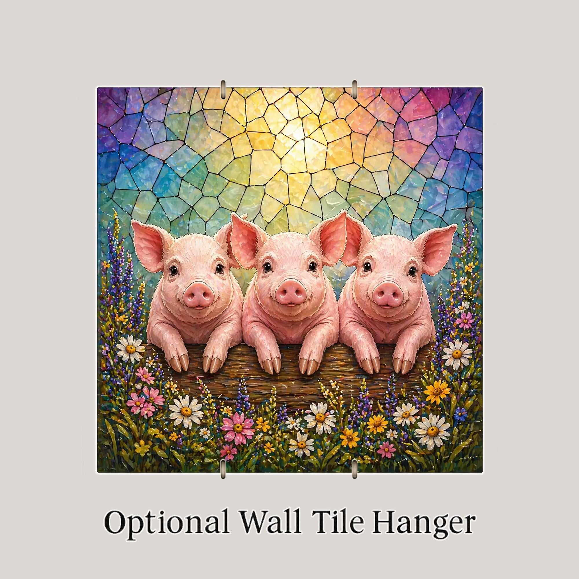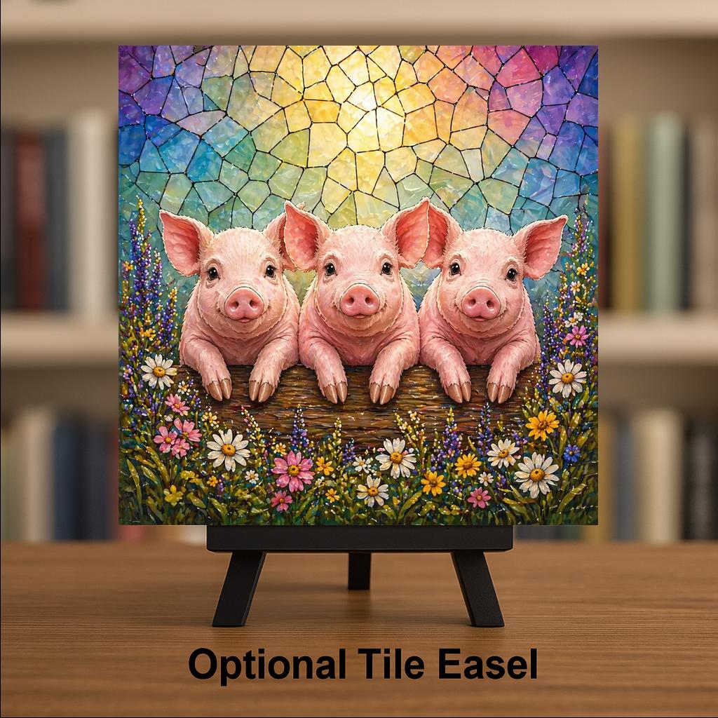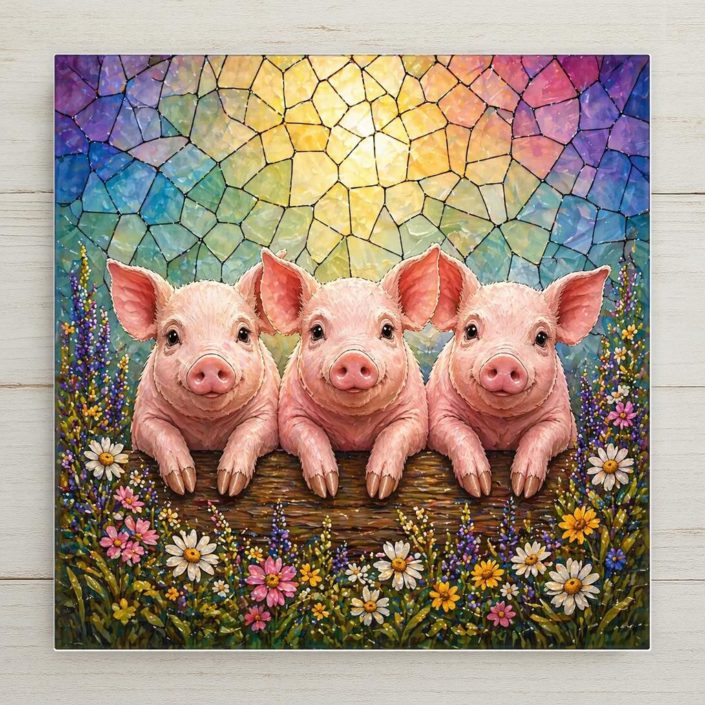 Not kitschy, not generic farmhouse — this tile is genuinely intricate and vivid. The three piglets are lifelike and expressive, the wildflower border is rich and detailed, and the stained glass sky behind them glows with the kind of color that only looks better in natural light. It works as a standalone piece or paired with the companion Lamb and Calf tiles from the same series for a full farm animal collection.
