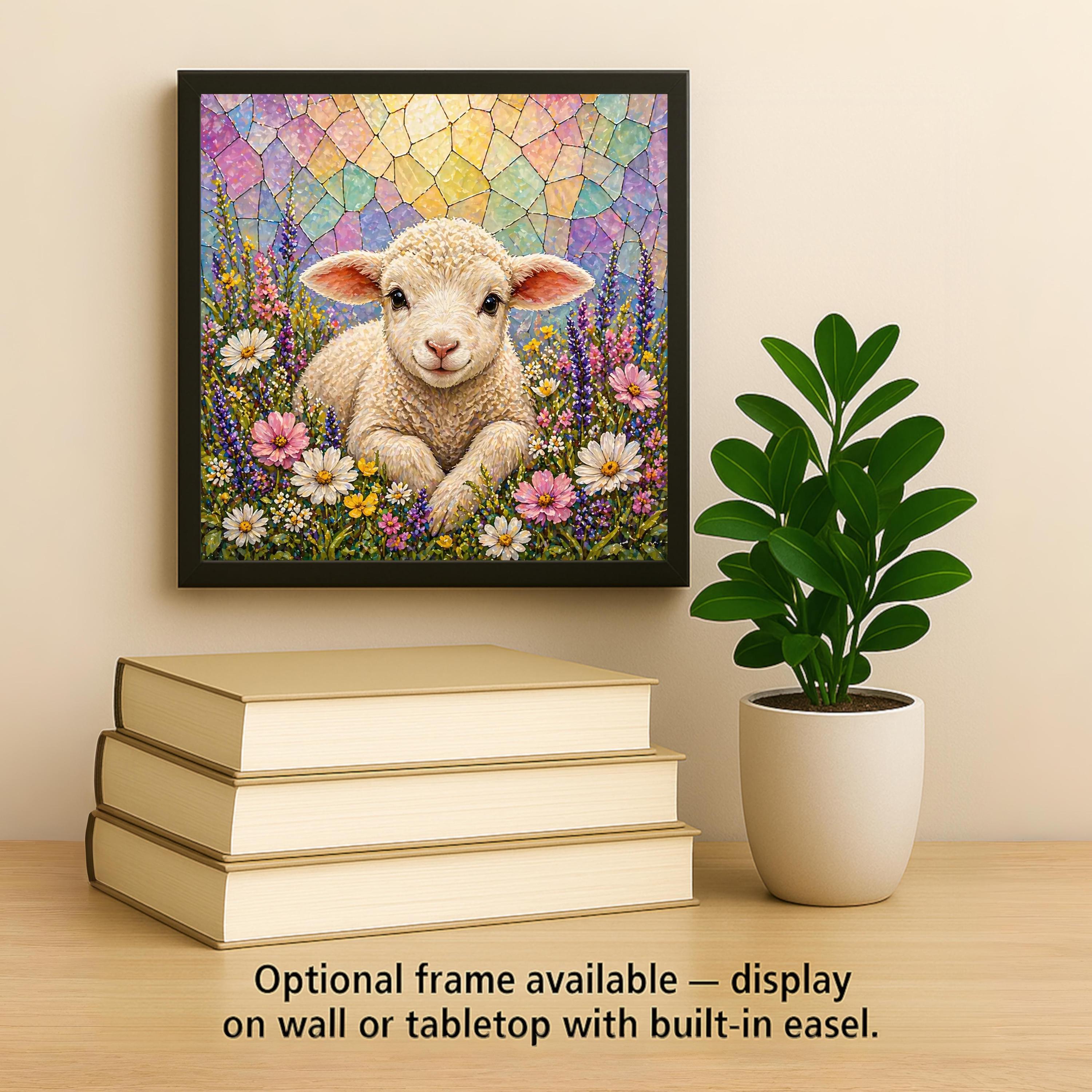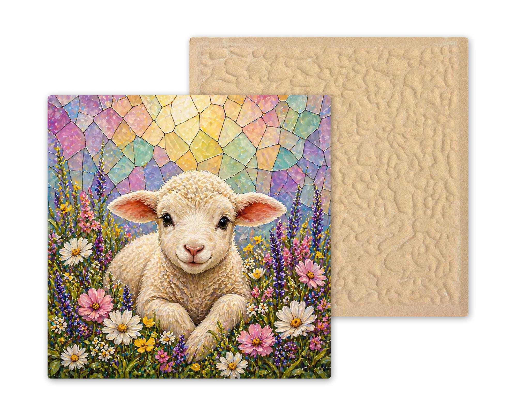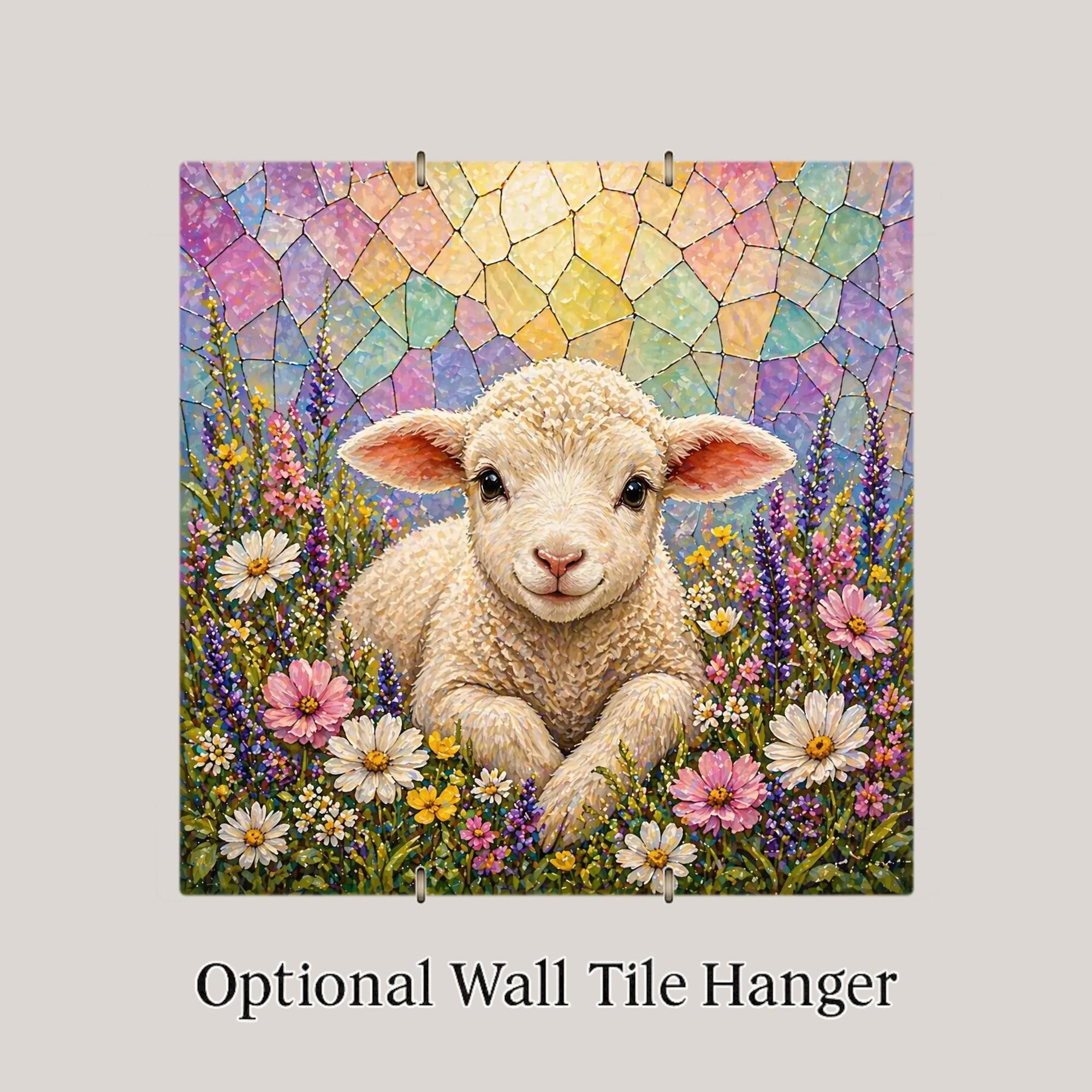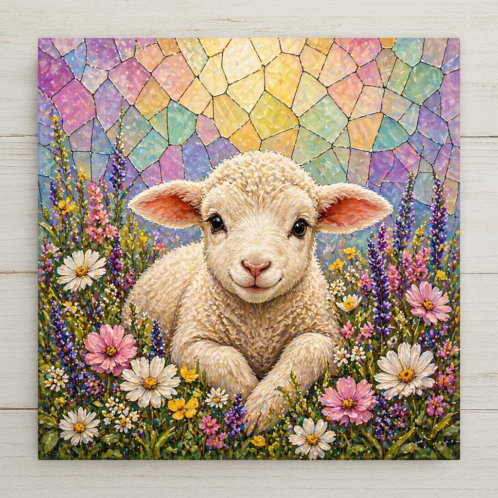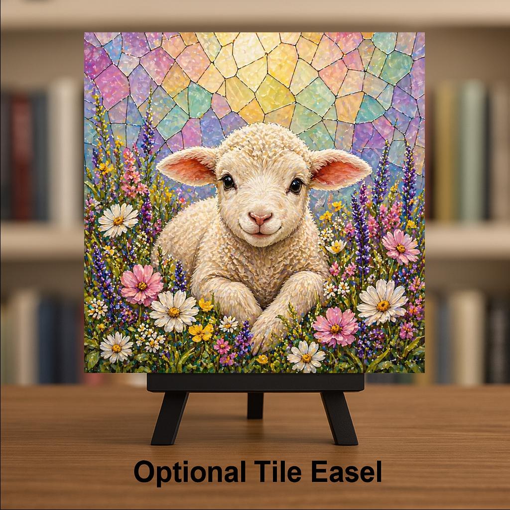 The lamb is one of the most enduring symbols in Christian tradition, and this tile honors that without being heavy-handed. The wildflower setting is joyful and spring-like, the stained glass style sky has the luminous quality of light through a church window, and the overall feeling is one of peace and gentleness. It works on a faith home gallery wall at Easter and stays there year-round.