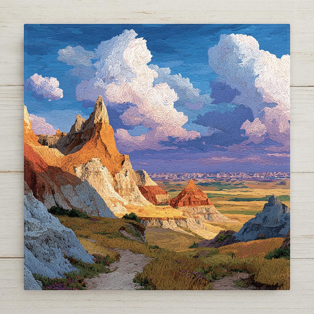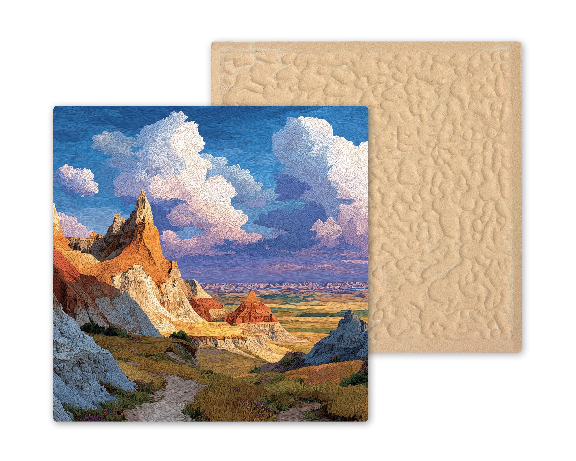 For South Dakotans this is deep state pride — a landscape that gets under your skin and stays there. For road trippers it is one of the great detour-worthy discoveries of the American West, a place that earns genuine disbelief the first time you see it. The Badlands are unlike any other landscape in the catalog — not mountains, not coast, not canyon, but something entirely their own. A tile for the Midwest collector, the Great Plains devotee, and anyone who drove I-90 and pulled off at the right exit.