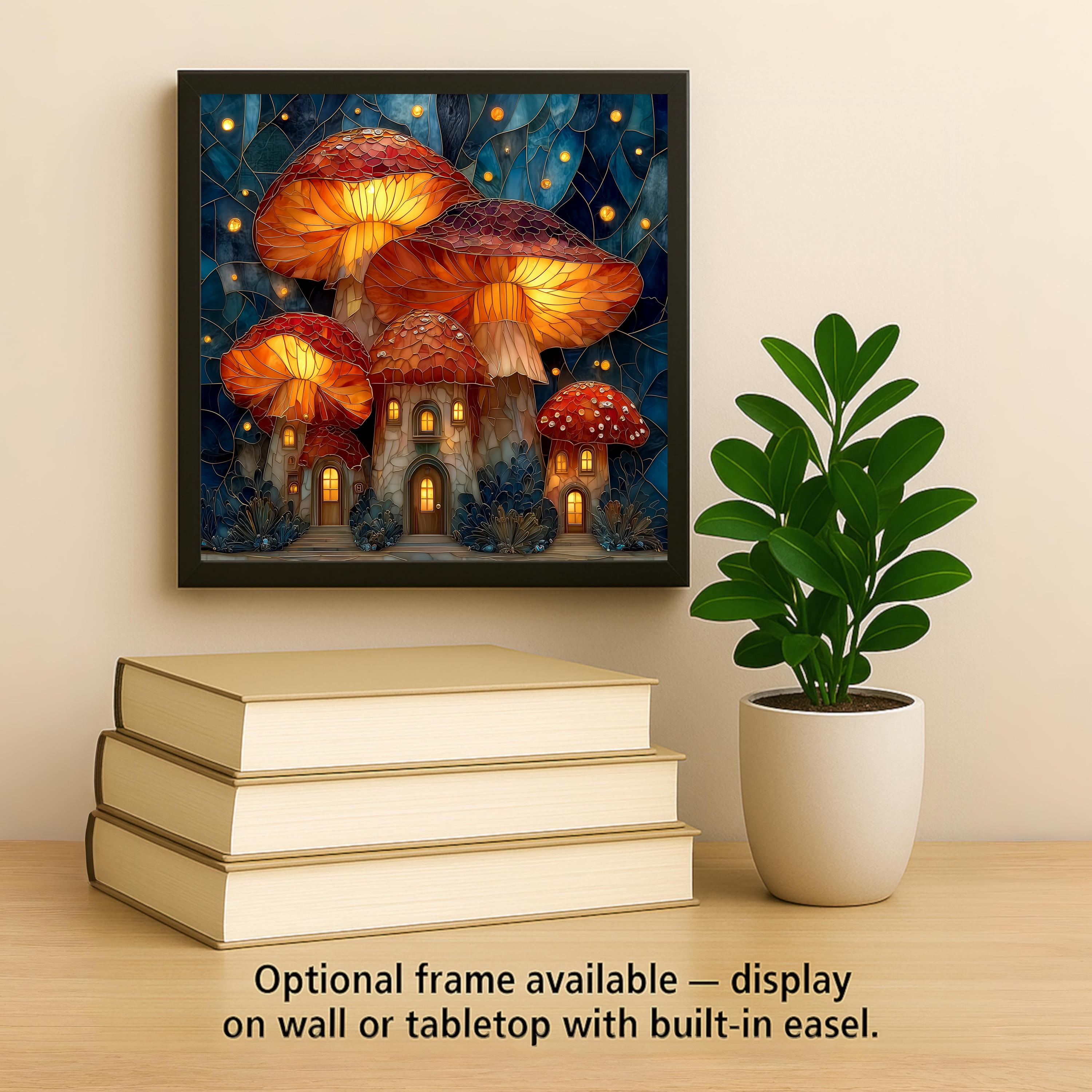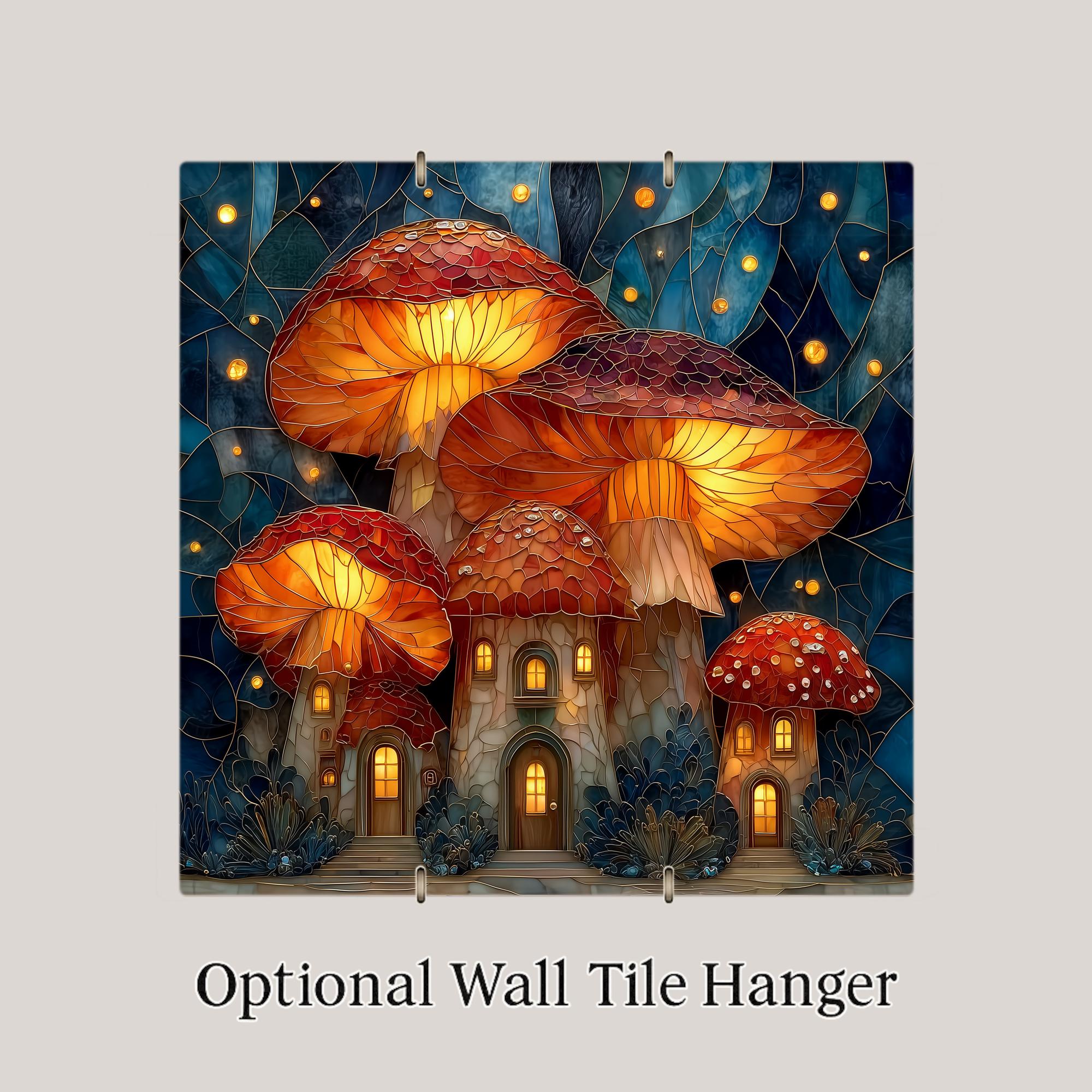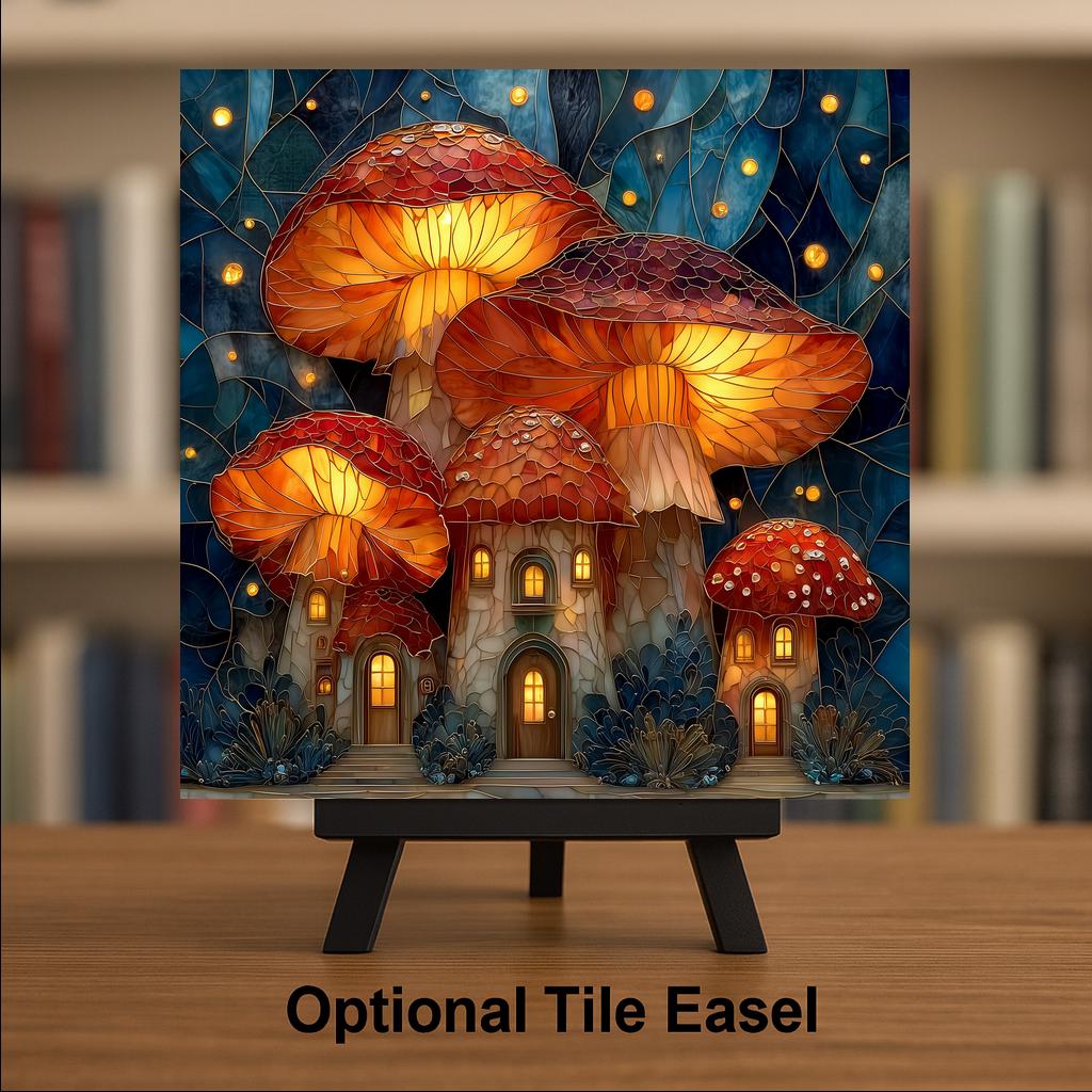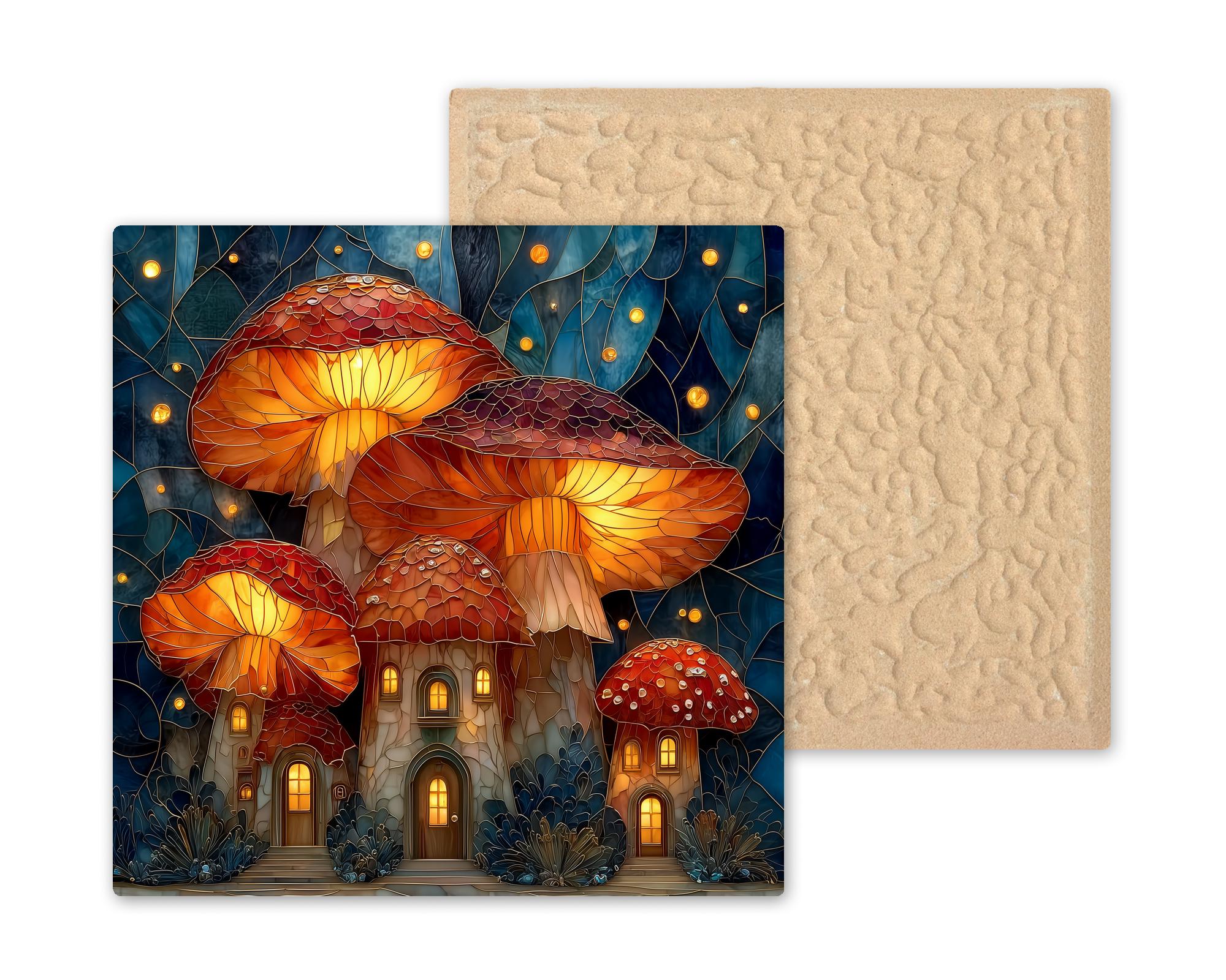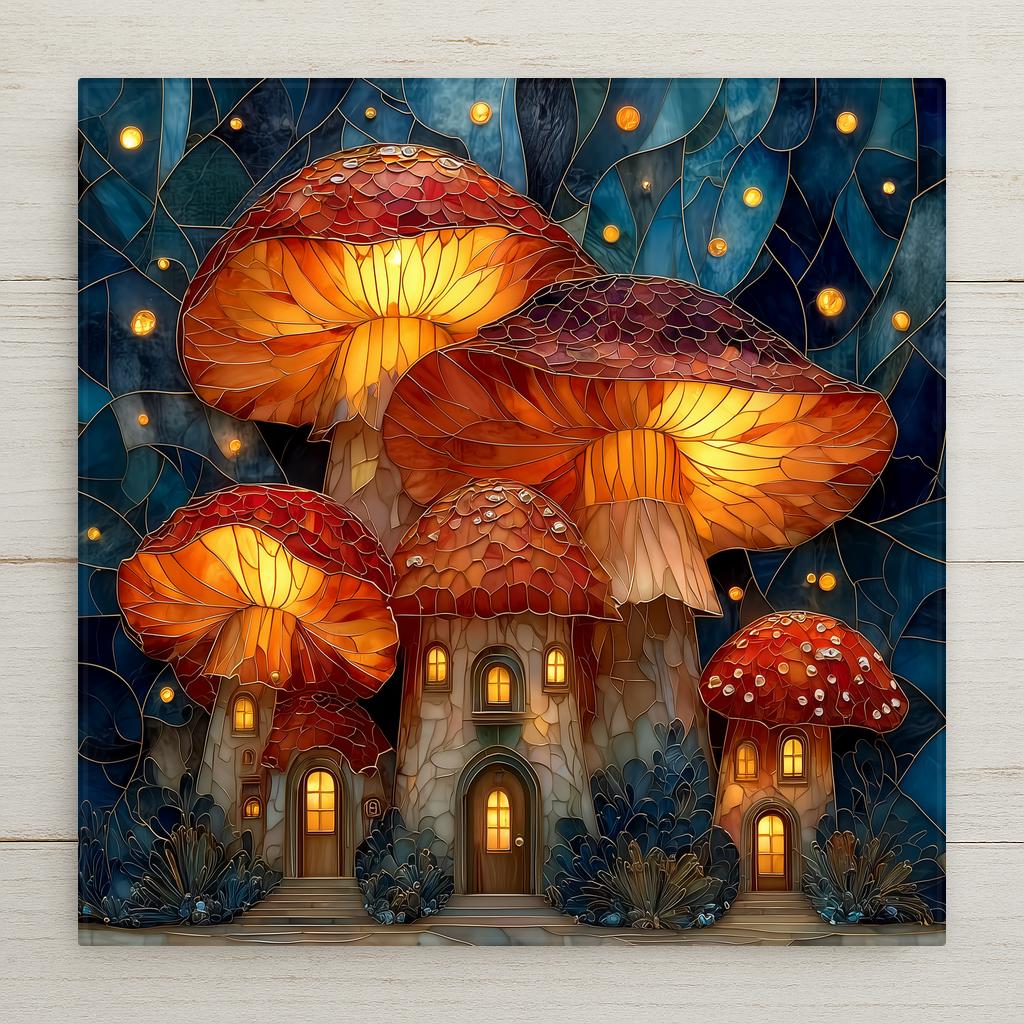 The mushroom house has earned its place in visual culture as the shorthand for a certain kind of magic — the cozy, enchanted, slightly otherworldly domestic warmth that fantasy art reaches for when it wants to feel like home. This tile achieves that completely. It works for the fairy tale collector, the fantasy art lover, the cottagecore devotee who wants something genuinely beautiful rather than merely nostalgic. It pairs naturally with the Poppy Garden tile from the same series — the same stained glass style, the same deep midnight palette, the same golden light language — for buyers who want a matching pair on one wall.