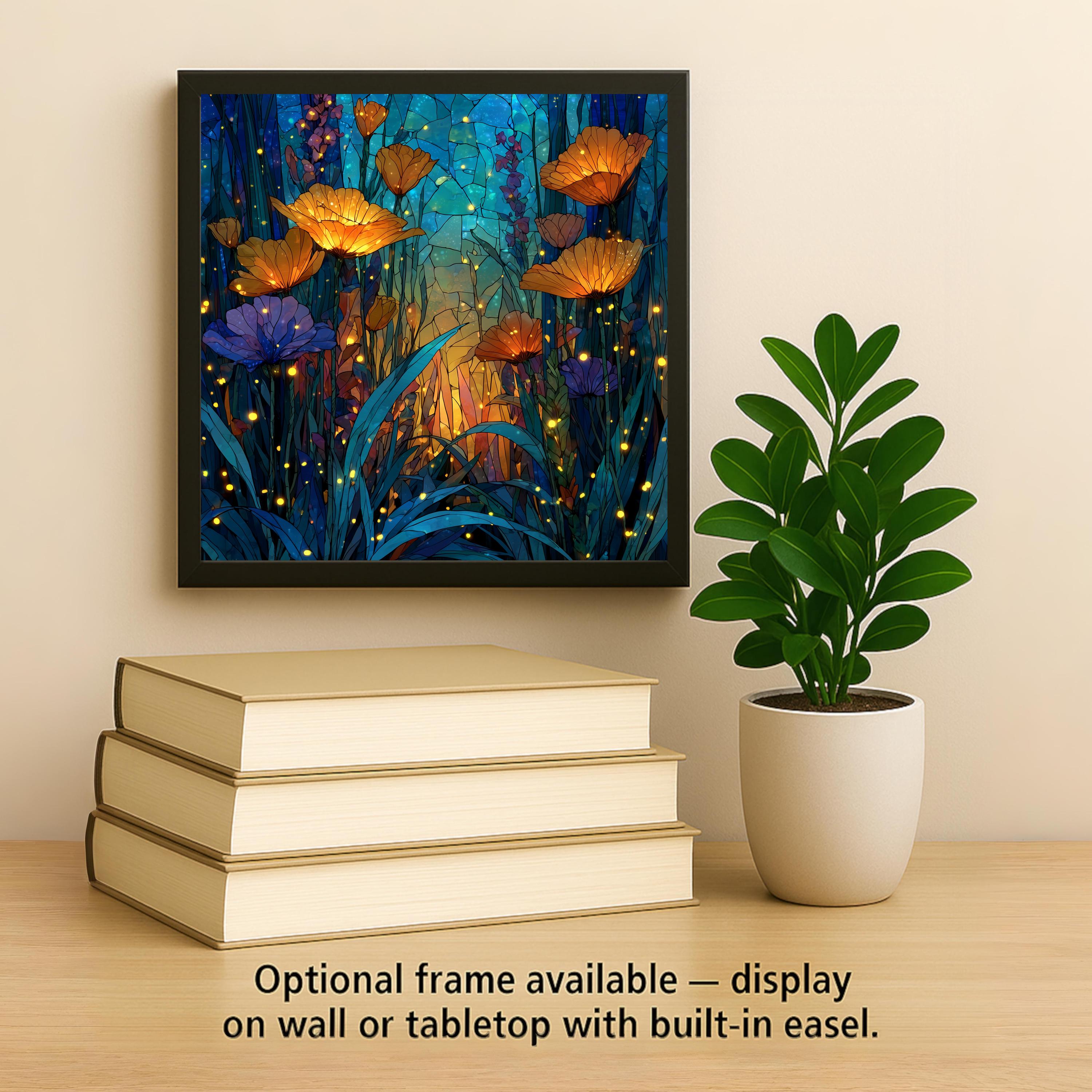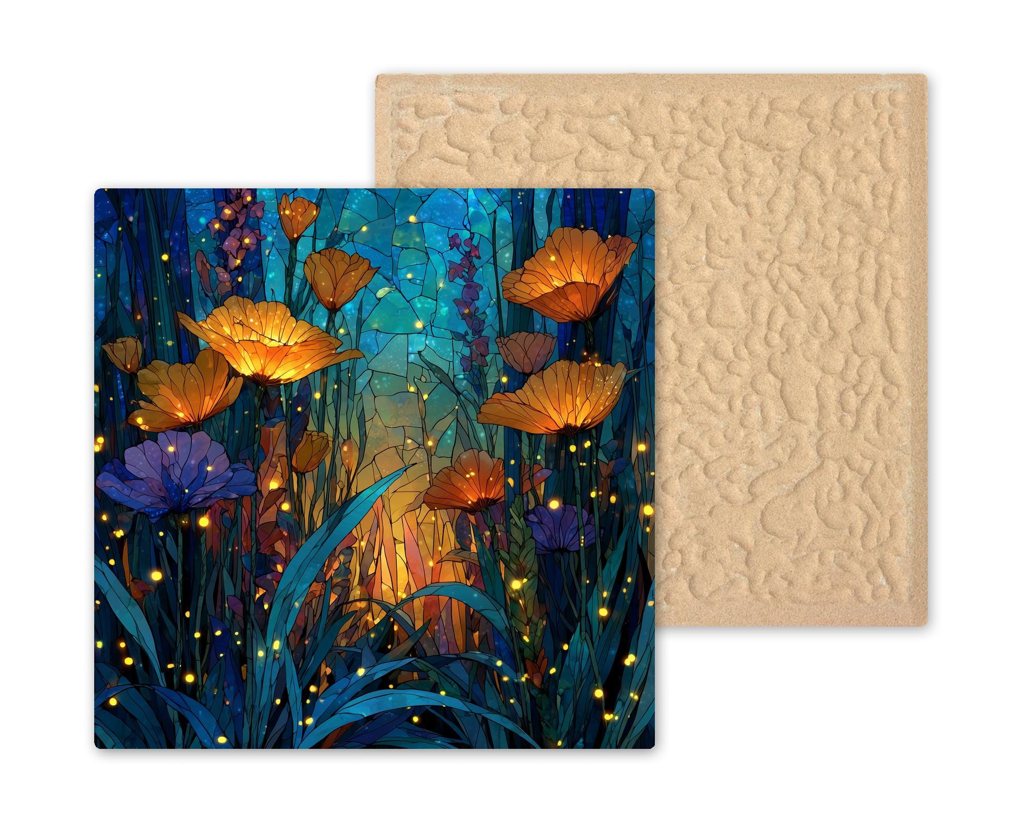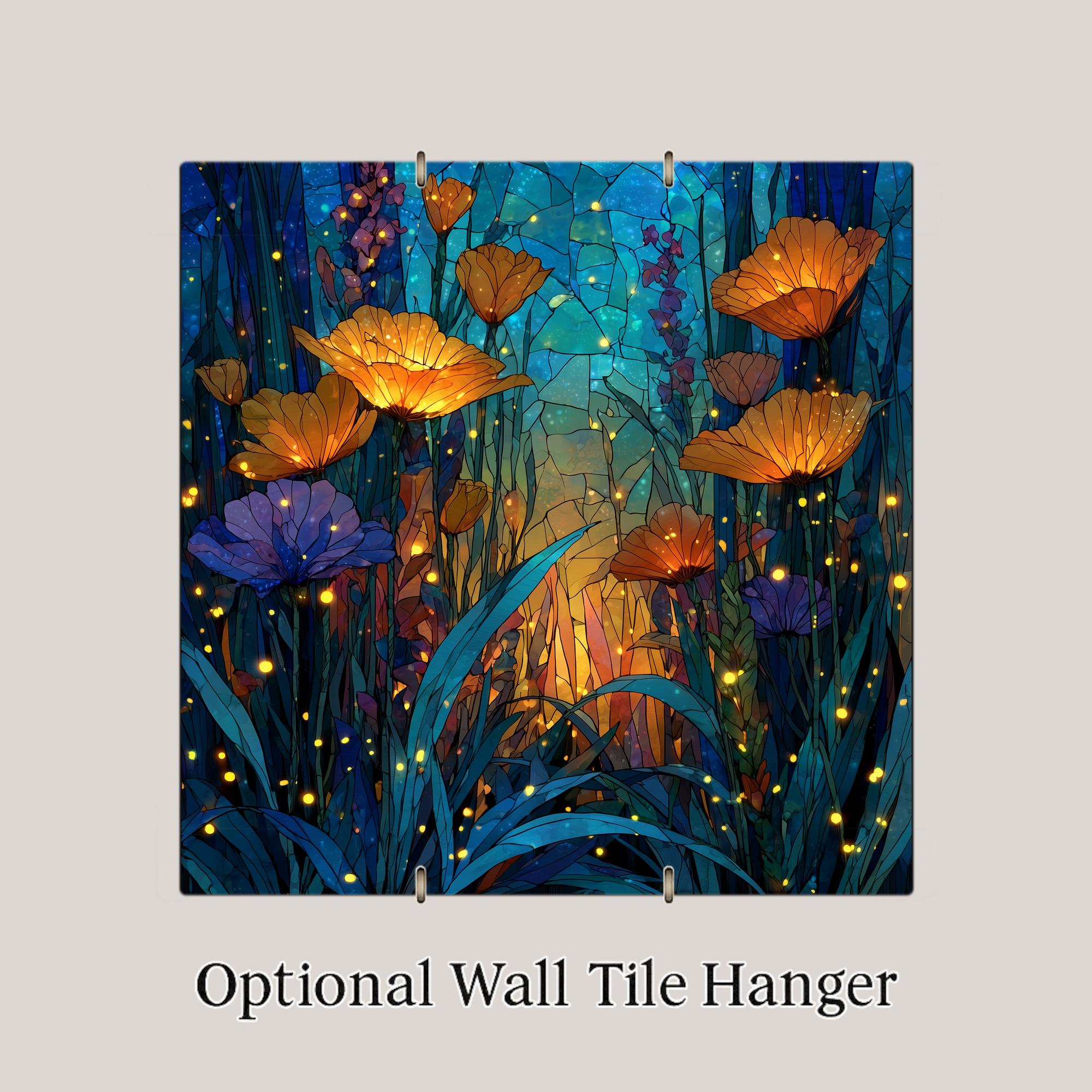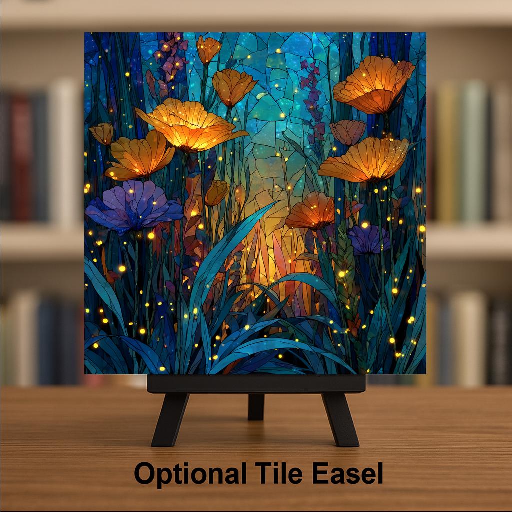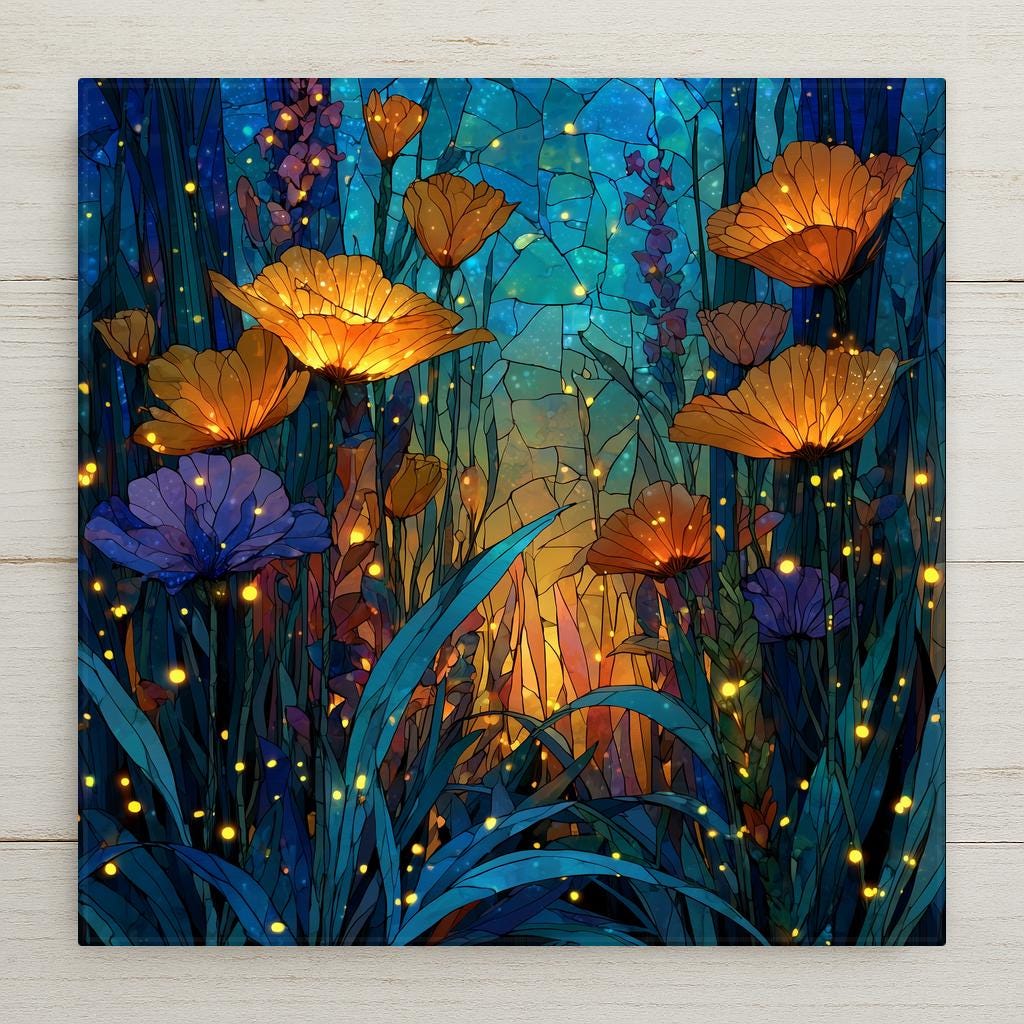 The poppy has always been a flower with emotional weight — a symbol of remembrance, of fragility, of beauty that burns briefly and brightly. In this tile that symbolic quality is amplified by the stained glass treatment and the firefly-lit midnight setting. The garden lover, the botanical collector, the person who tends a cottage garden or simply wishes they did — this is the tile that holds that feeling. It pairs naturally with the Mushroom Village tile from the same series, sharing the same luminous stained glass style and deep midnight palette for buyers who want both pieces on one wall.