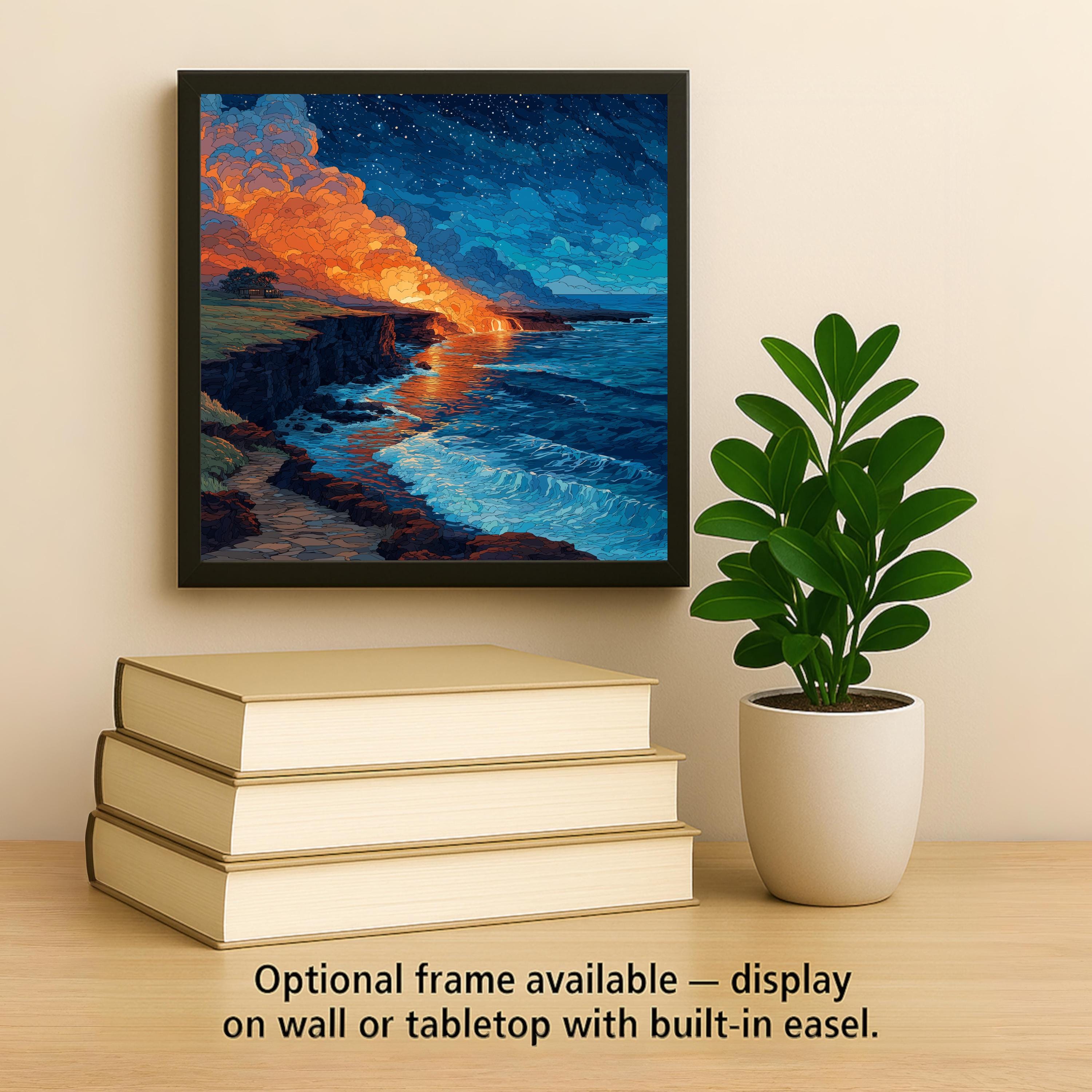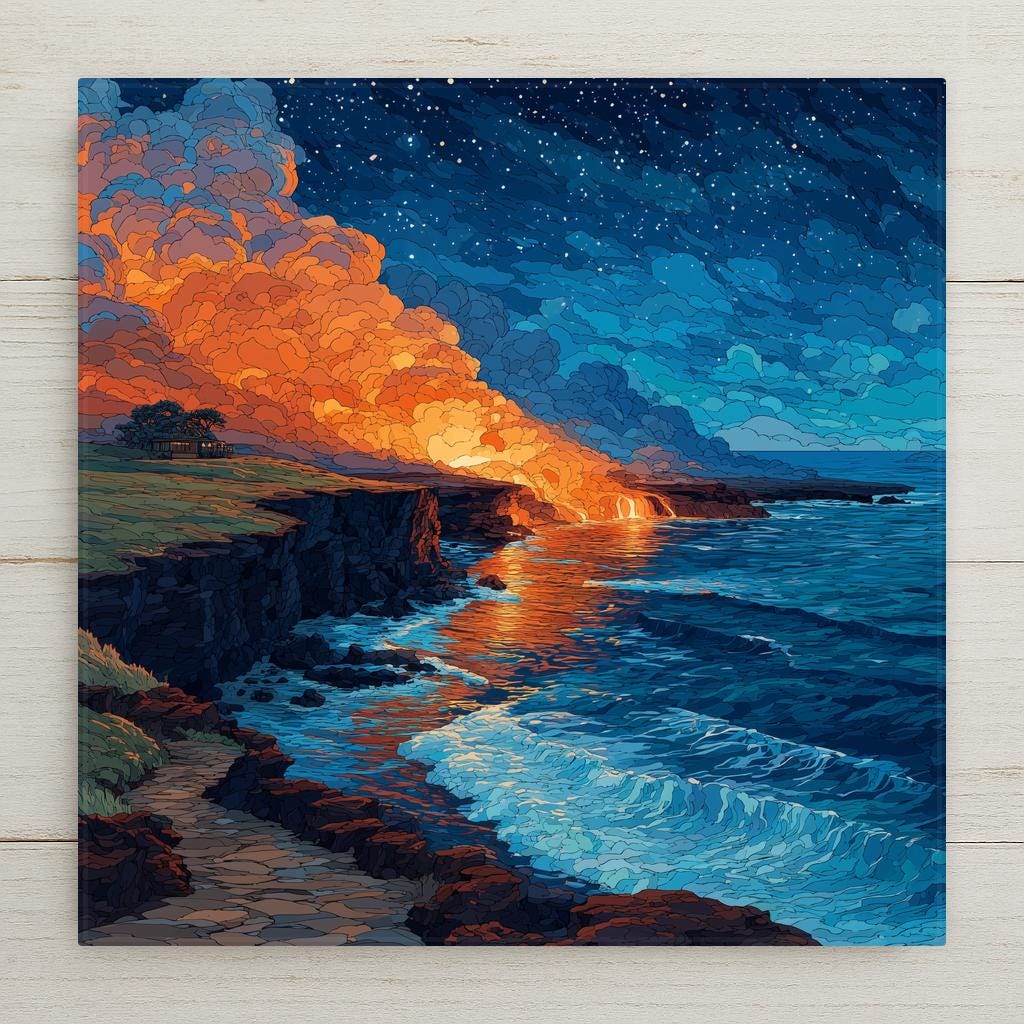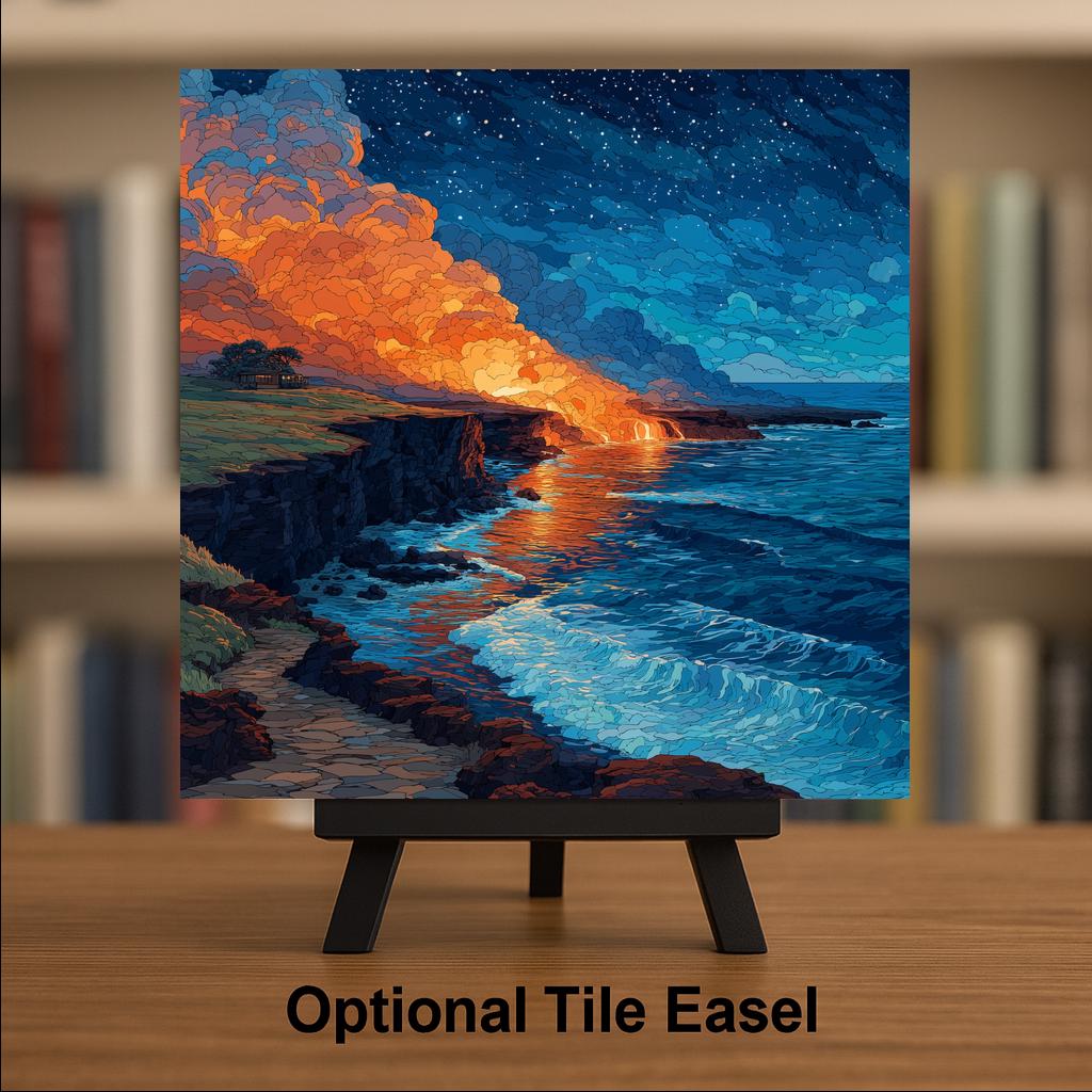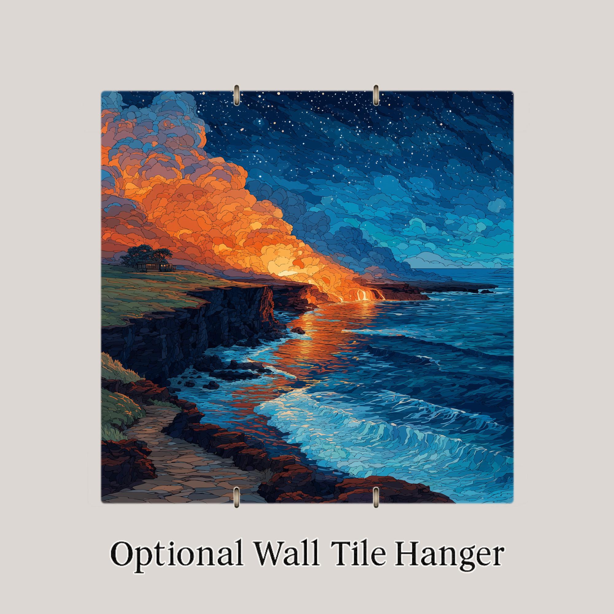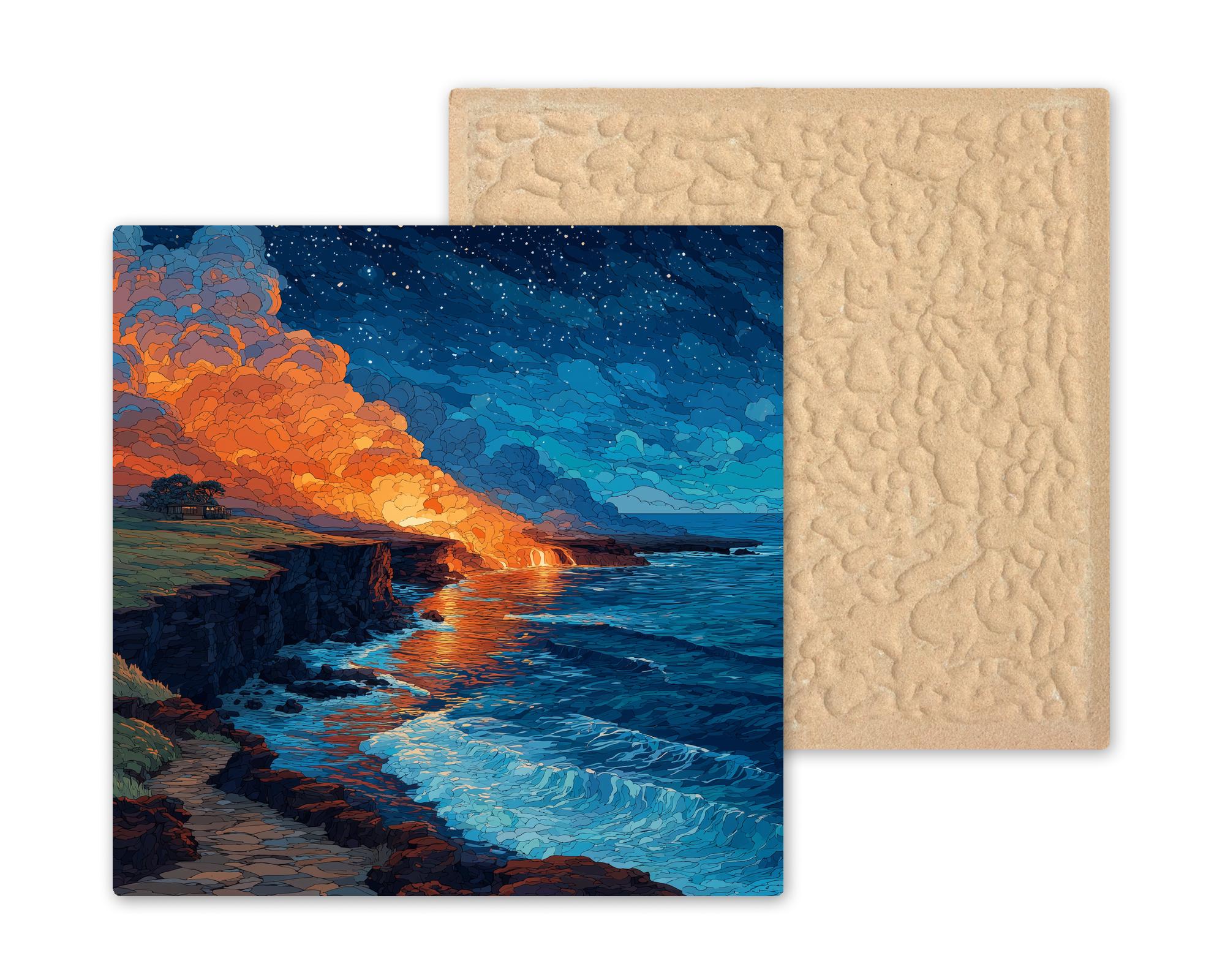 This tile brings that energy permanently into any space. It works for the Hawaii resident who grew up watching the volcano, the visitor who stood at the lava bench at the edge of the world, and the Big Island lover who needs something on their wall that no other state can offer. The contrast of glowing orange and deep Pacific blue is stunning on ceramic — a piece that commands attention in any room and answers to a very specific kind of Hawaii pride.